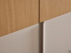 Portes : épaisseur 2,2 cm. Les portes Ocean sont composées d'un panneau inférieur d'une hauteur fixe de 110 cm et d'un panneau supérieur dont la hauteur varie en fonction de la hauteur de l'armoire : entre les deux panneaux se trouve un profil métallique horizontal assorti à la poignée intégrée courbée. Dans les modules à deux portes battantes, un cache-poussière en pvc à feuillure est installé sur la porte gauche.