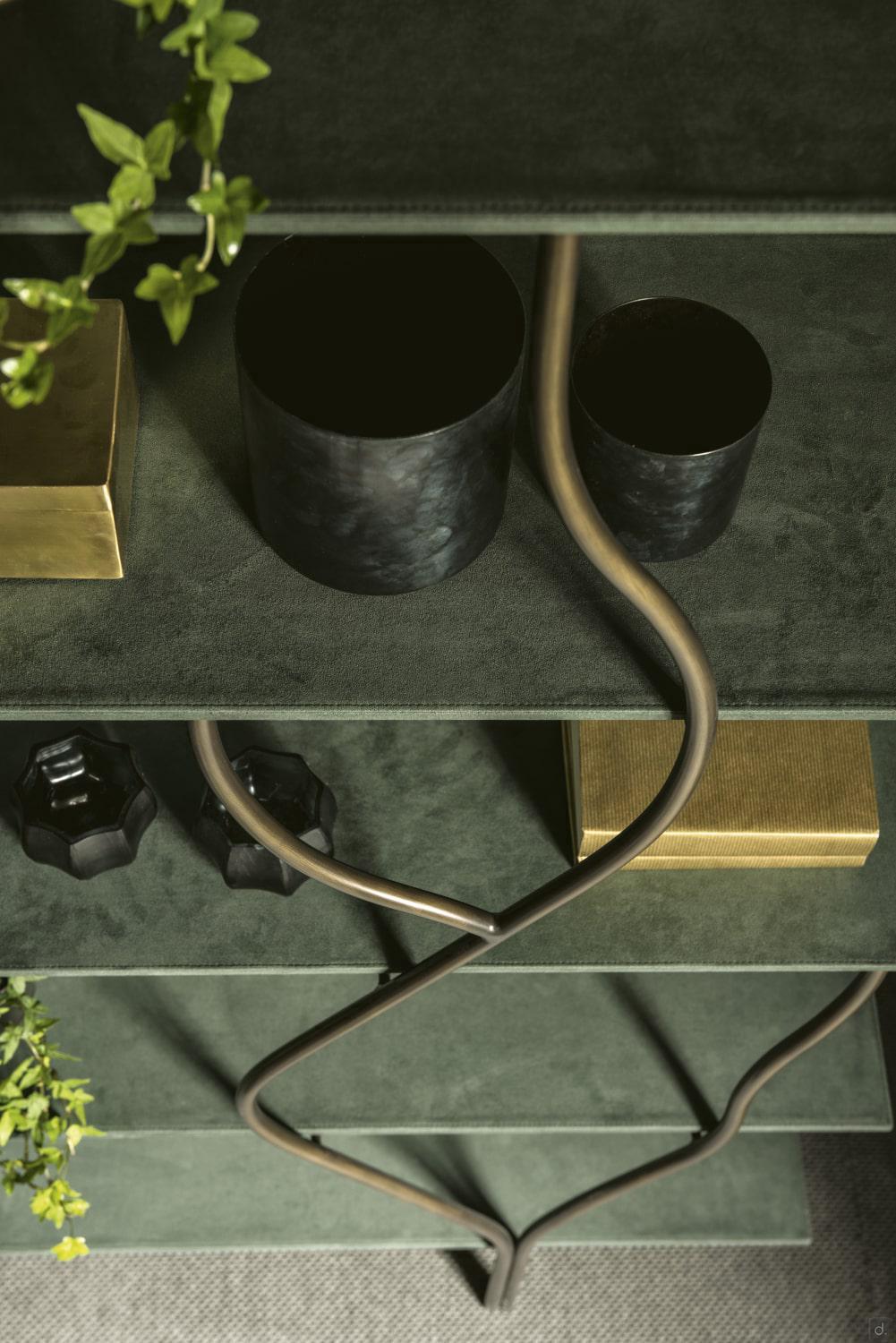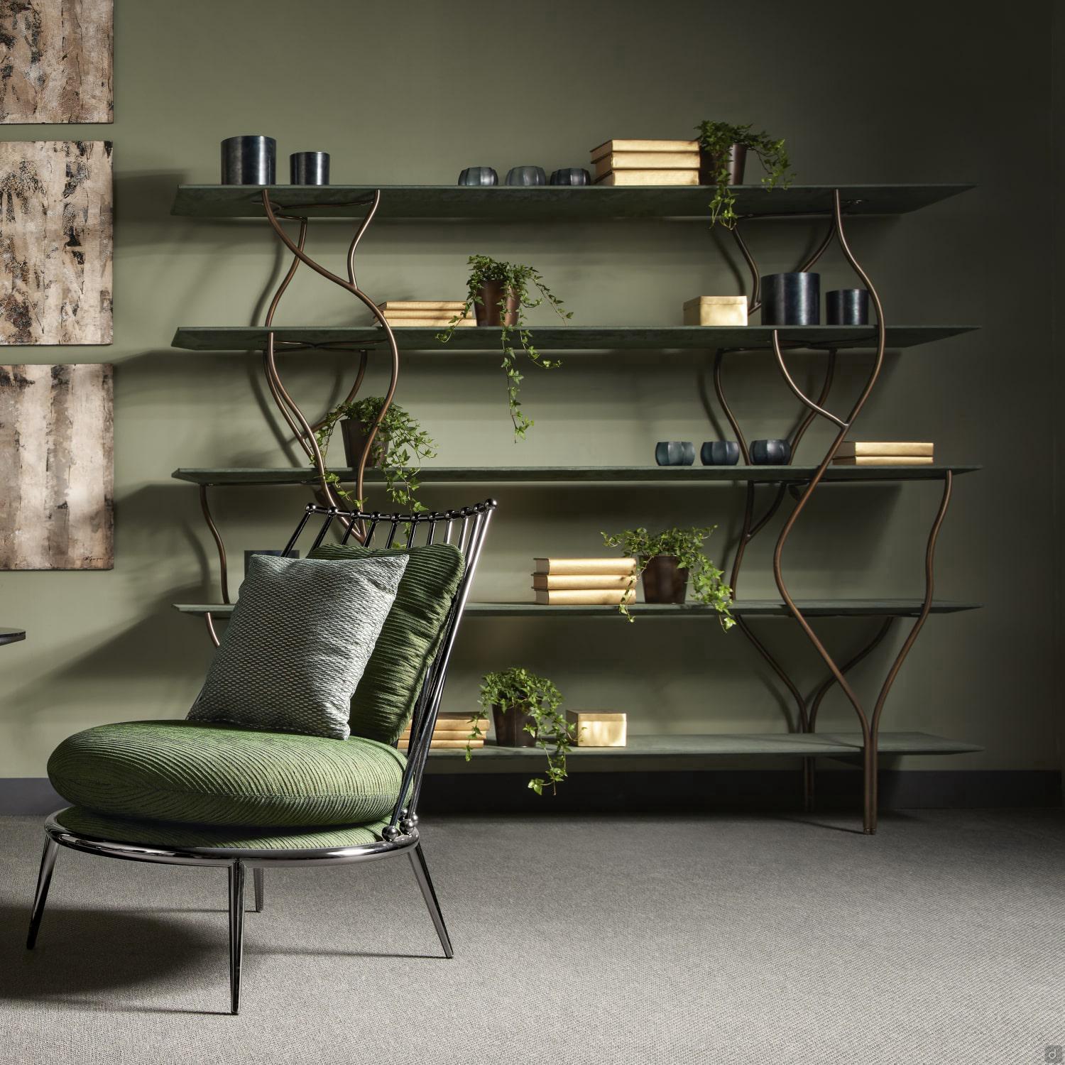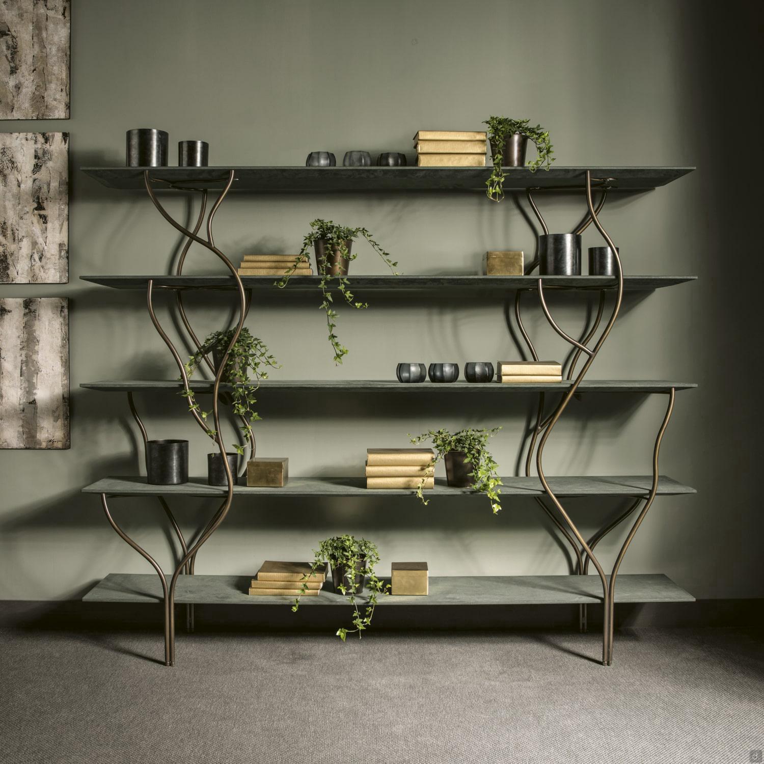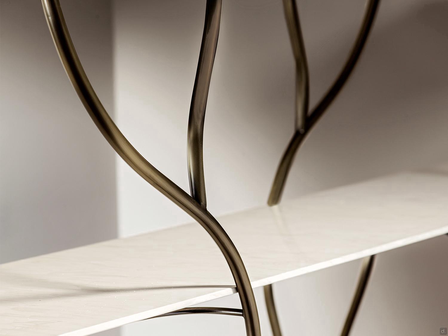 Albero de Cantori est une bibliothèque arbre design en métal haut de gamme à la forme originale, avec 5 étagères en tissu ou laquées, disponible en 200 ou 300 cm de large.Les montants ramifiés qui rappellent les branches d'une arbre ou une plante grimpante sont réalisés en fer courbé. Les finitions métalliques précieuses de la structure incluent la feuille argent ou cuivre, le fer patiné ou antique et le laquage mat. Le design des étagères permet d'accroître la légèreté visuelle de la bibliothèque : plus épaisses au centre pour offrir la solidité nécessaire, elles s'affinent vers les extrémités.