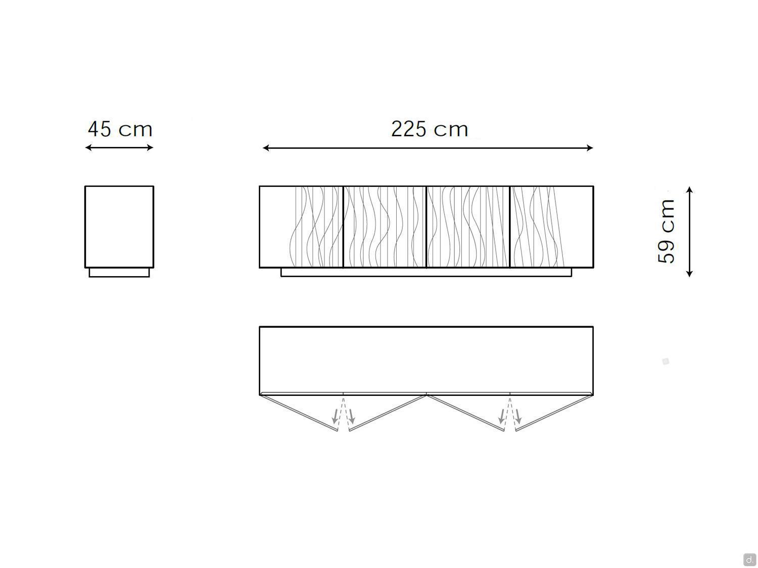 Modèle et DimensionsModèles :- 4 portes sur plinthe : L.225 x P.45 cm- 4 portes sur pieds : L.225 x P.45 cmHauteur :- 59 cm (avec plinthe H.5,5)- 71 cm (avec pieds H.17,7)Matériaux et FinitionsCorps et Portes :- bois laquéPieds :- métal peintInformations pour votre AchatLes deux modèles sont livrés en standard avec 2 étagères.L capacité de charge maximale pour chaque étagère intérieure est de 10 kg.