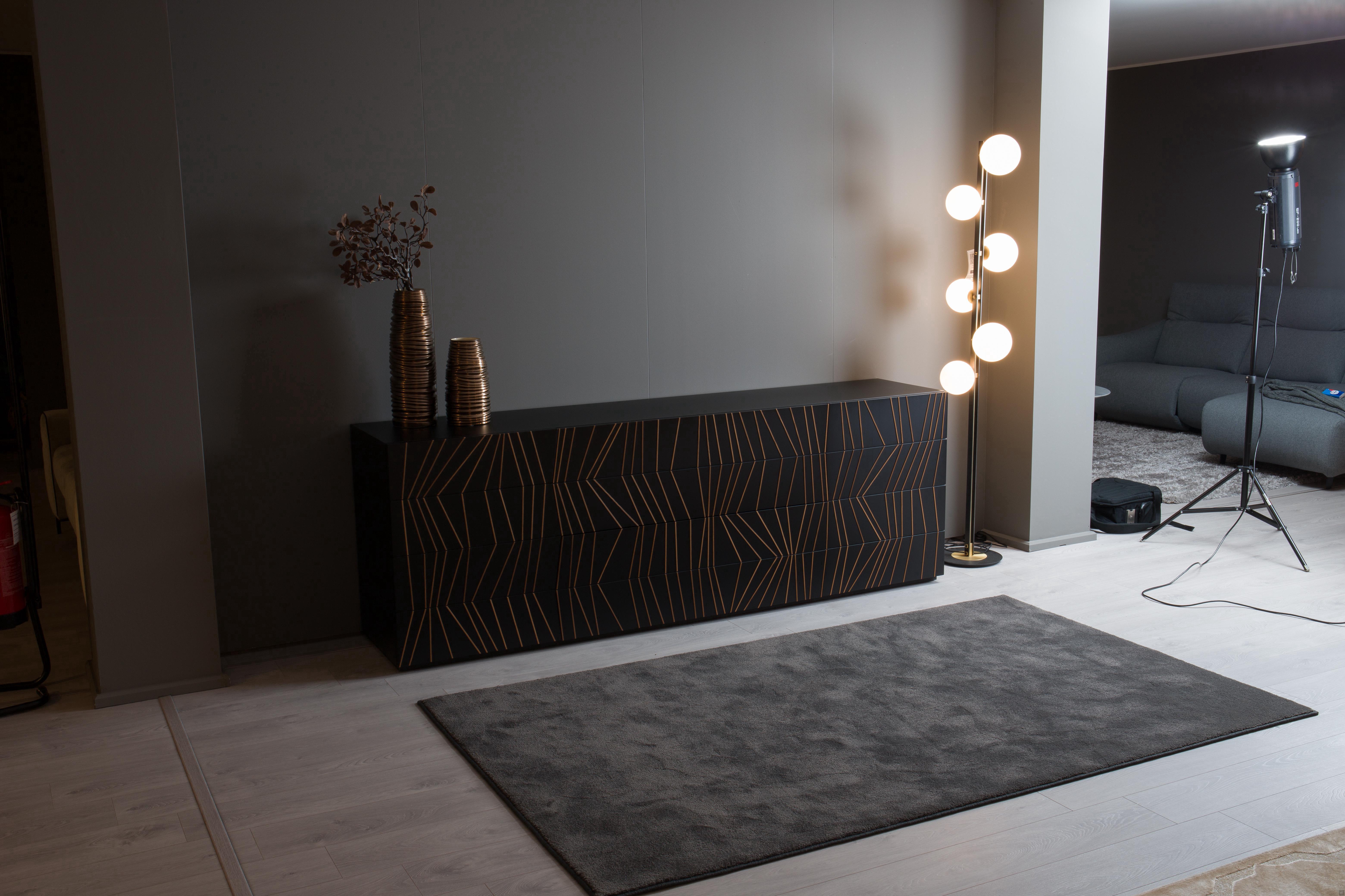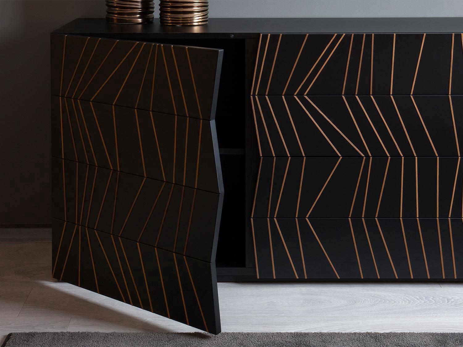 Ramses outlet est un buffet design en laqué noir mat avec des inserts en bois massif, dont l'essence crée un contraste agréable avec les façades et la structure en laque lisse. Les inserts en bois massif sont positionnés manuellement par des artisans qualifiés à l'intérieur des fraisages des portes et des tiroirs : les inserts, avec leur orientation en zigzag avec des inclinaisons croissantes, donnent au buffet son design incomparable dominé par l'agréable sensation de mouvement.Le buffet de sortie Ramses est disponible dans la version avec deux portes latérales battantes et deux grands paniers centraux, idéaux pour offrir une excellente capacité de rangement.Cet accessoire d'ameublement représente le choix idéal pour ceux qui souhaitent embellir leur salle de séjour avec un élément de design original et intemporel.