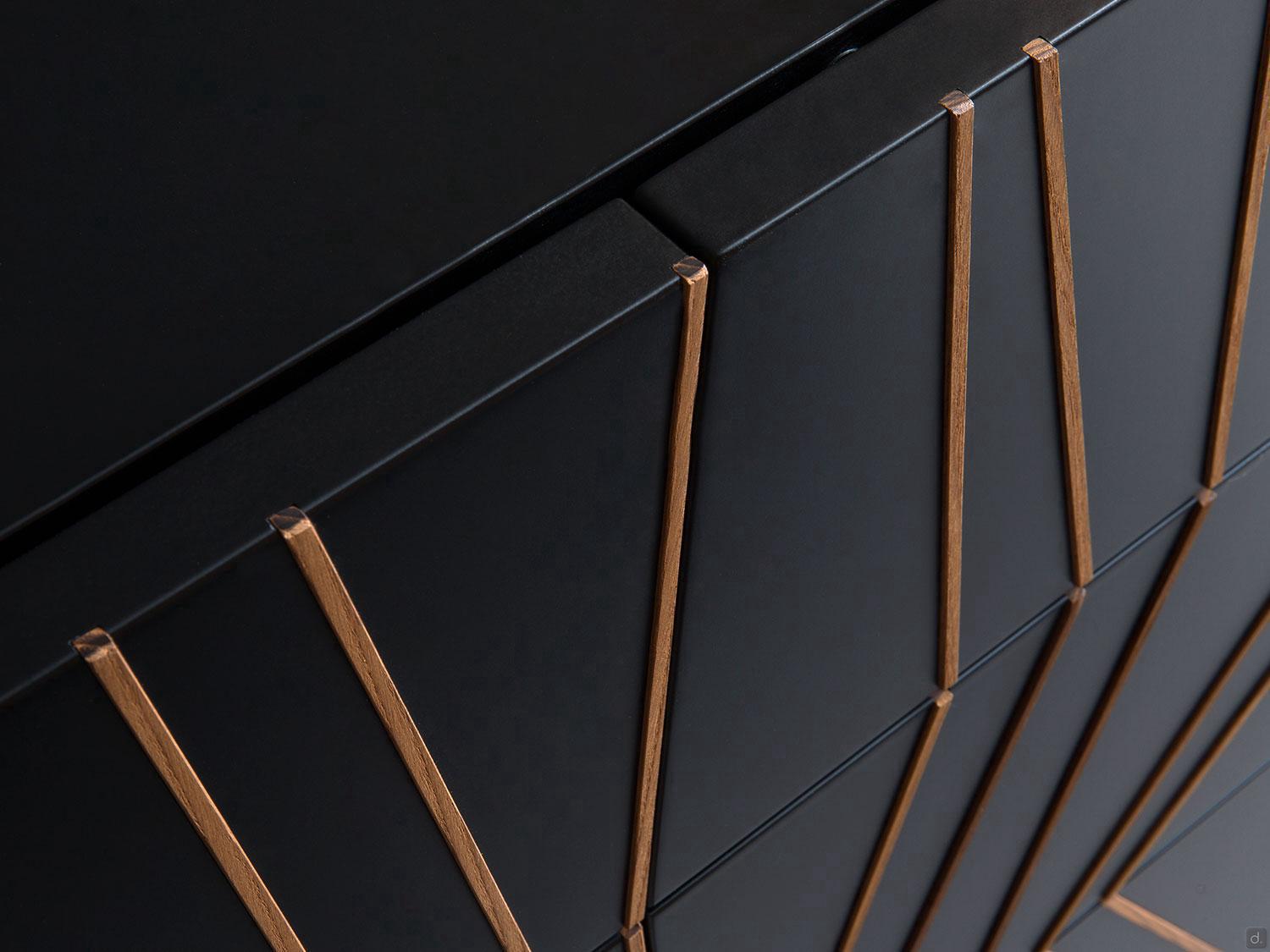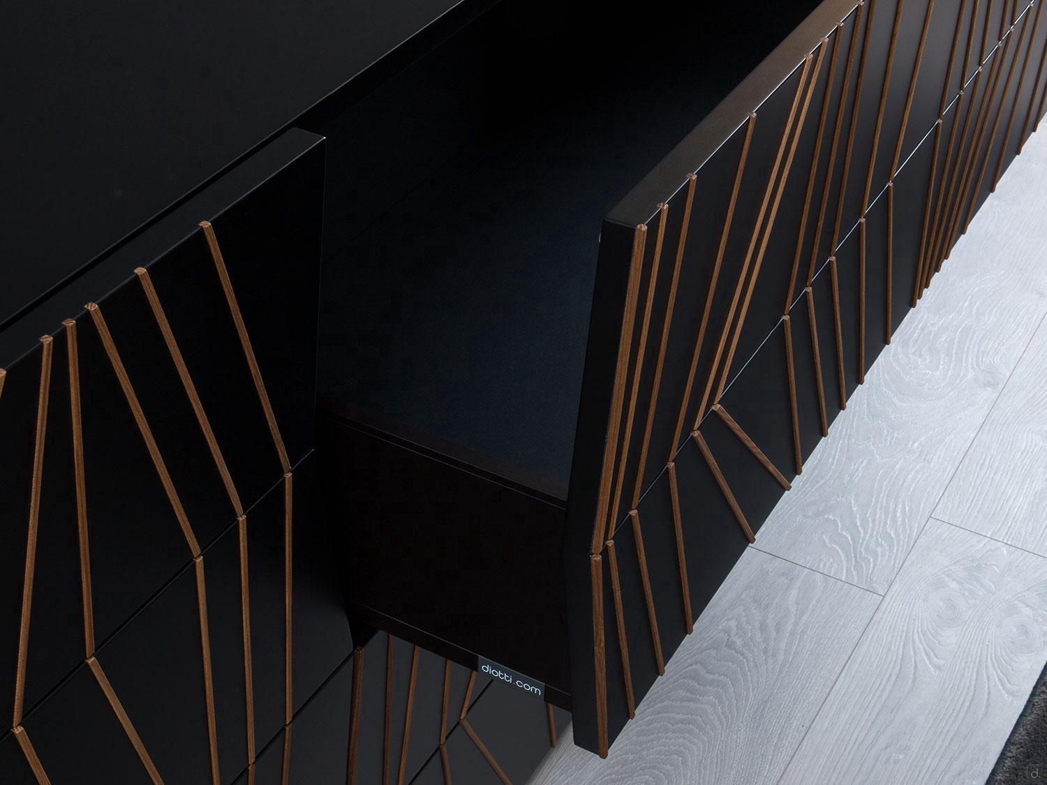 Dimensions- cm 240 p.50,5 h.82 Matériaux et finitions- Structure et façades : noir laqué mat- Inserts frontaux : bois massif- Intérieur : noir laqué mat