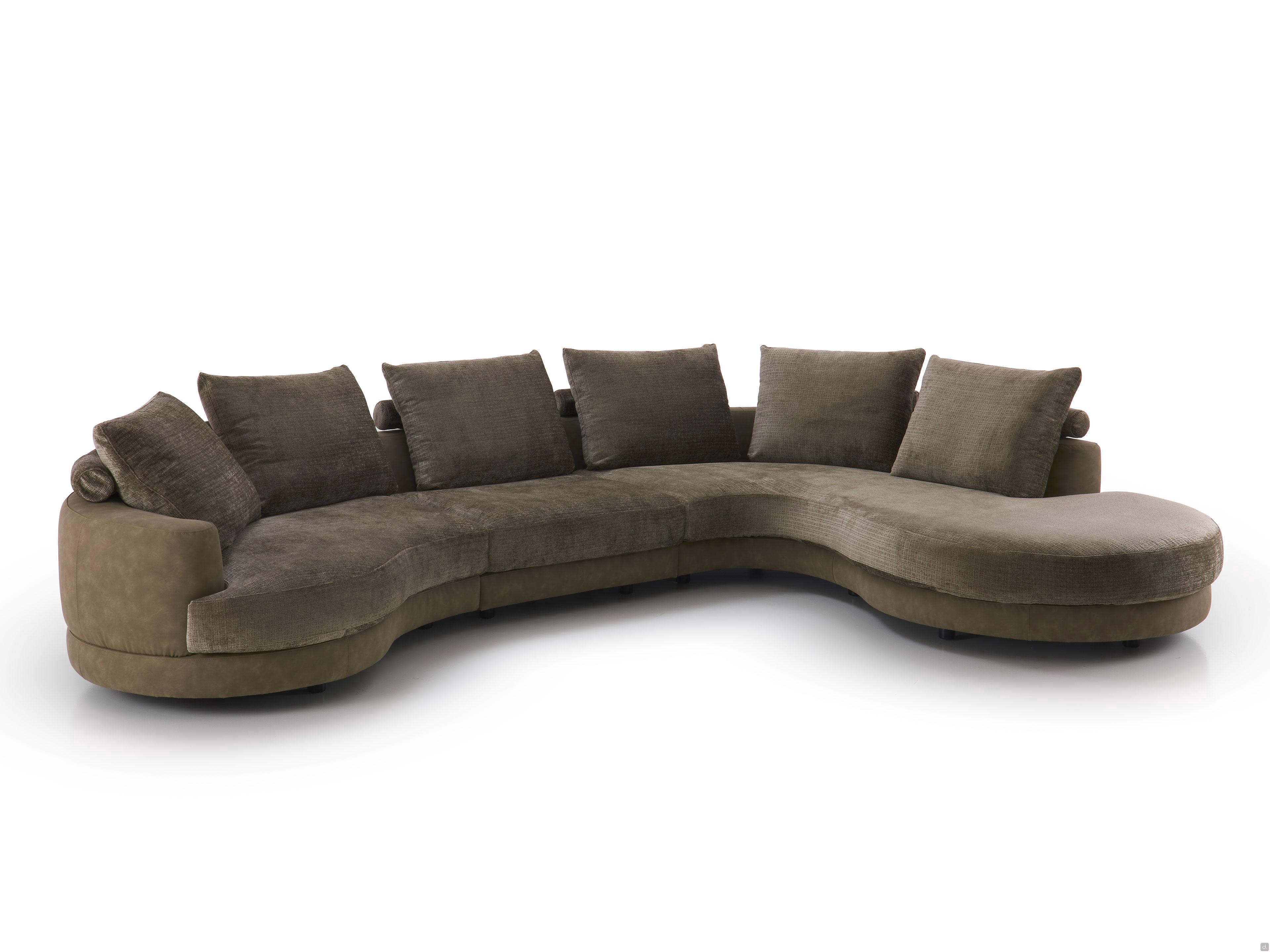 Cancun est un canapé d'angle incurvé design qui se caractérise par sa forme et ses lignes douces et sinueuses. Les éléments disponibles peuvent être combinés pour créer différentes solutions de composition, toutes positionnées soit contre le mur, soit au centre de la pièce : canapé linéaire avec modules d'extrémité incurvés, canapé d'angle incurvé à la fois symétrique et asymétrique, ou canapé d'angle avec péninsule méridienne façonnée.