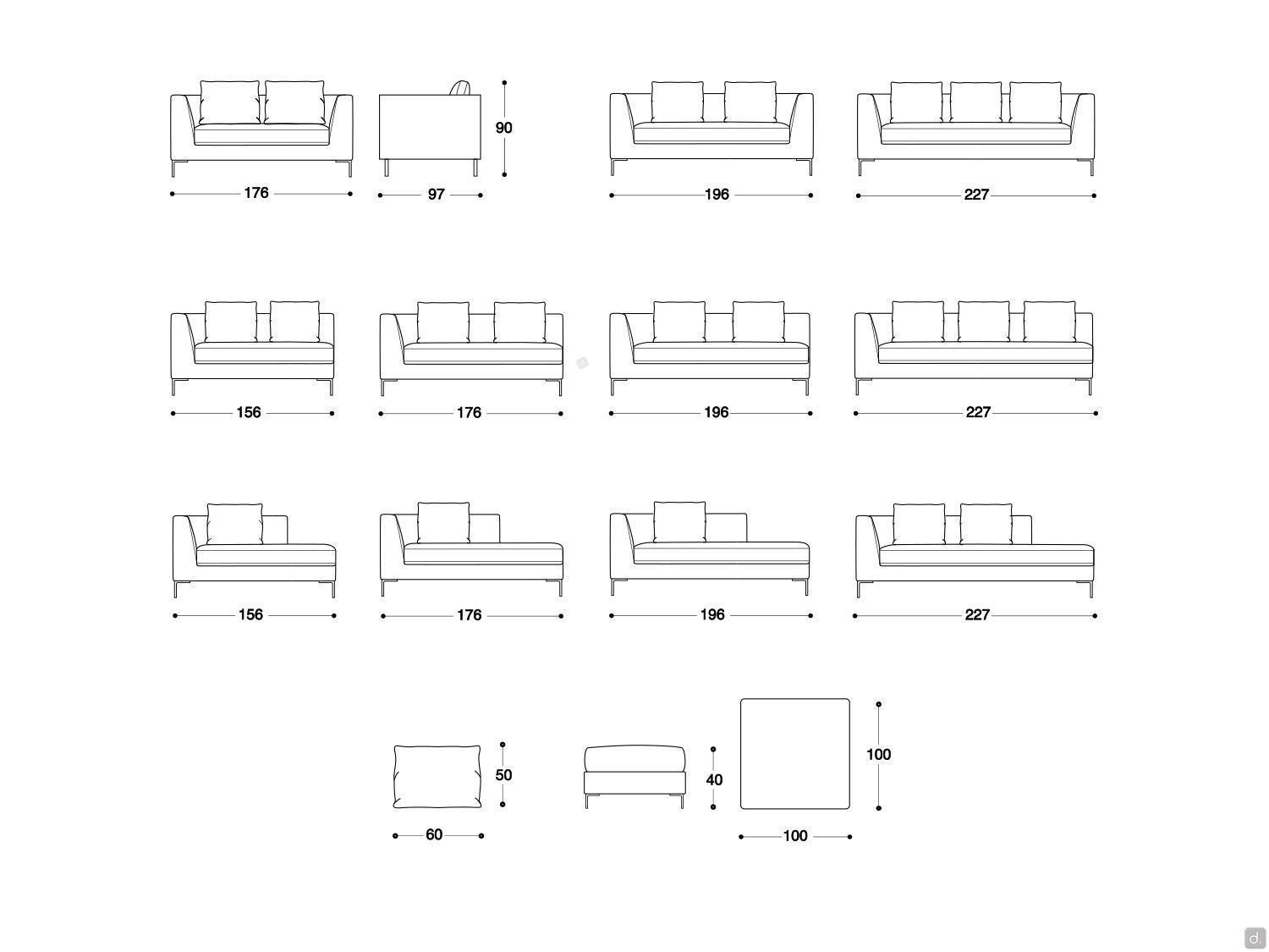 Modéle et DimensionsVisualiser les éléments et dimensions disponibles sur le ConfigurateurLargeur:- acocudoirs: cm 20Profondeur:- canapé: cm 97- assise: cm 55Hauteur:- canapé: cm 90- dossier / accoudoir: cm 75- assise: cm 40- pieds: cm 18