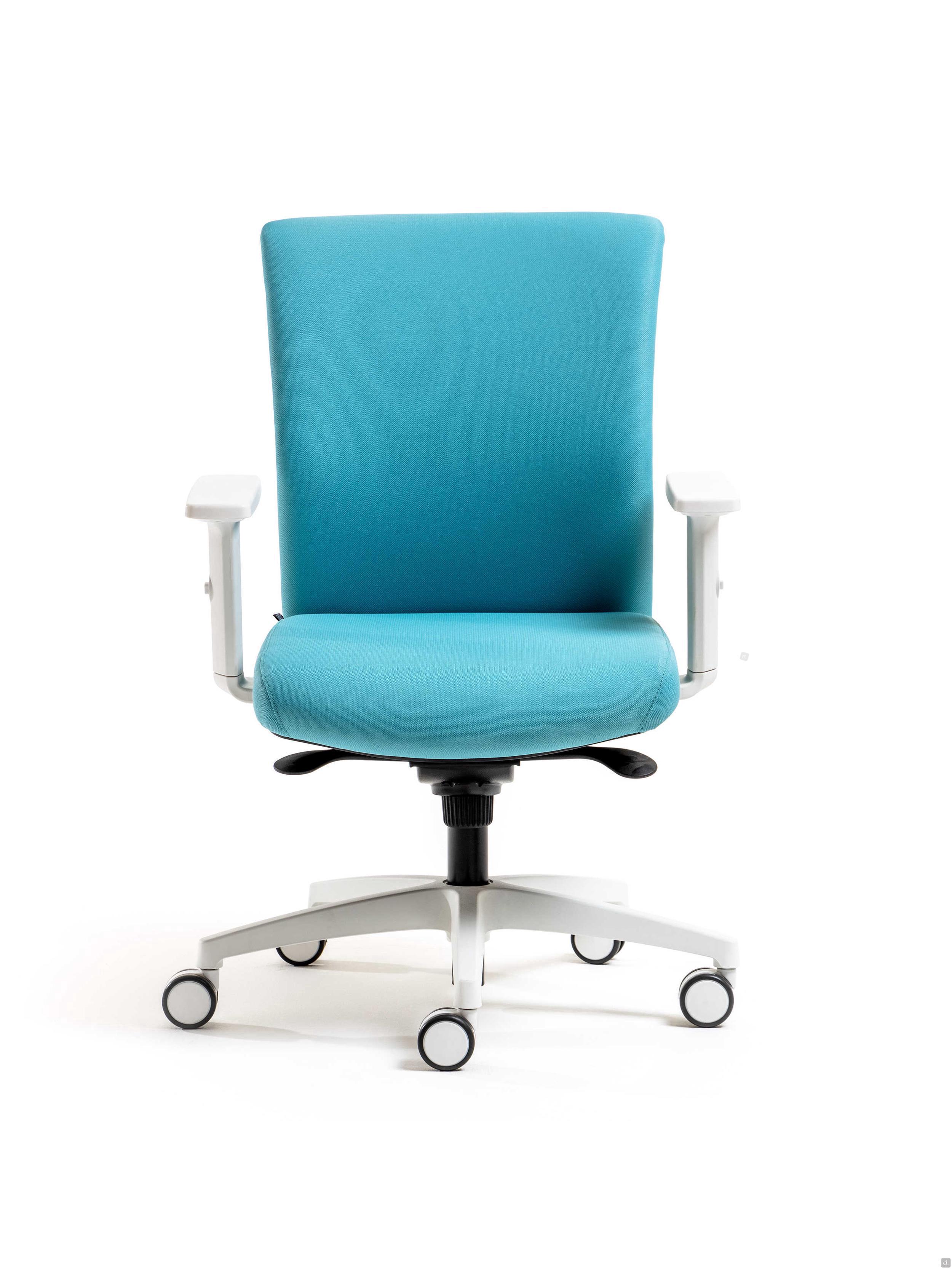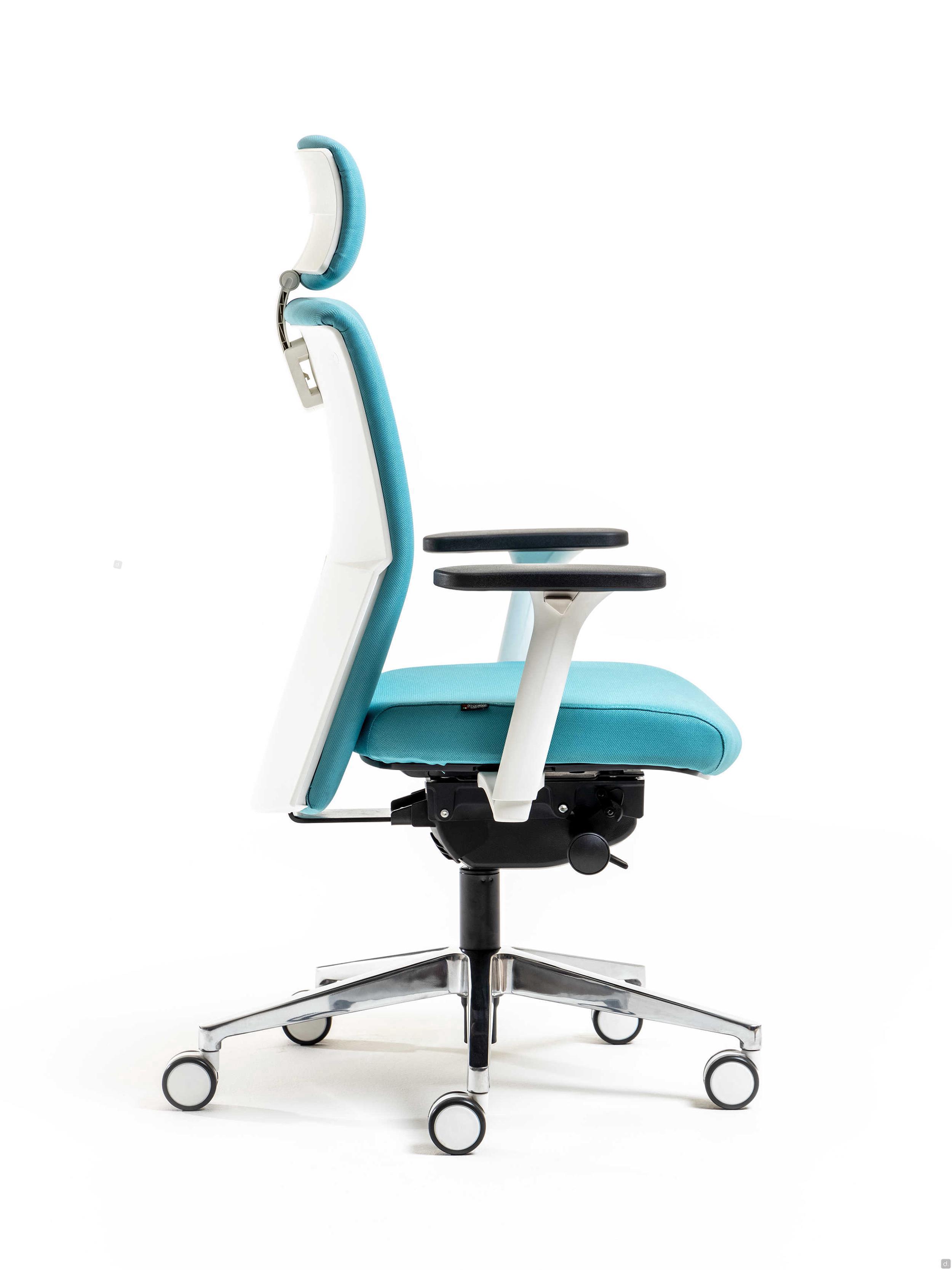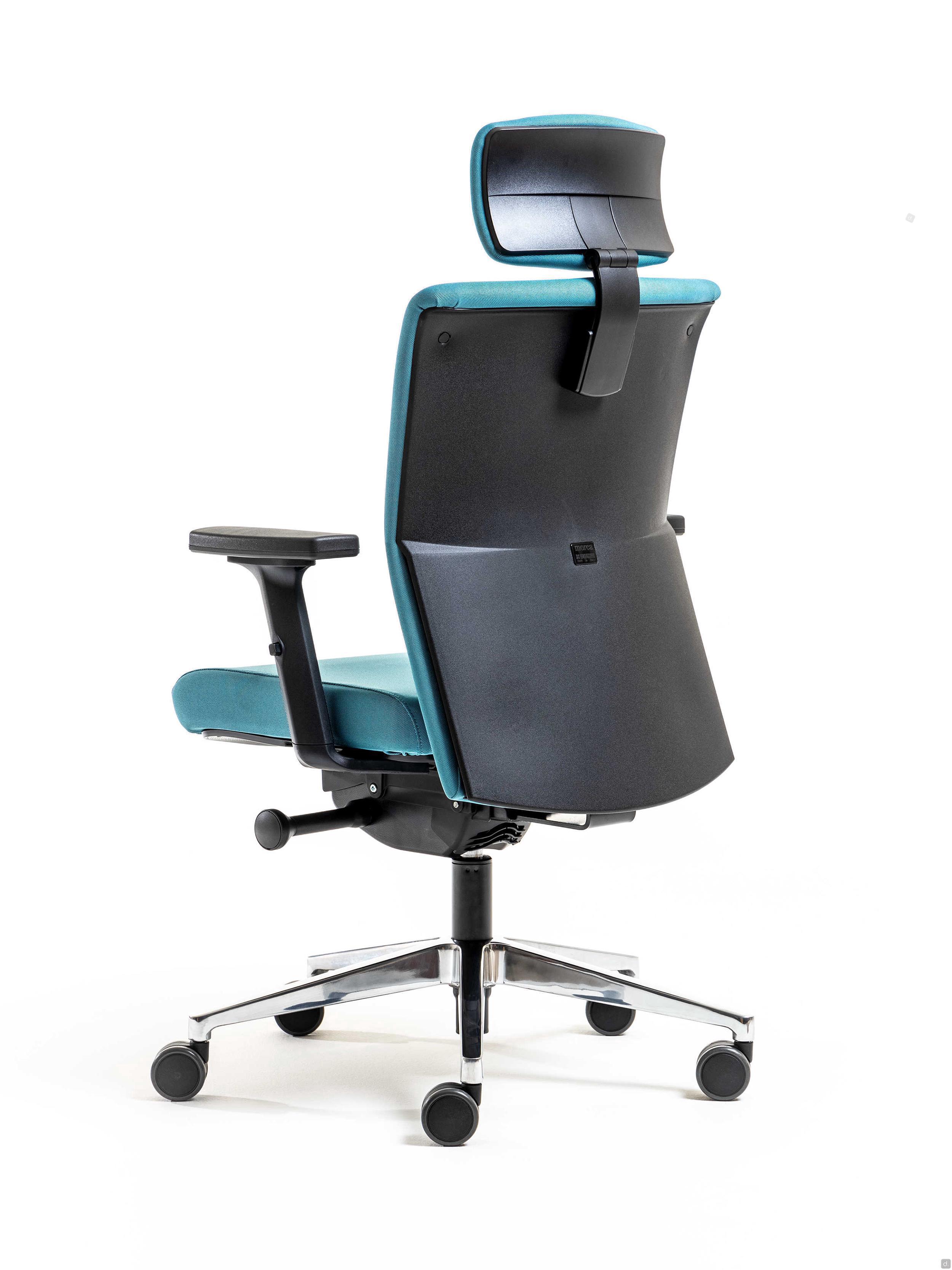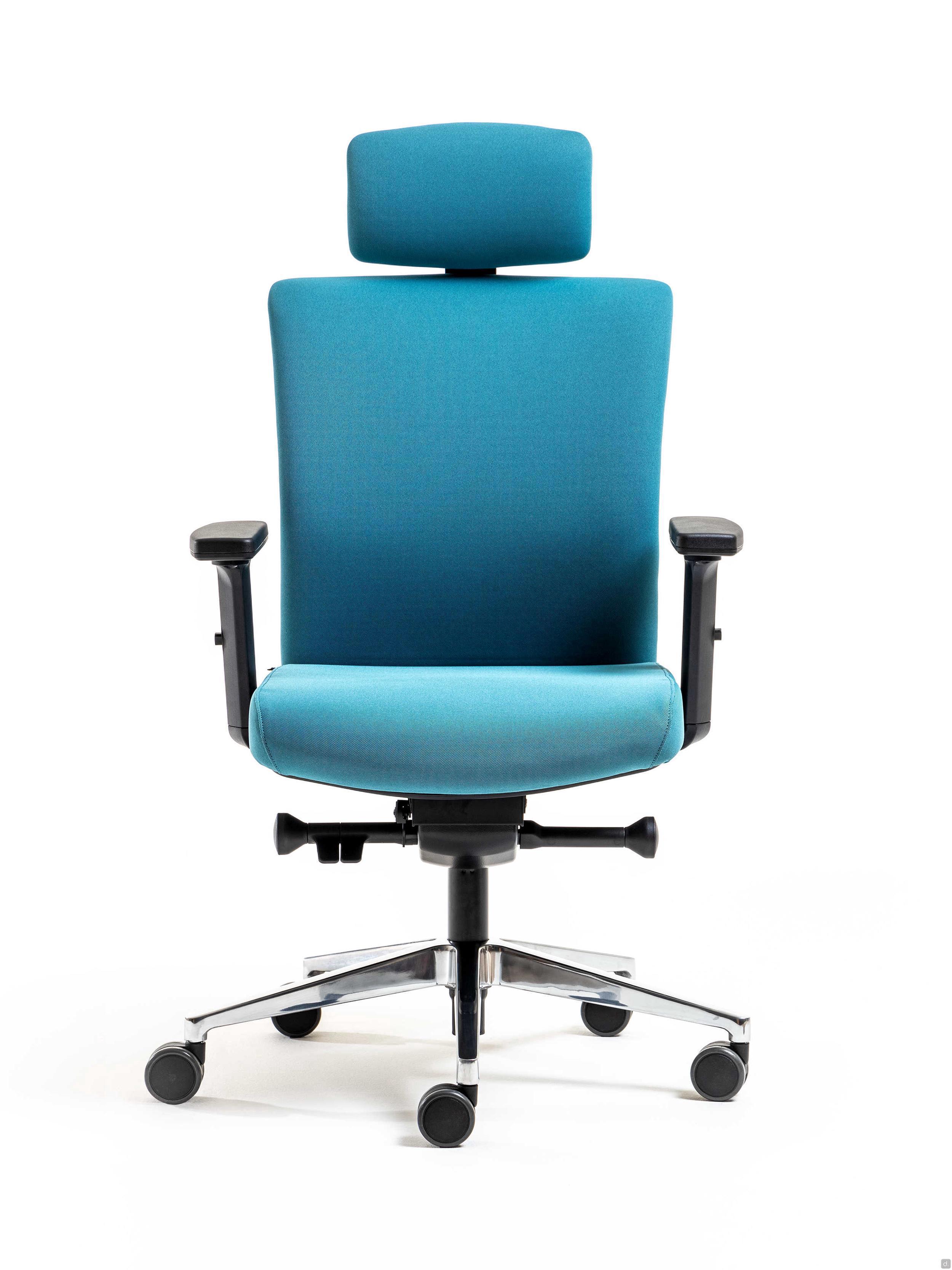 Chaise de bureau avec appui-tête réglable Steve disponible avec différents modèles d'accoudoirs. Egalement en version sans accoudoirs et sans appui-tête.