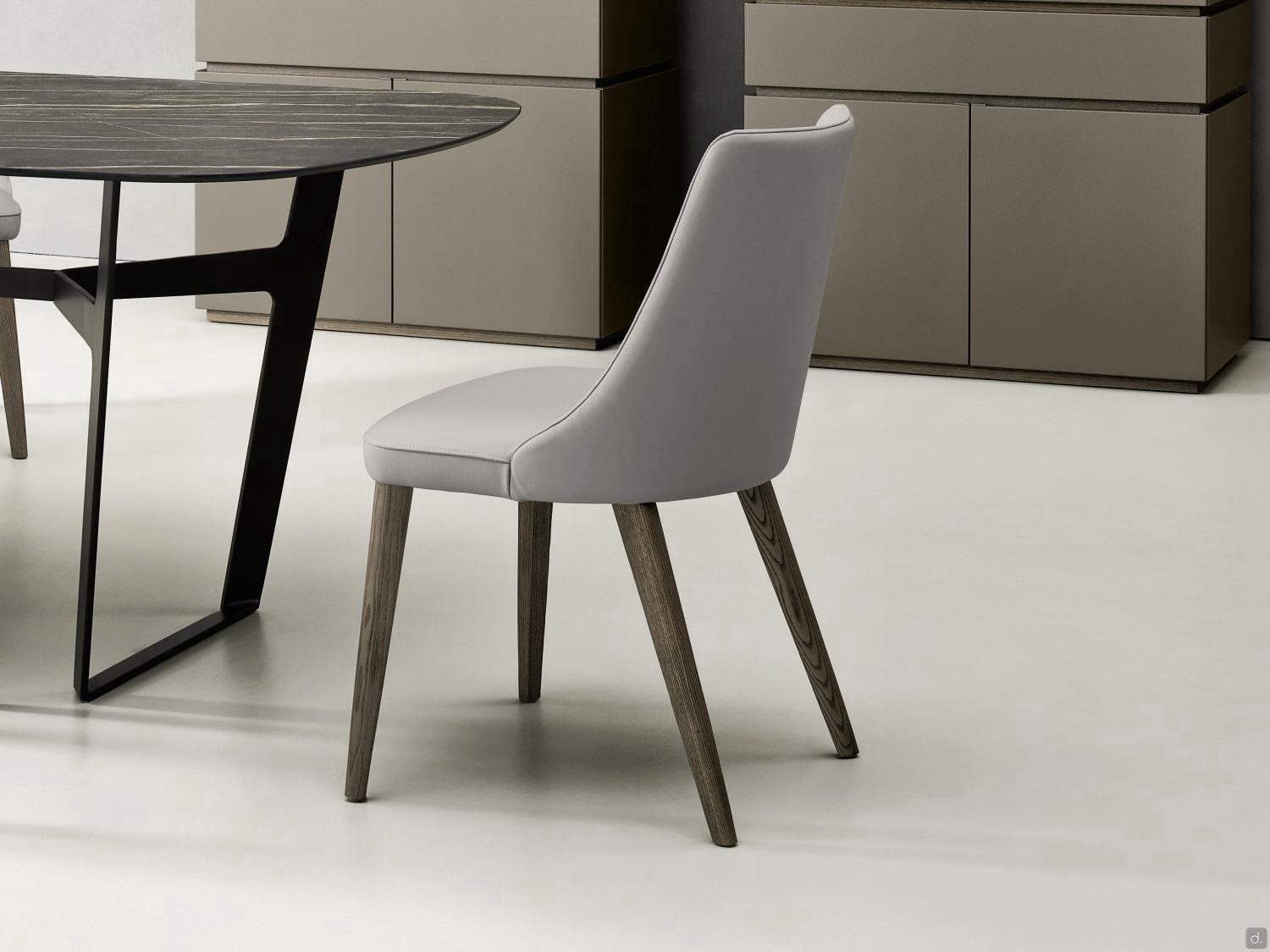Chaise Laura en cuir et bois, disponible également avec revêtement en tissu ou similicuir, disponible en version avec et sans accoudoirs