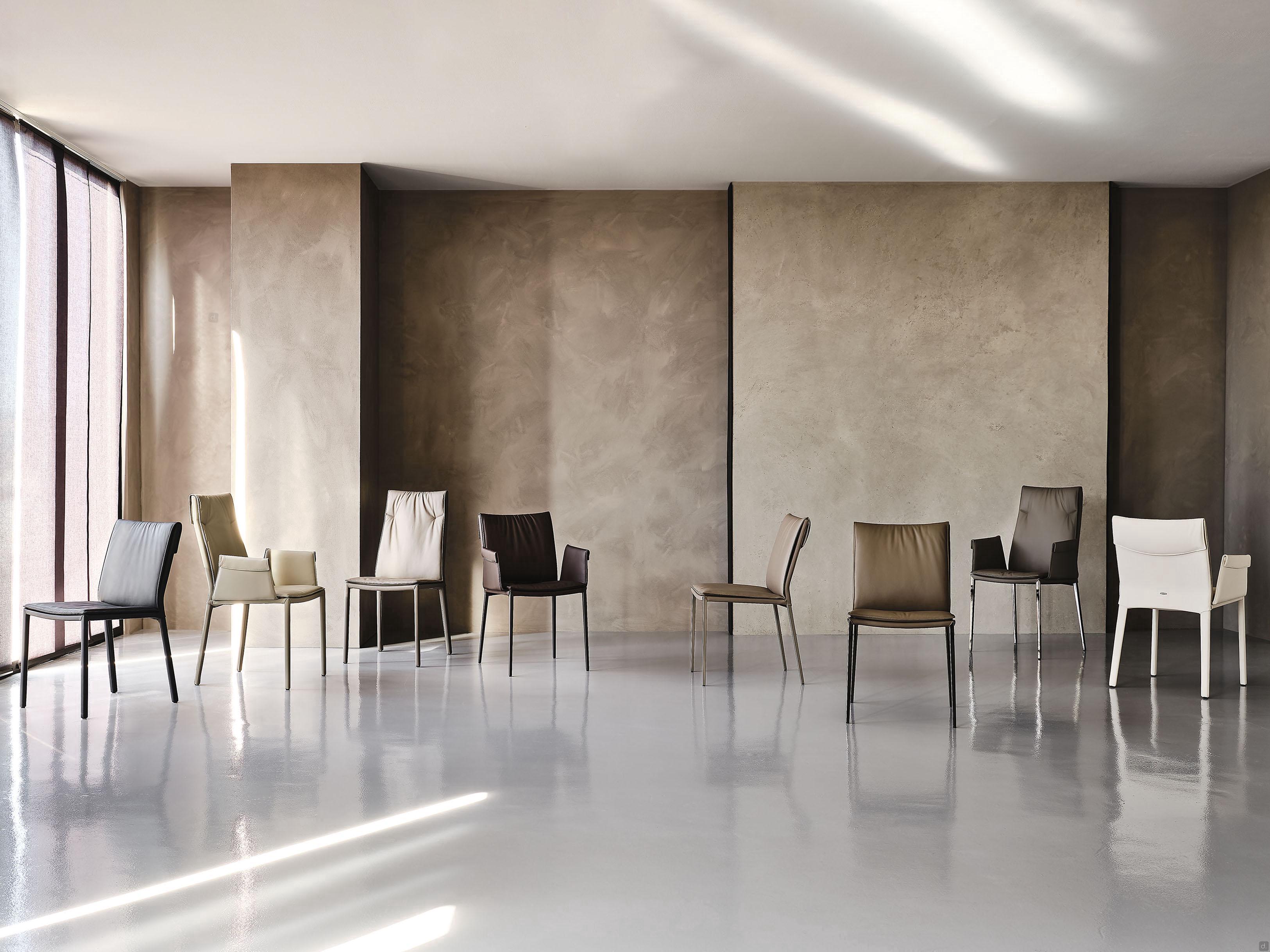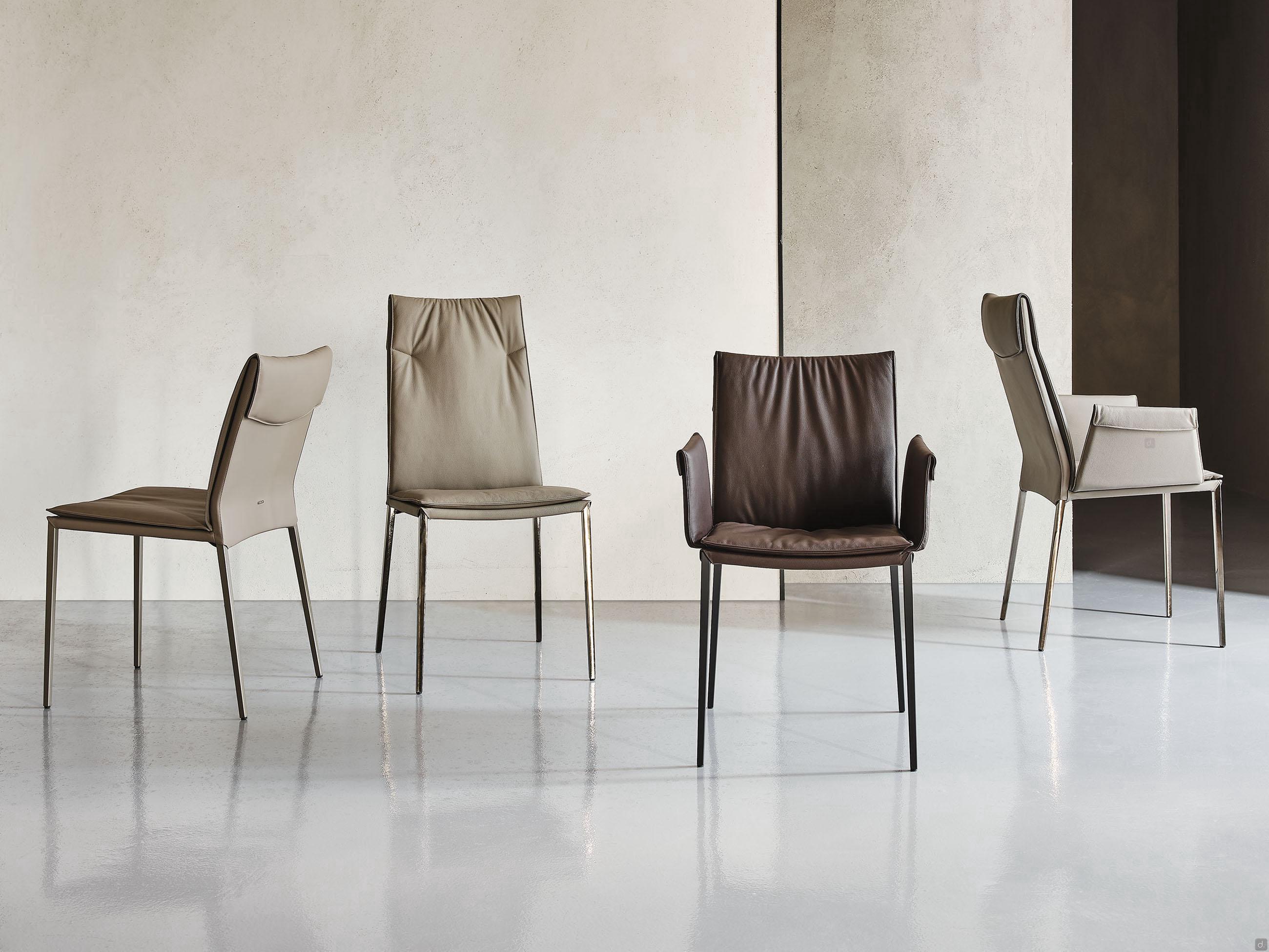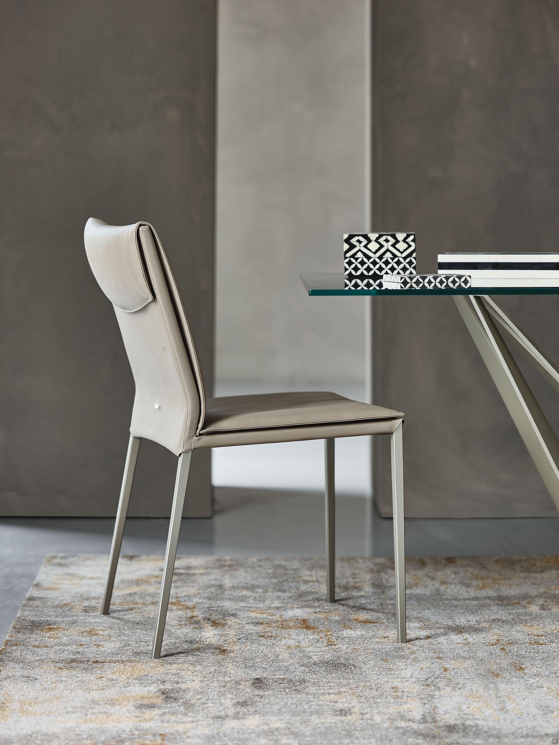 Isabel de Cattelan est une chaise en cuir mince avec coussin revêtu. La structure peut être soit en acier soit revêtue comme le dossier et l'assise en tissu, de cuir ou similicuir. La structure rigide est dotée d'un coussin avec surpiqûre qui confère un grand confort à l'assise et au dossier qui présente un élégant rabat vers l'arrière. Avec son design élégant Isabel s'adapte parfaitement à des séjours modernes et des tables au design raffiné. Grâce aux nombreux coloris disponibles, elle s'intègre facilement dans n'importe quel type d'intérieur.