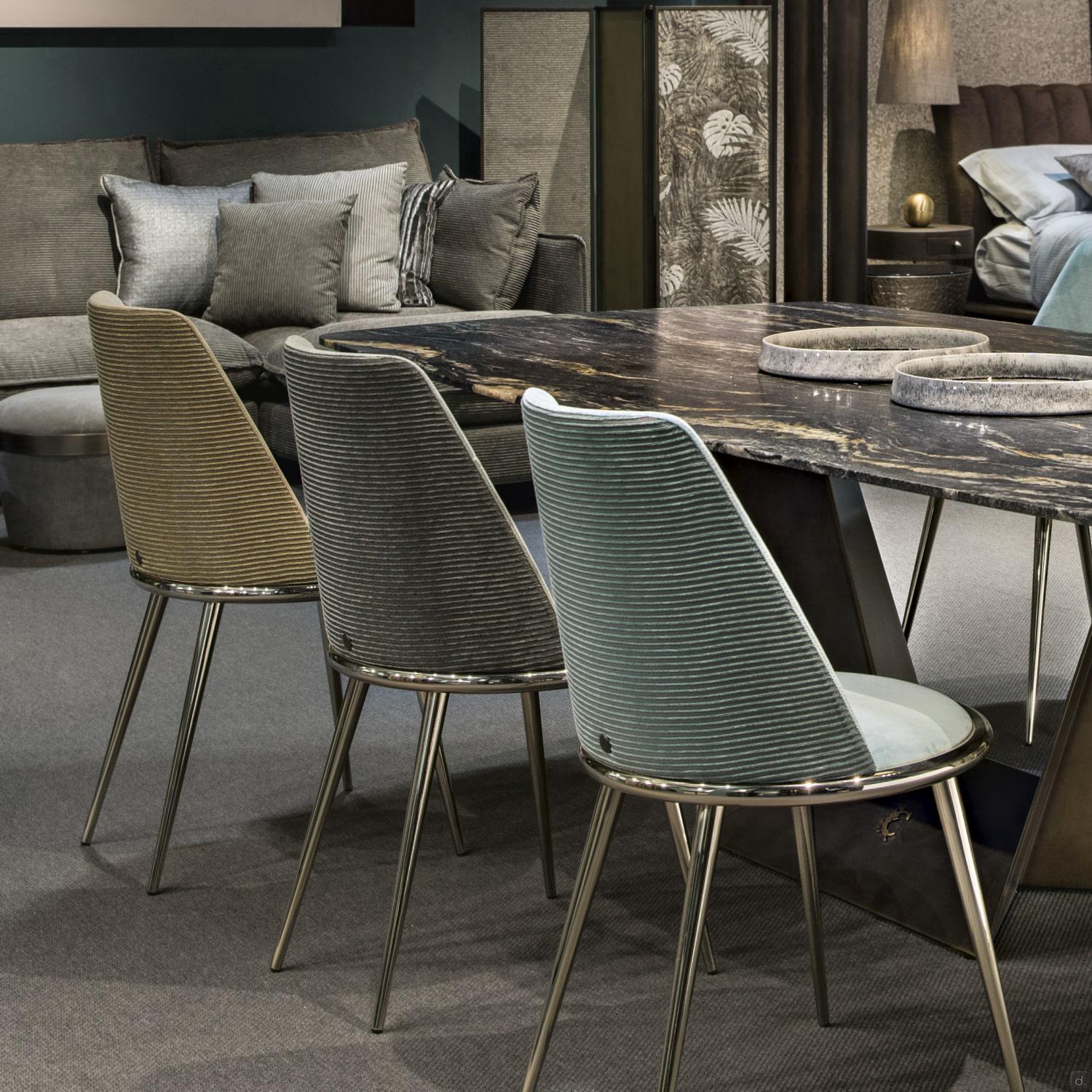 Aurora de Cantori est une chaise en métal avec assise rembourrée et revêtue de tissu, velours, cuir mince et simili cuir, disponible avec dossier rembourré ou à barreaux.Dans les deux cas les pieds sont en fer modelé à froid en forme de cône et finis dans un bain galvanique. Les tiges métalliques qui forment le dossier sont montées à l'aide de tirants internes, un processus qui permet d'éliminer les soudures visibles pour une majeure uniformité visuelle et structurelle. L'assise et le dossier rembourrés ont une structure en bois, qui est revêtue de caoutchouc bi-densité.Une chaise luxueuse parfaite pour la salle à manger ou conjugué à un élégant bureau pour la chambre.
