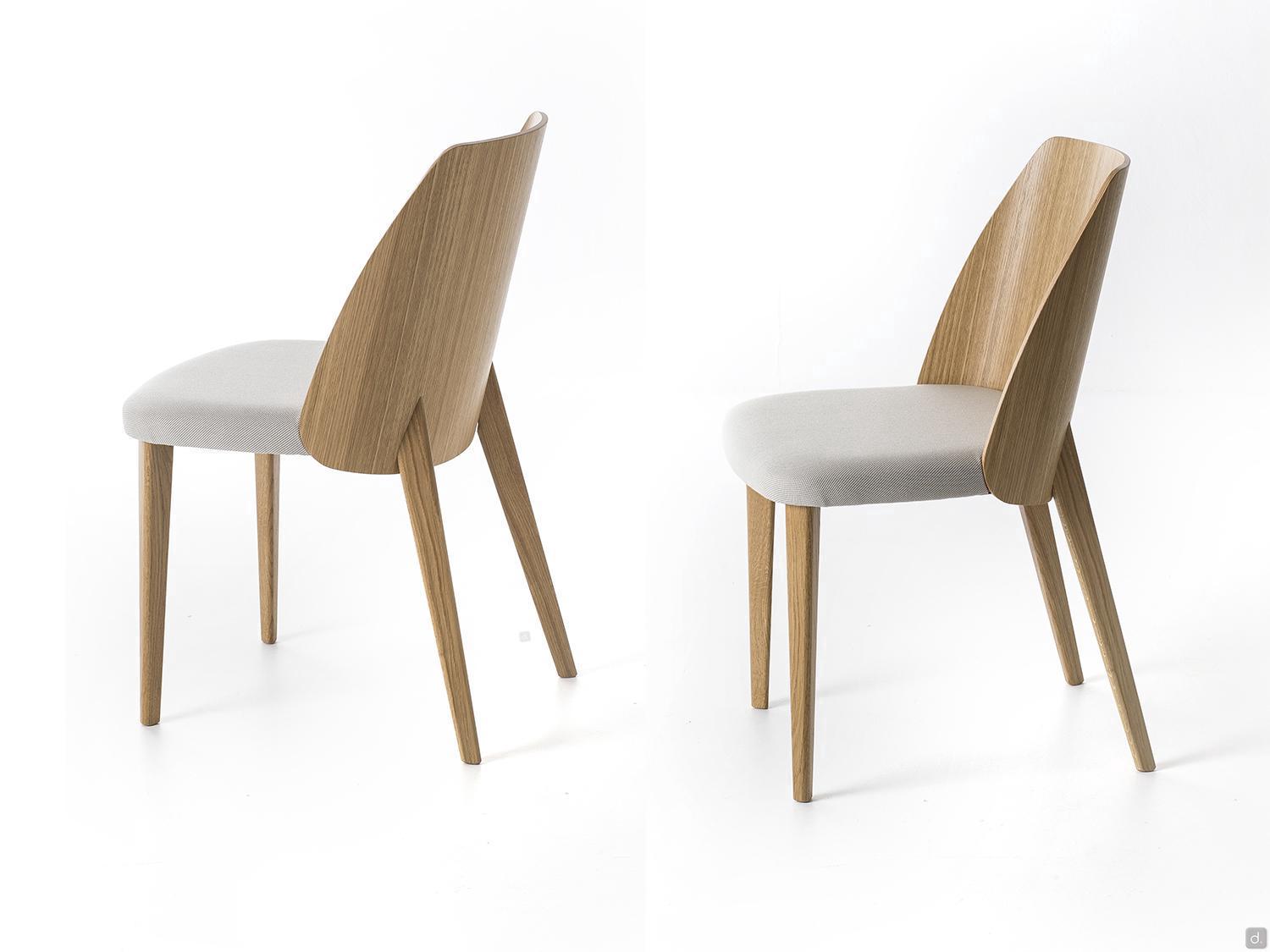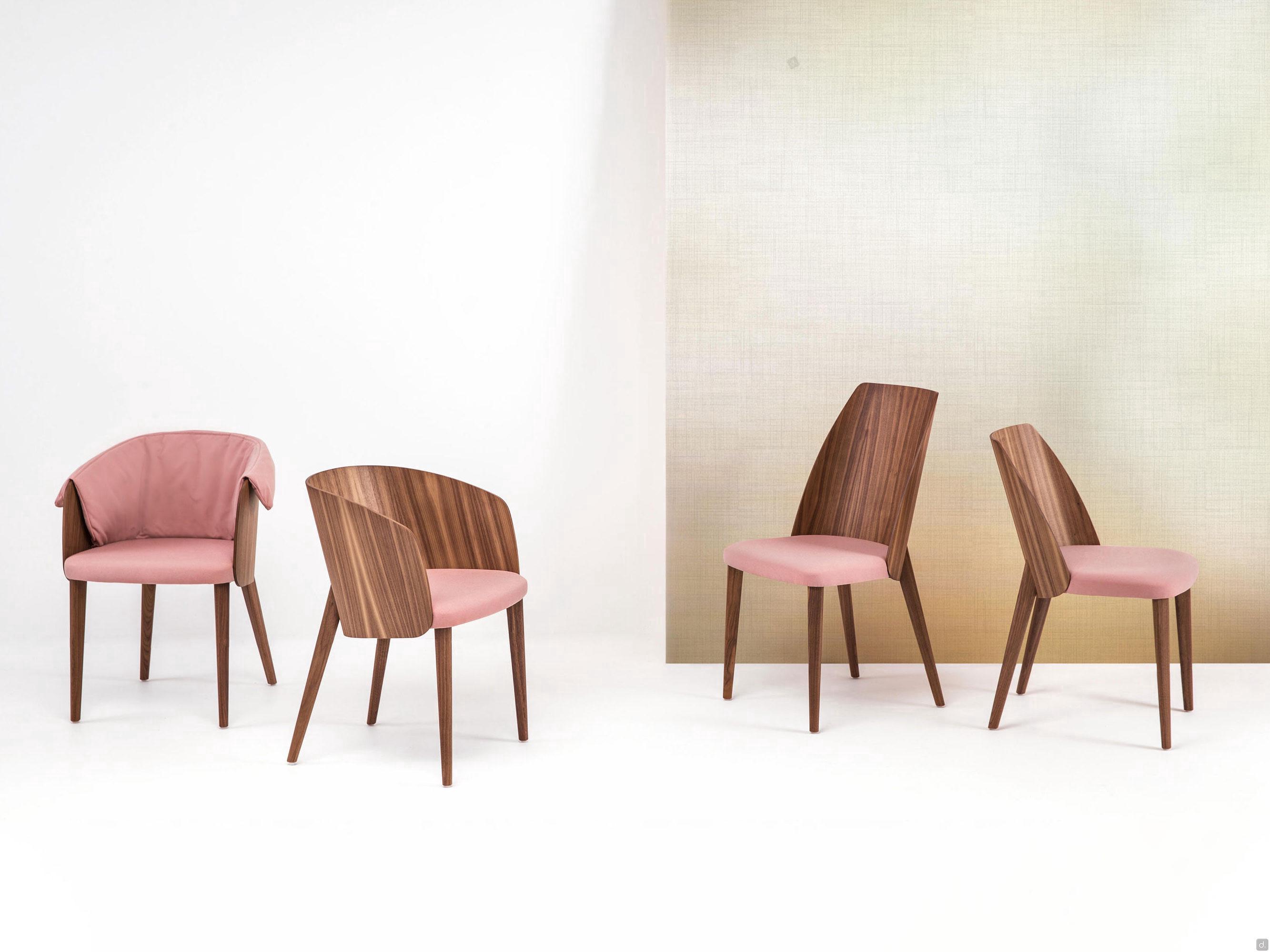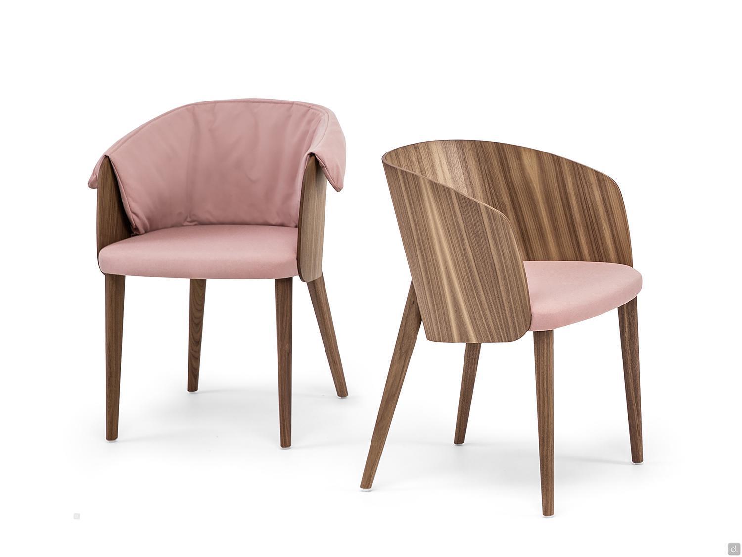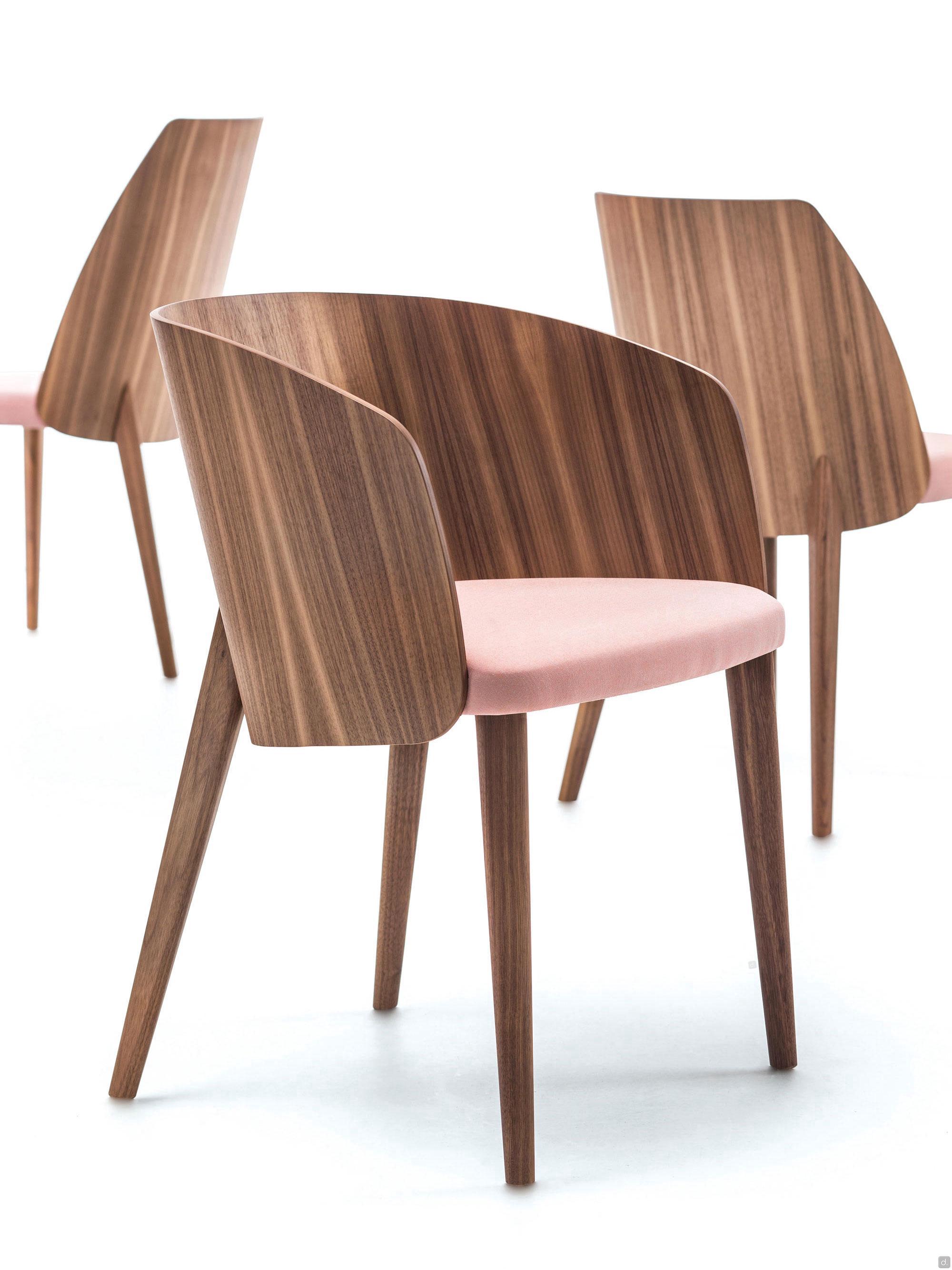 Le dossier, tout comme les 4 pieds effilés, est disponible en noyer canaletto ou en chêne teinté ou laqué, s'adaptant ainsi à tout environnement au style élégant et raffiné. Uniquement pour le petit fauteuil, il est possible de combiner le coussin de dossier rembourré pour augmenter le confort d'assise.