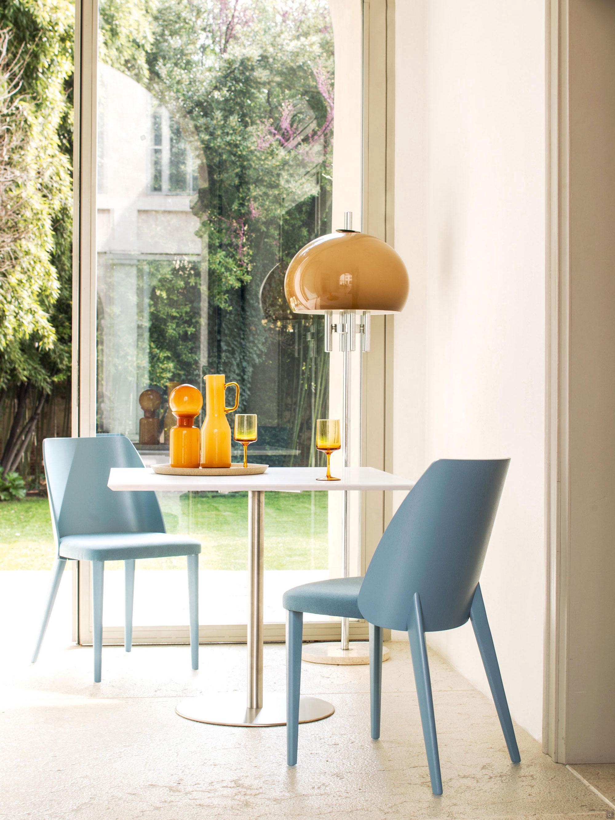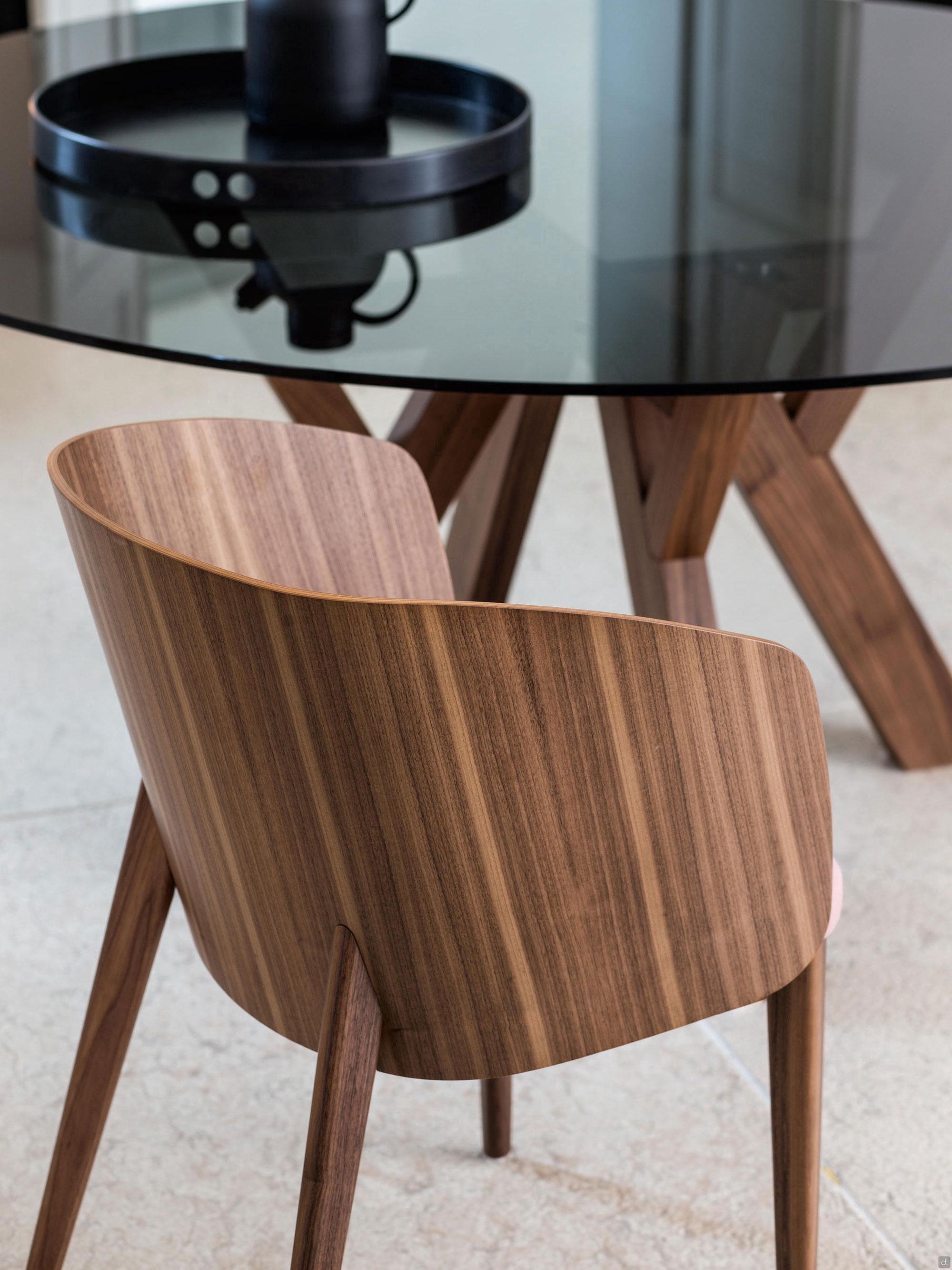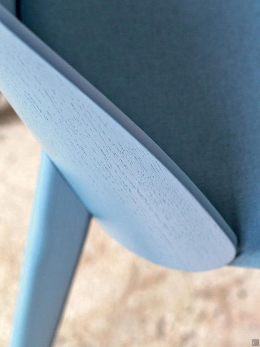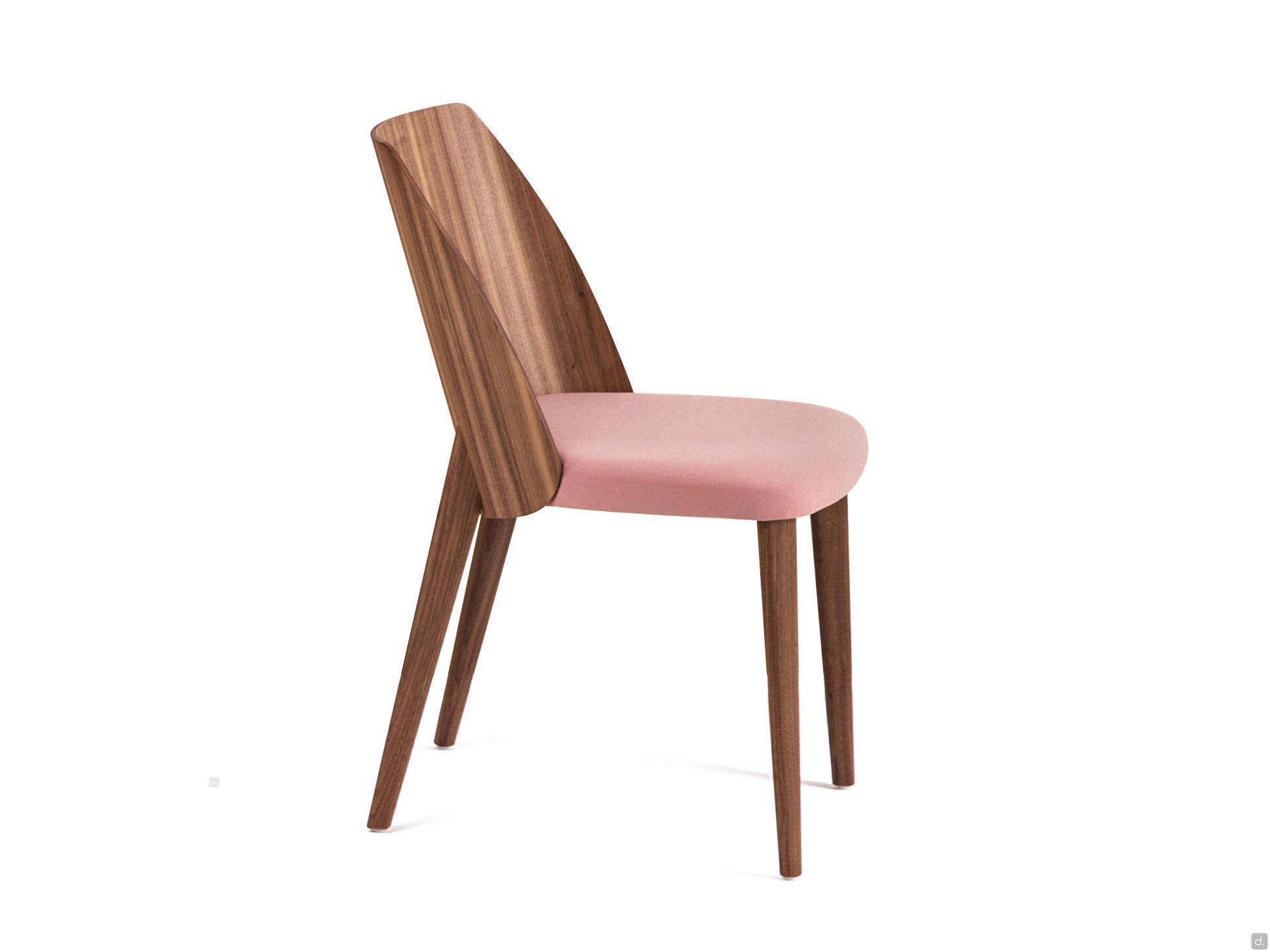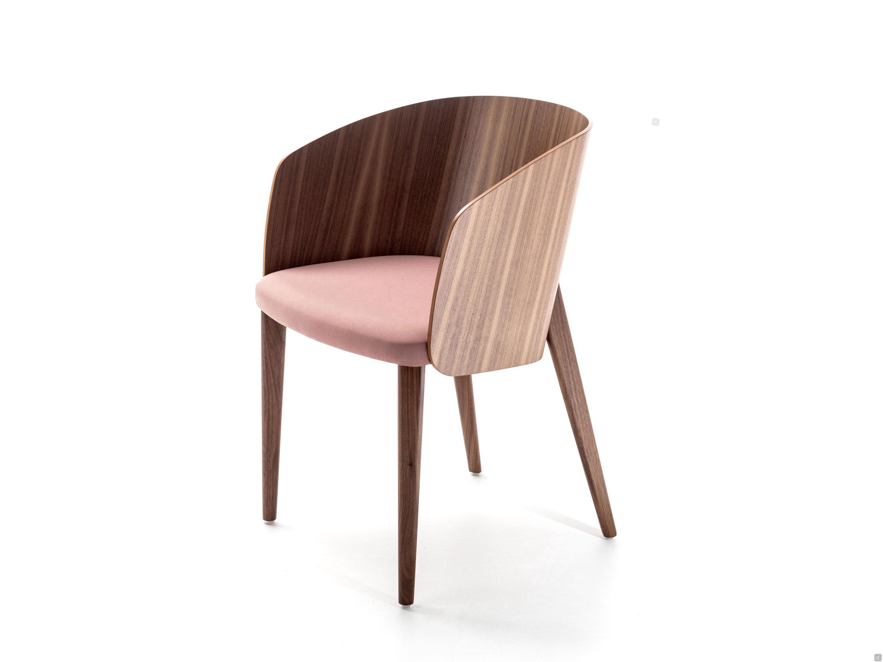 Le dossier, tout comme les 4 pieds effilés, est disponible en noyer canaletto ou en chêne teinté ou laqué, s'adaptant ainsi à tout environnement au style élégant et raffiné. Uniquement pour le petit fauteuil, il est possible de combiner le coussin de dossier rembourré pour augmenter le confort d'assise.