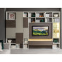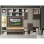 A gauche la composition a une bibliothèque avec compartiments ouverts et fermés. L'alternance d'espaces ouverts et fermés et leur positionnement asytmétrique donne mouvement et unicité à la composition, tout en offrant fonctionnalité et praticité. Au centre de la composition on trouve un panneau mural pour votre TV écran plat. Le dossier est équipé d'une barre LED qui éclaire une partie du panneau et le top de la base suspendue.