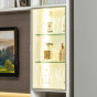 La composition termine à droite avec une colonne bibliothèque avec une vitrine. Un compartiment a été meublé avec verre transparent et fermé avec une porte en verre transparente avec châssis en aluminium de votre choix entre clair Titanium et foncé Brown. L'éclairage LED enrichie la composition entère et la rende particulièrement lumineuse et fait ressortir ce qui contient.