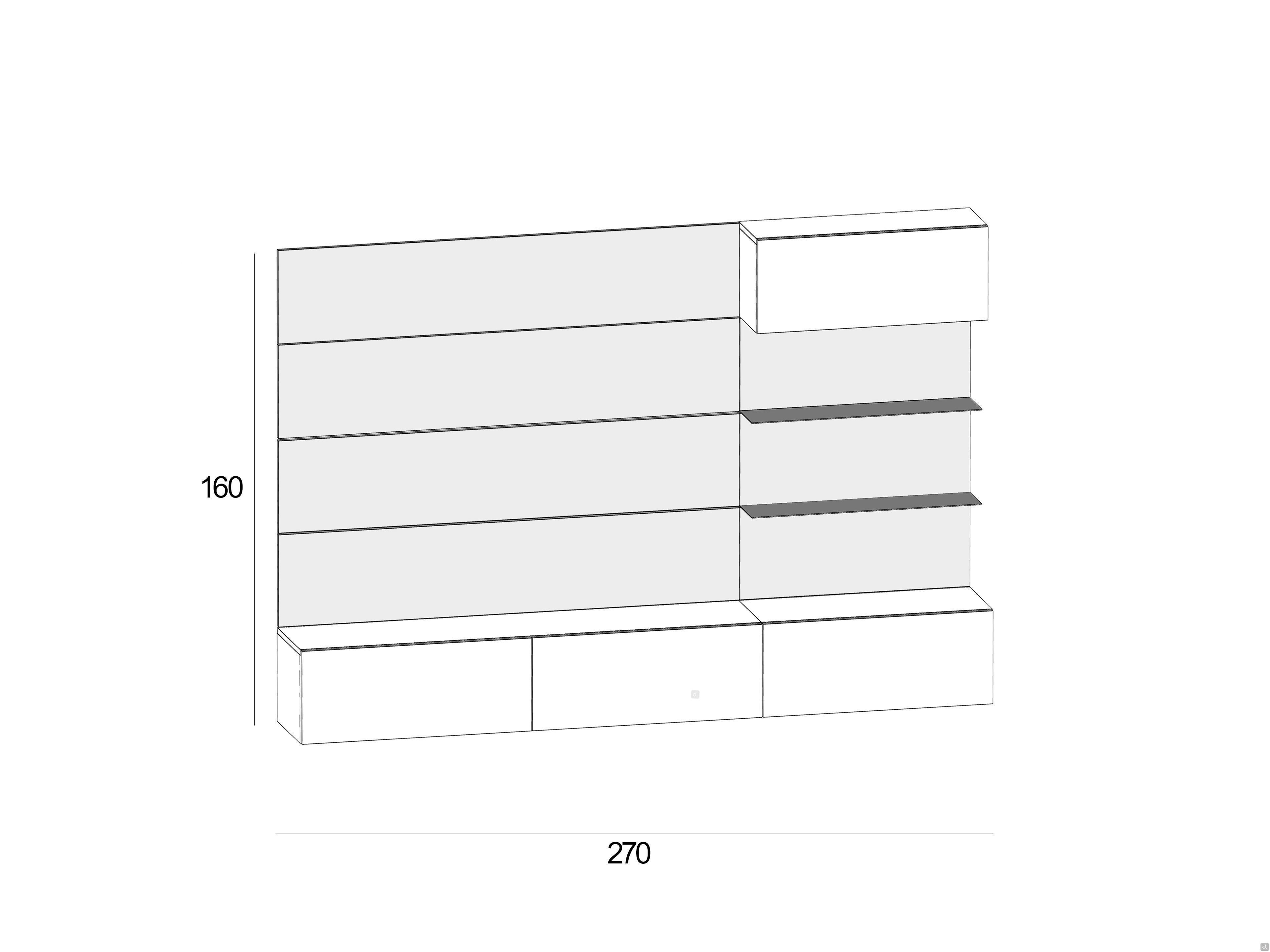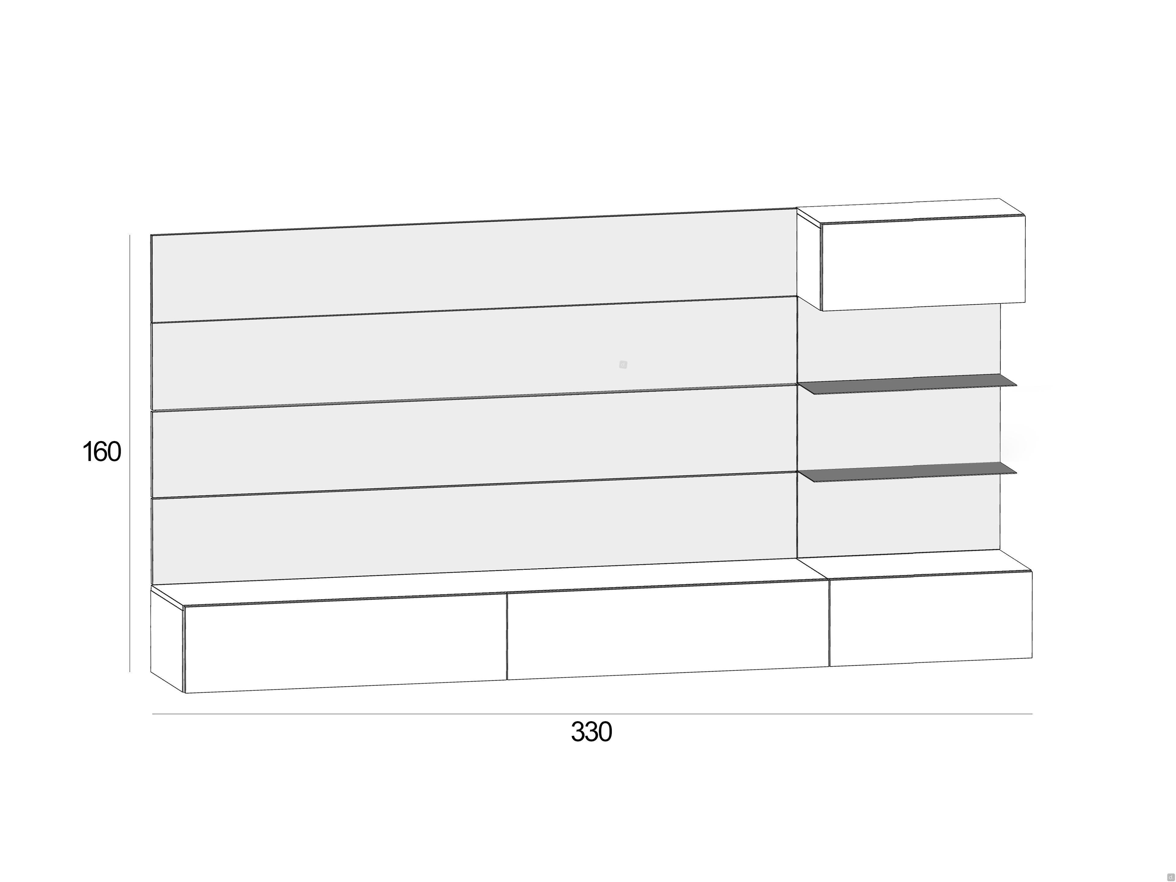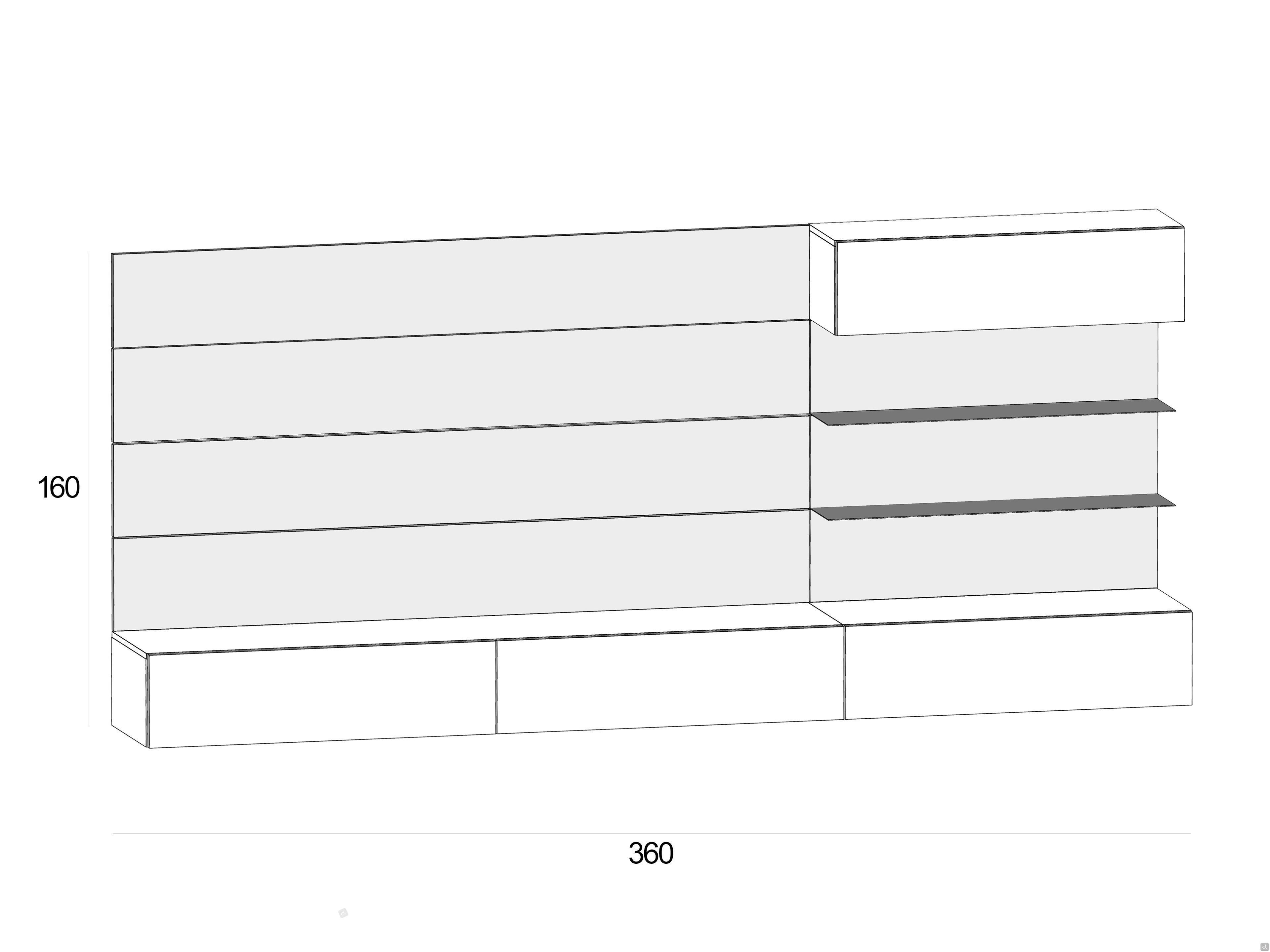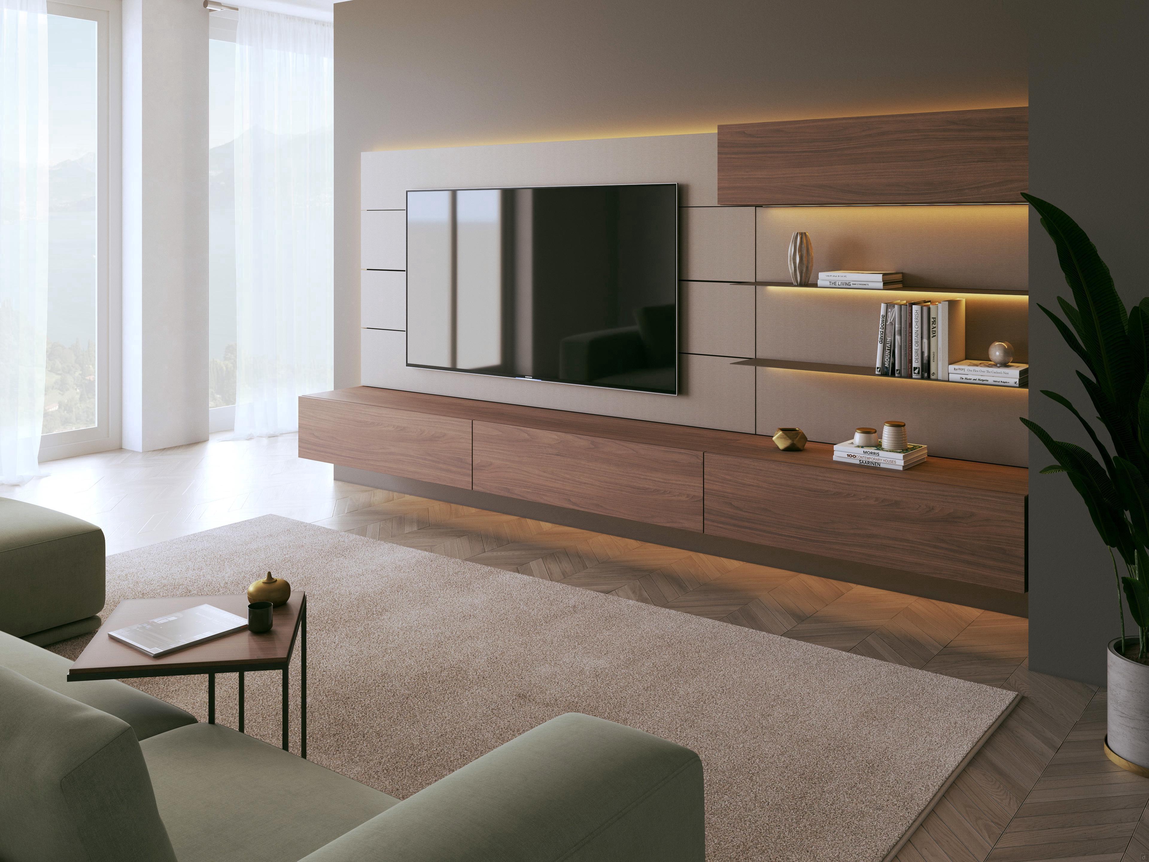 Barre Led périphérique : 84W (pour le mur modèle A de 270 cm), 100W (pour le mur modèle B de 330 cm) ou 120W (pour le mur modèle C de 360 cm), complète avec alimentation et encastrée dans le panneau arrière en MDF. Lumière 3000K diffusée sur les 4 côtés de la composition, allumage par télécommande disponible en option.