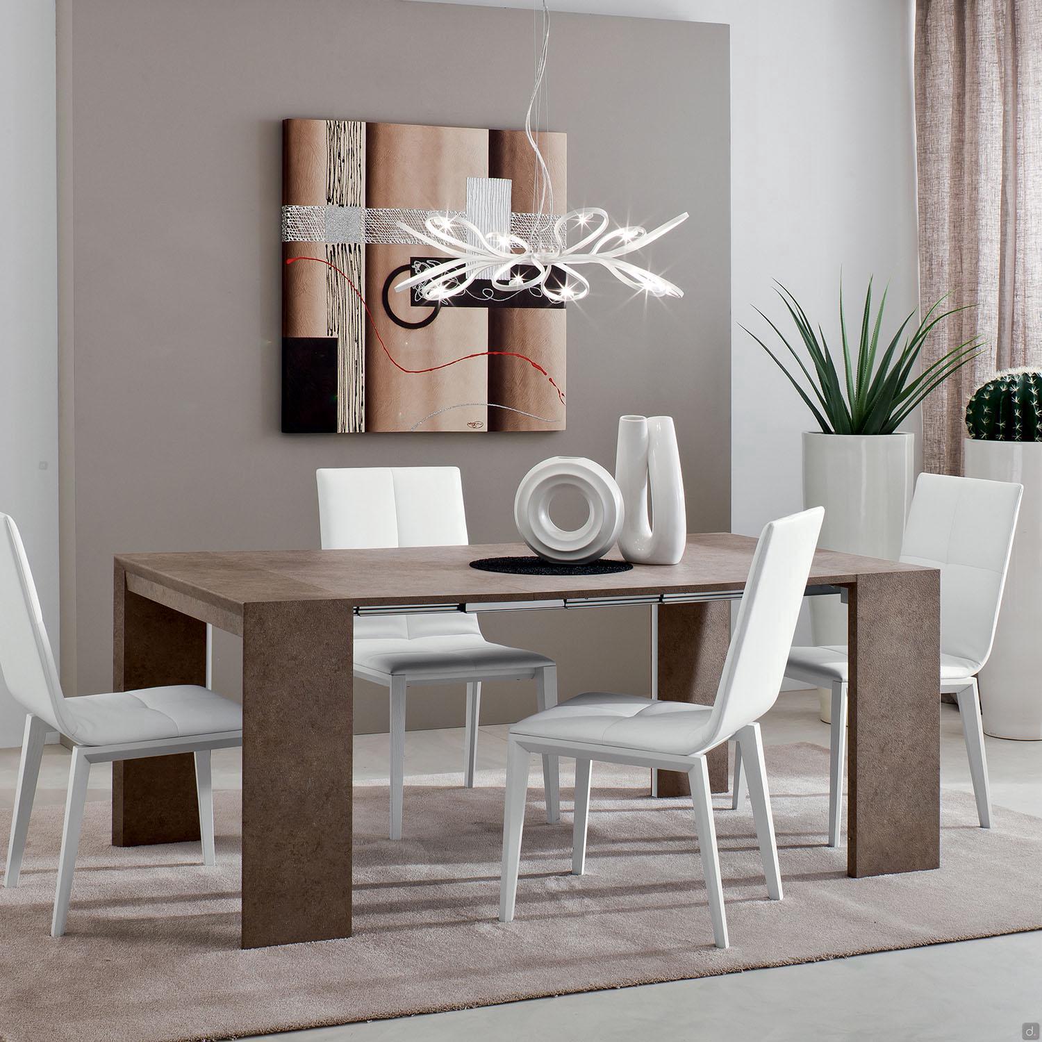Malcolm est une console table effet pierre en mélaminé HPL, disponible en deux versions. La console présente une largeur de 100 cm et est proposée à 3 ou 6 rallonges de 43,5 cm chacune. Les rallonges sont toujours assorties au plateau et sont fournies à part, avec pochette de rangement. La structure extensible est dotée de rails coulissants pratiques en aluminium, visibles sur les côtés lorsque la console est ouverte. Malcolm est une console moderne, réalisée avec des matériaux hautement résistants, idéale comme table pour acceuillir de nombreuses convives.
