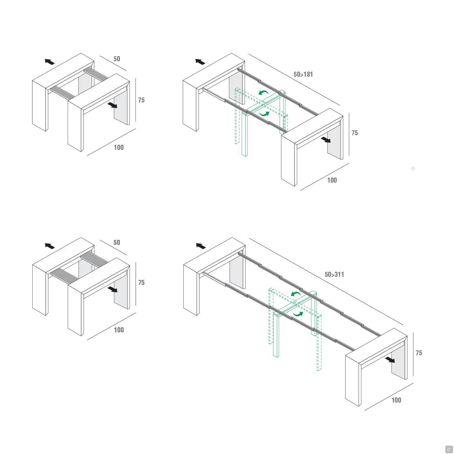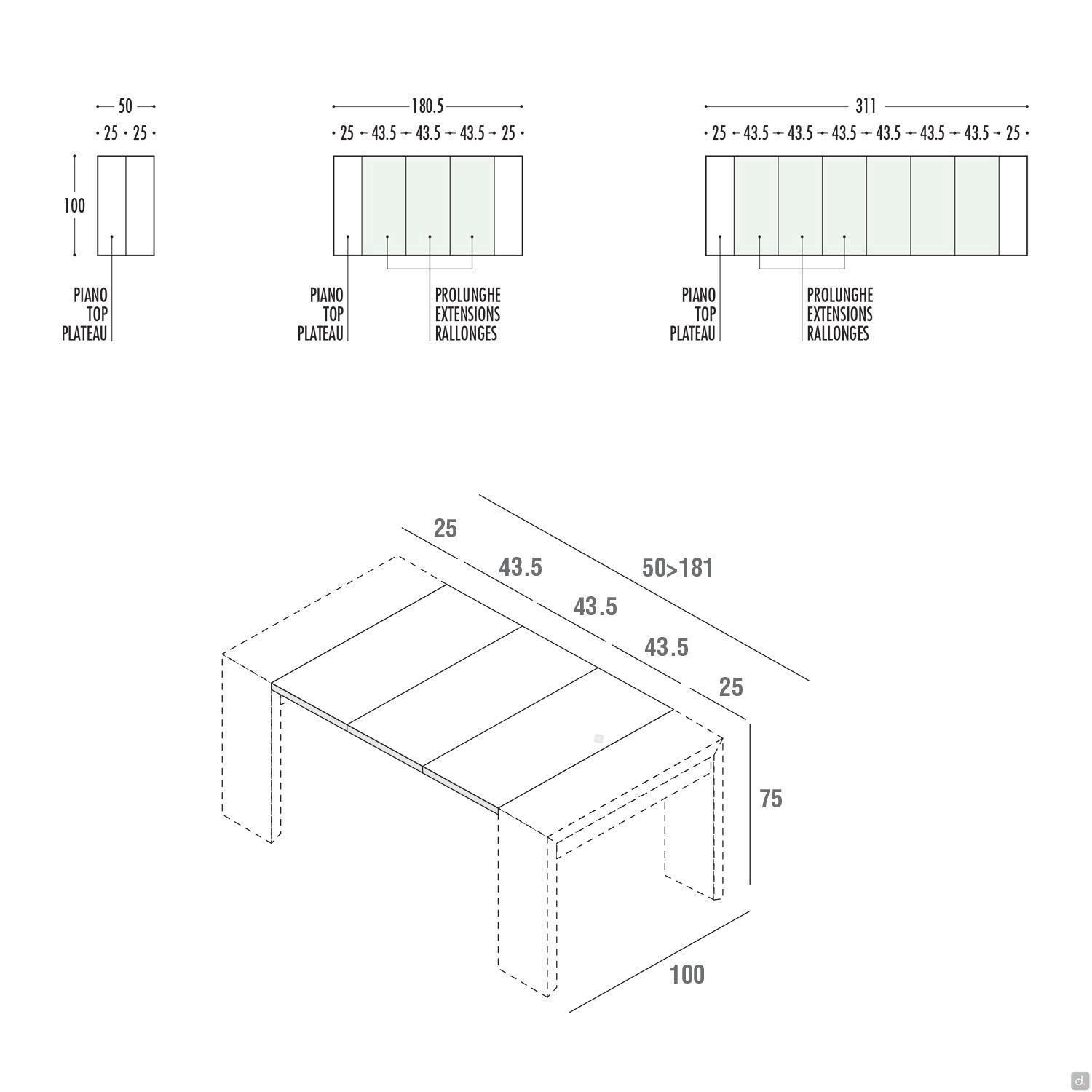 Le modèle extensible de 100 cm p.50 (93,5 - 137 - 180,5) est fourni avec 3 rallonges de 43,5 cm chacune. Le modèle extensible de 100 cm p.50 (93,5 - 137 - 180 - 224 -267,5 - 311) est fourni avec 6 rallonges de 43,5 cm.