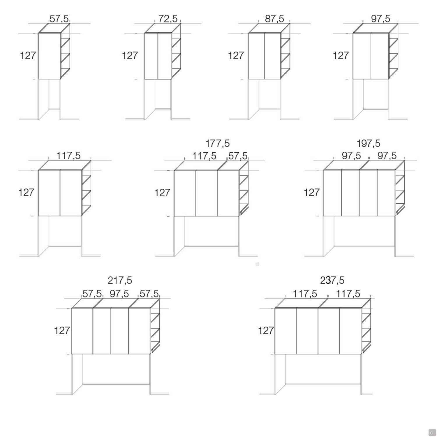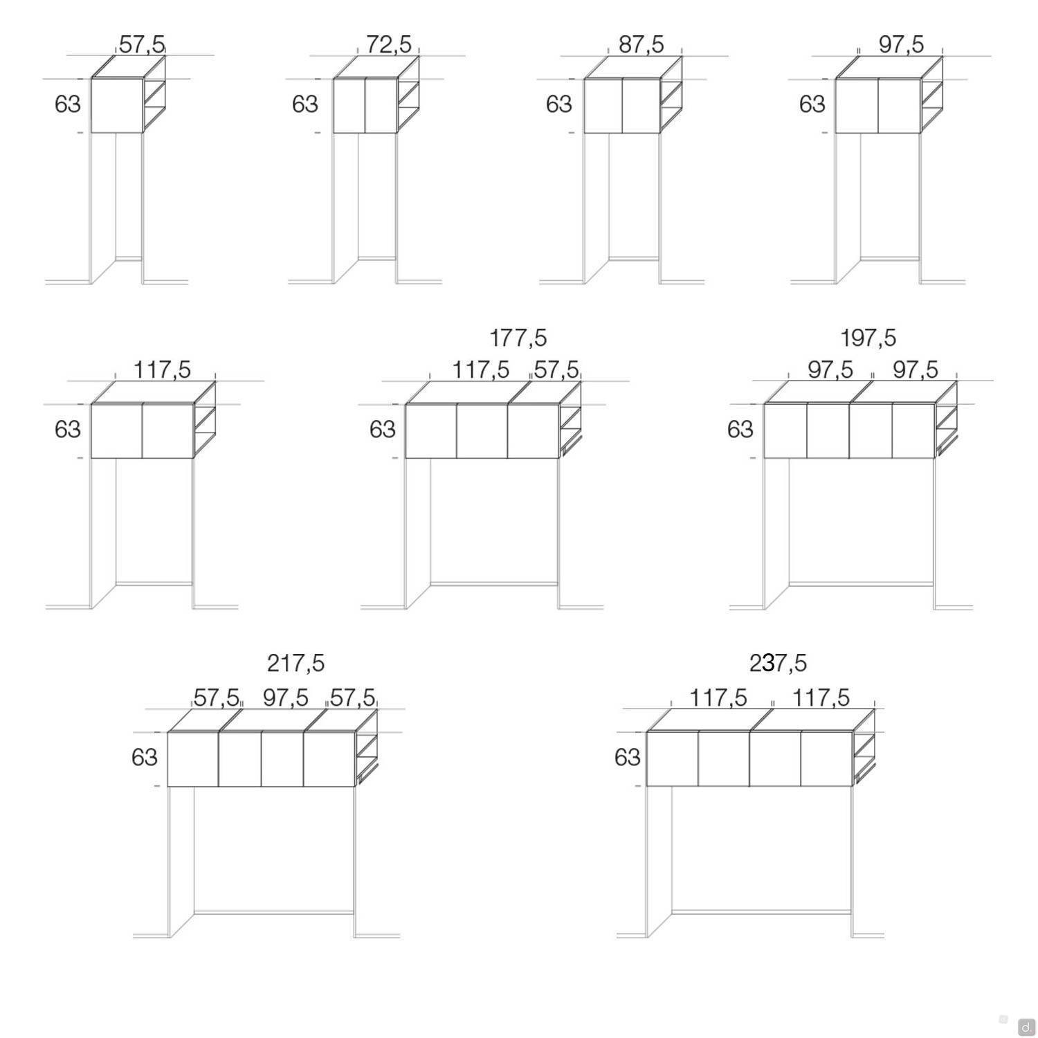 Fonds : entier avec côtés externes en teinte avec les portes et flancs (modules de 47,5 - 57,5 - 97,5 et 117,5 cm) ou bien surface pliante en teinte avec les portes et flancs dotés de barres de support en métal (modules de 177,5 - 197,5 - 217,5 et 237,5 cm). Pour les dimensions spécifiques, nous vous conseillons de visualiser le schéma correspondant dans la Galerie d'Images.