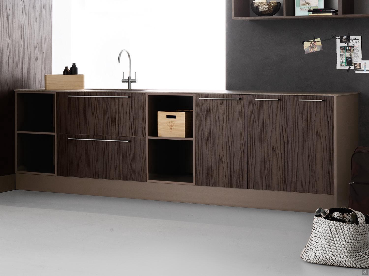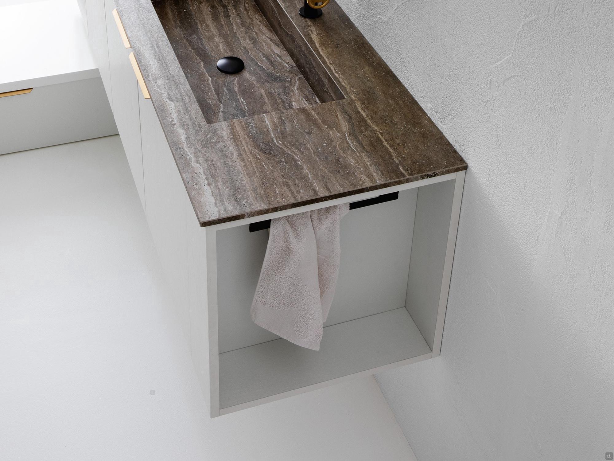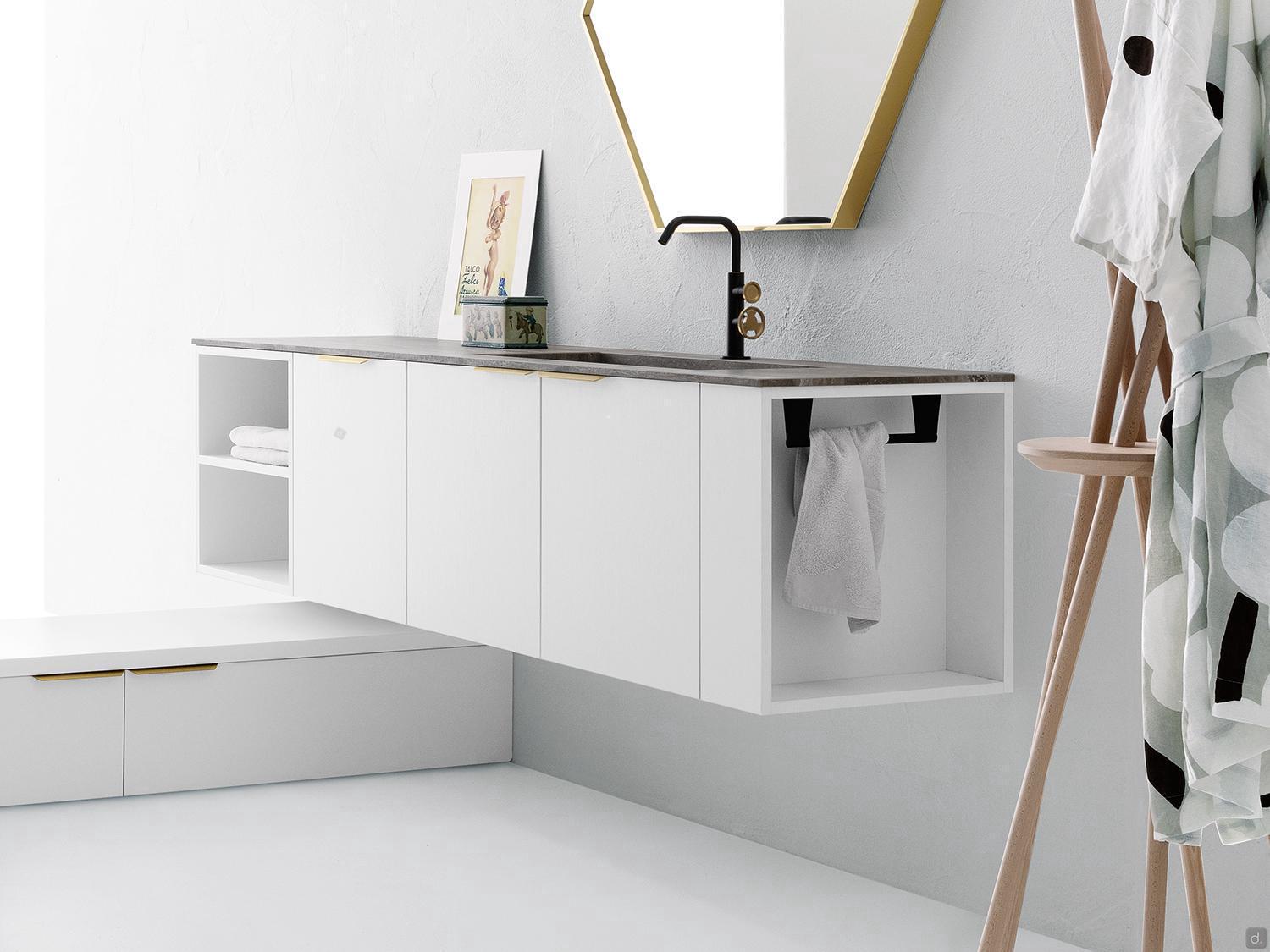 Oasis est un meuble de rangement sans portes pour buanderies disponible dans la version frontale ou latérale avec la possibilité d'insérer un porte-serviettes.Le meuble base ouvert permet de rompre la linéarité esthétique de la composition de la buanderie grâce à l'absence de portes ; en même temps, il offre un vaste espace pour ranger des serviettes ou autres, en les ayant toujours à portée de main. Le meuble base ouvert latéral, qui peut être fixé sur le côté d'un meuble base, permet d'utiliser tout l'espace disponible grâce à sa largeur réduite de seulement 15 cm. Le porte-serviettes en option est un outil précieux pour maintenir l'ordre dans la buanderie.