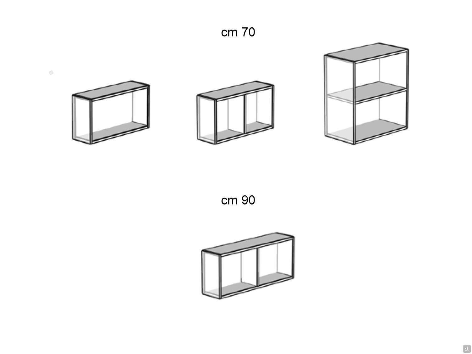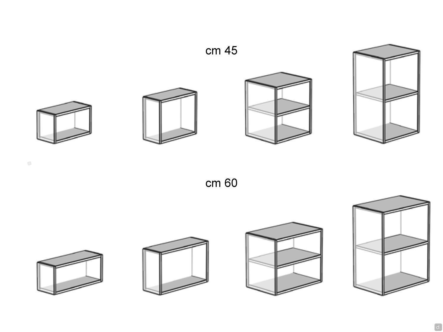 Modèle et DimensionsLargeur :- base ouverte : cm 45 / 60 / 70 / 90- base ouverte laterale: cm 15Profondeur : cm 37 / 50 / 62 / 67Hauteur : cm 25 / 37,5 / 50 / 75Matériaux et Finitions- mélaminé- laqué mat / mat sur mélaminé / sablé / metallisé / brillant