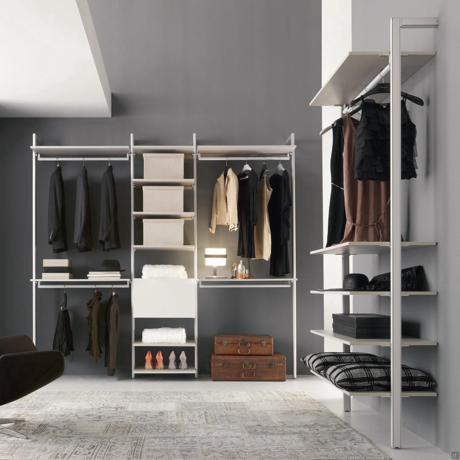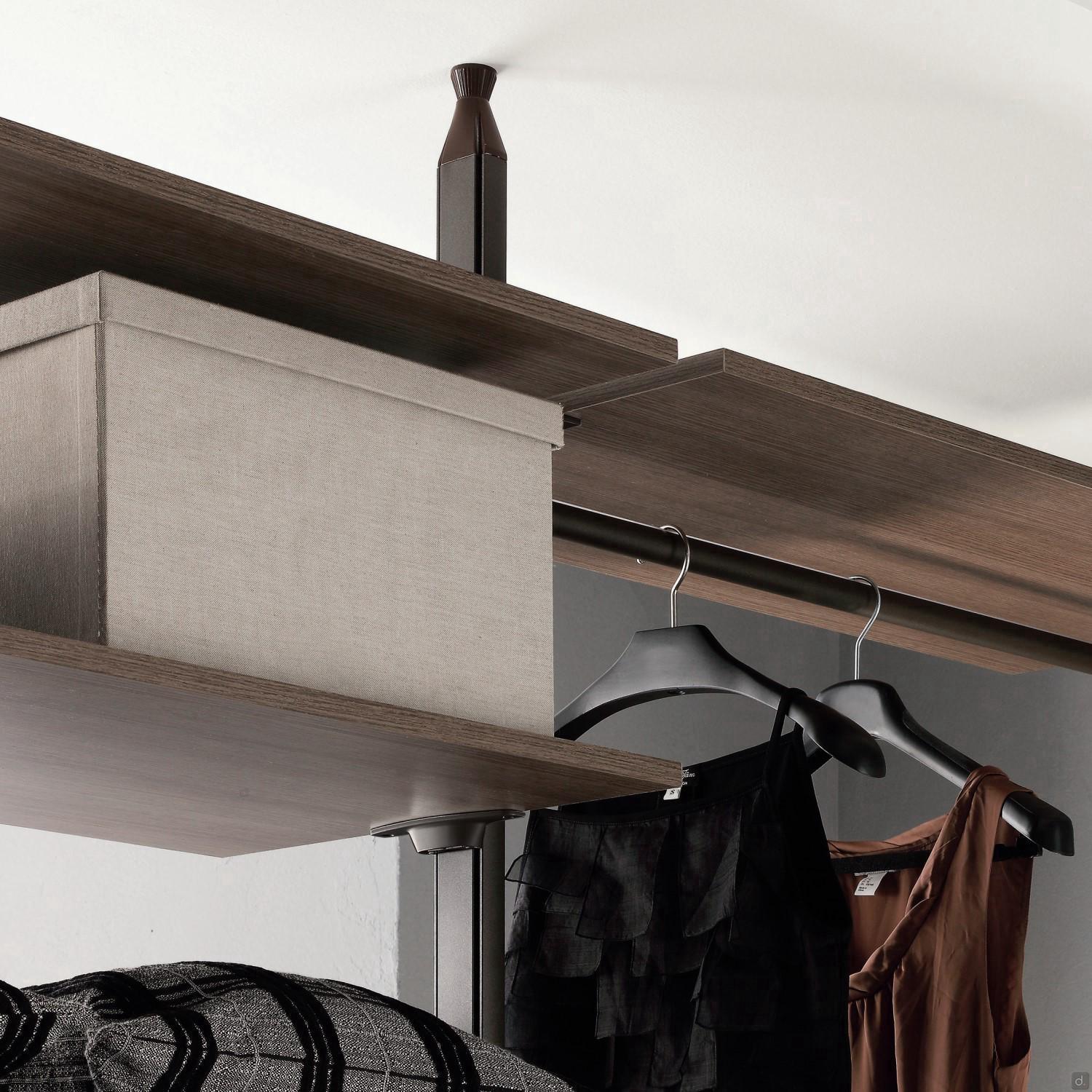 Optionslargeur des étagères sur mesure: les étagères du dressing Byron peuvent être fabriquées sur mesure en largeursans frais supplémentaires. Pour les étagères linéaires, la largeur doit être comprise entre 50 cm et 100 cm ; pour les étagères d'angle, les deux côtés doivent avoir une largeur comprise entre 90 cm et 110 cm.barre pour suspendre les habits: è réalisée en aluminium en aluminium anodisé argent et est équipée d'un joint antidérapant en silicone. Pour les étagères d'angle, el se compose de deux barres de suspension linéaires placées perpendiculairement l'une à l'autre. Les portemanteaux sont déjà montés sur les étagères.