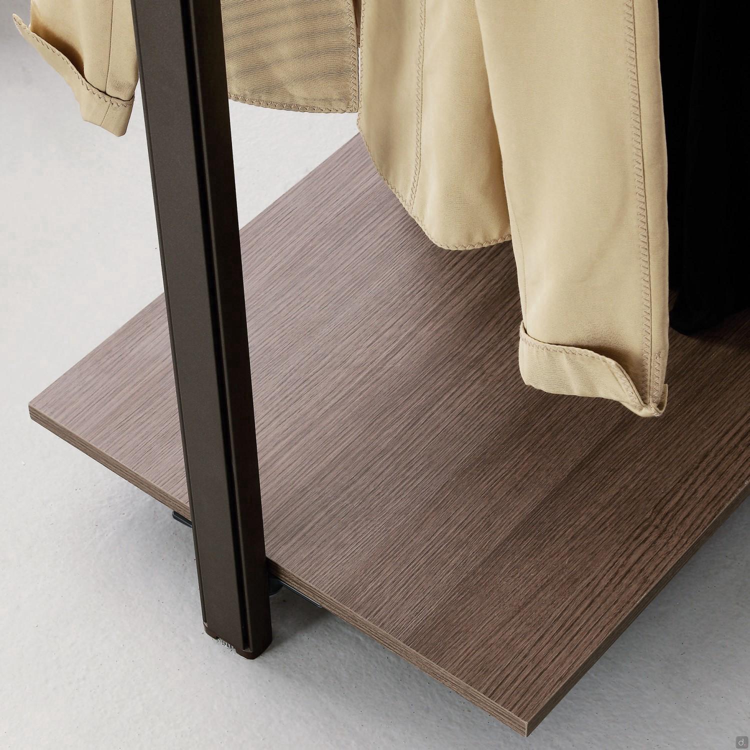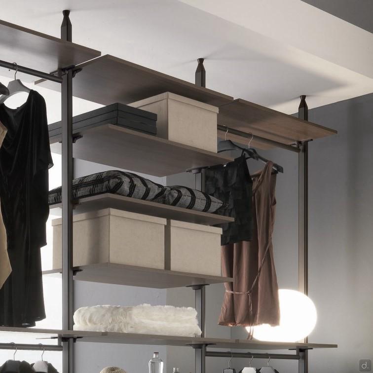 Caractéristiques Techniques et ÉquipementÉtagères linéaires: en mélaminé, équipées de deux supports métalliques assortis aux montants.Étagères d'angles: réalisées en mélaminé. Elles sont équipées de trois supports métalliques assortis aux montants ; les deux supports latéraux sont fixés aux montants, le troisième est placé sur l'angle et doit être fixé au mur pour garantir la stabilité de l'étagère.Étagères pour chaussuress et pour sacs: sont équipées d'une barre métallique en aluminium argenté au choix ou de la même couleur que les montants.
