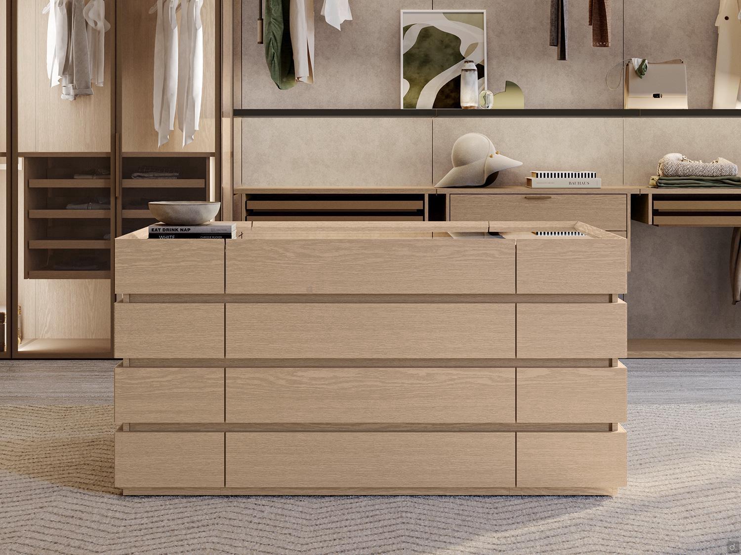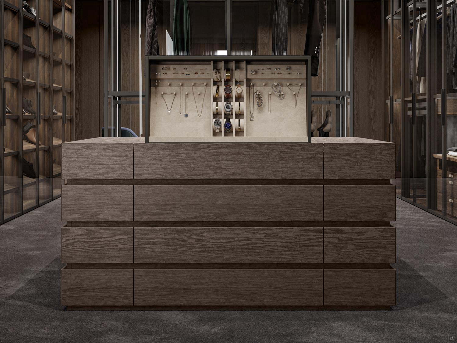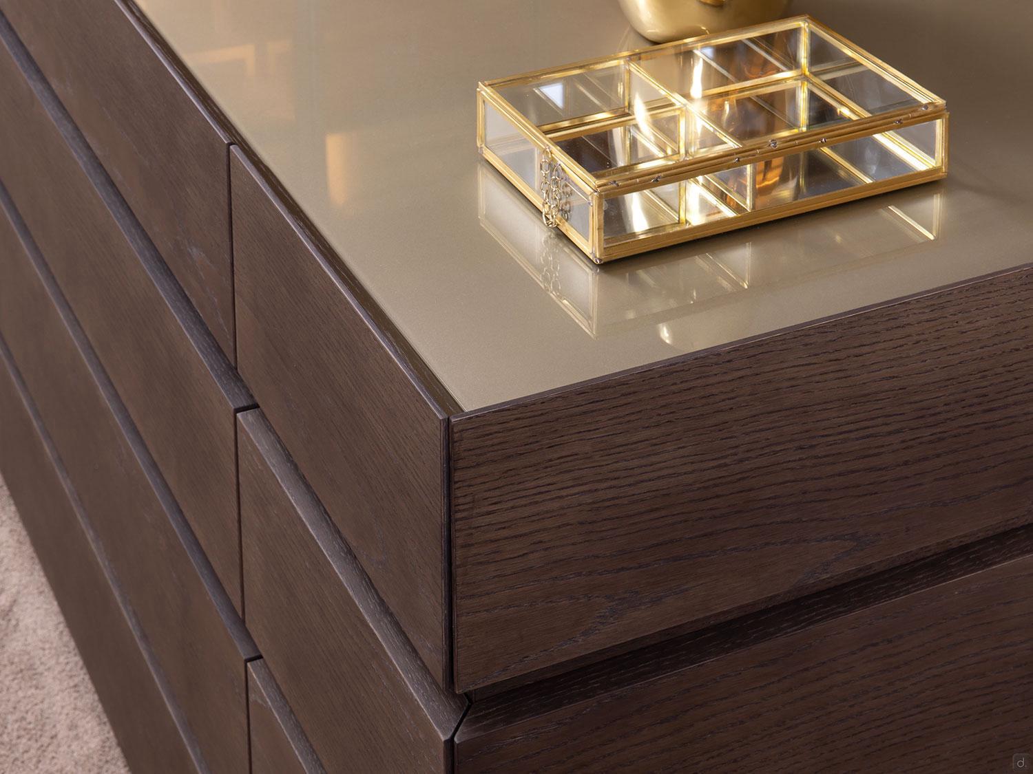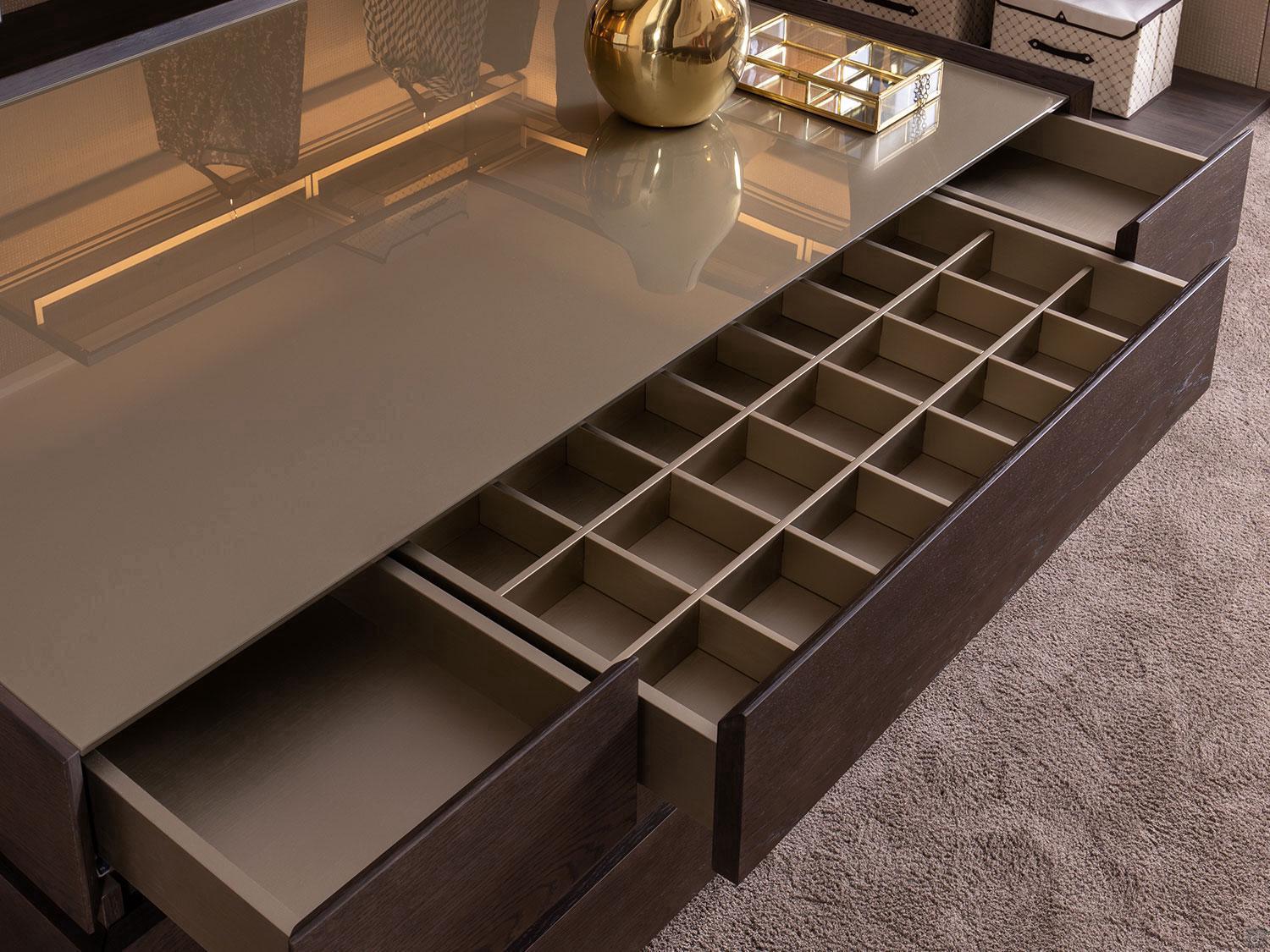 Tiroirs : première rangée supérieure de tiroirs laqueé métallisée avec organisateur intérieur assorti. Intérieur des tiroirs inférieurs en mélaminé T05 Ovatta ou en laqué métallisé, avec glissières à sortie totale. Hauteur Façades 17 cm - hauteur intérieure 8,5 cm.