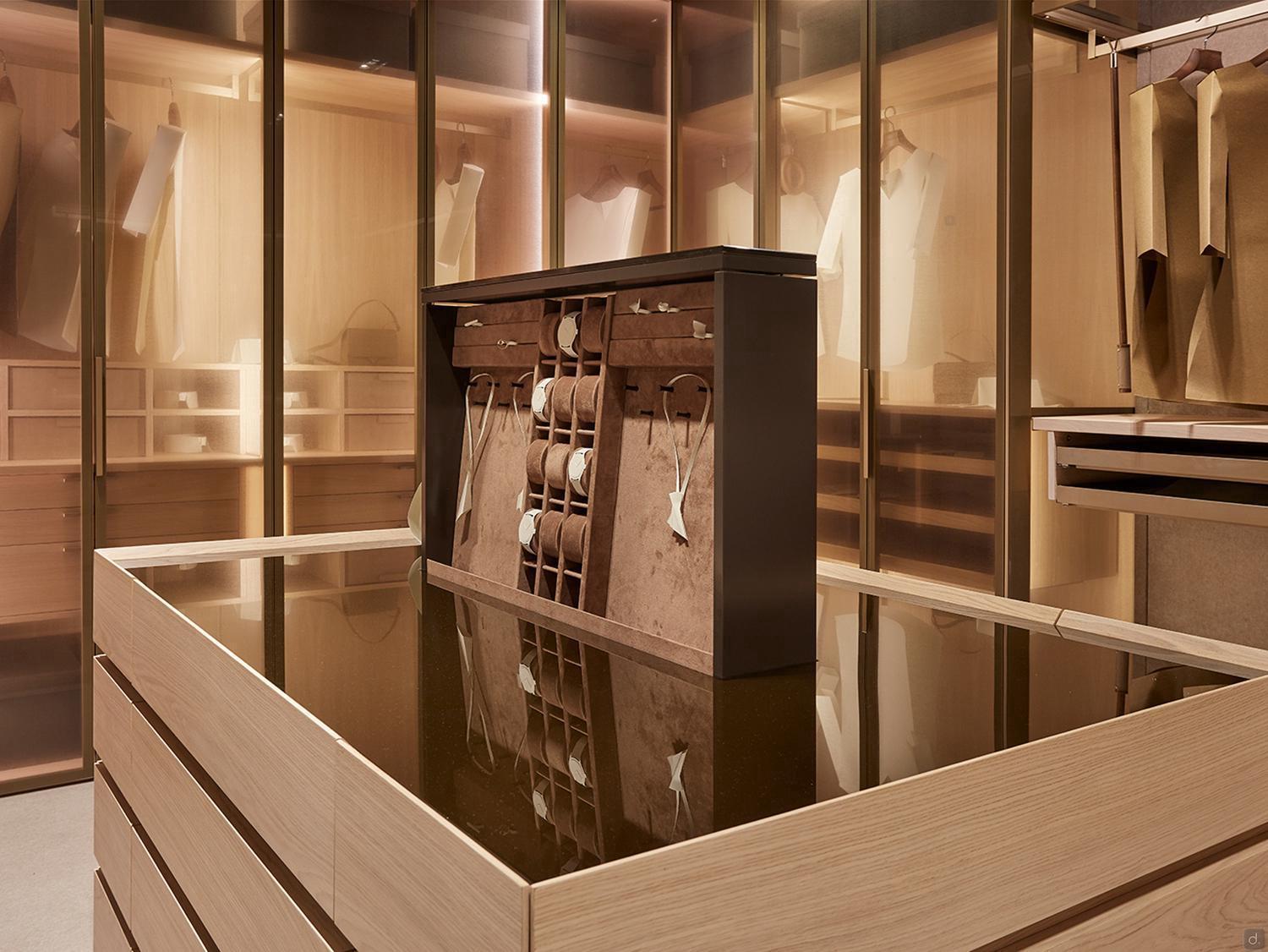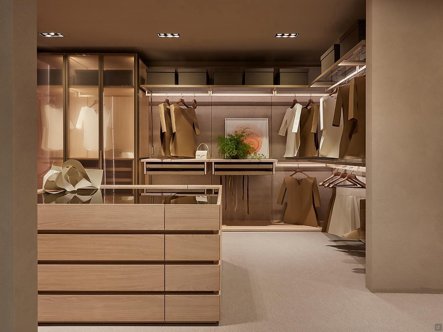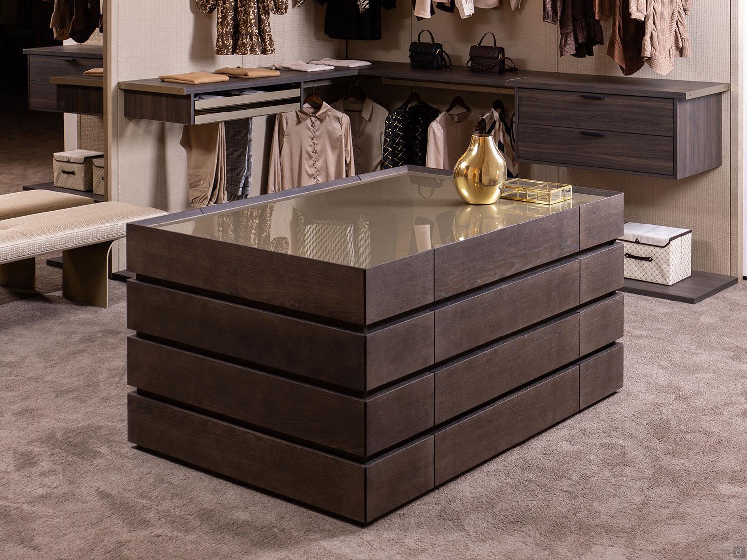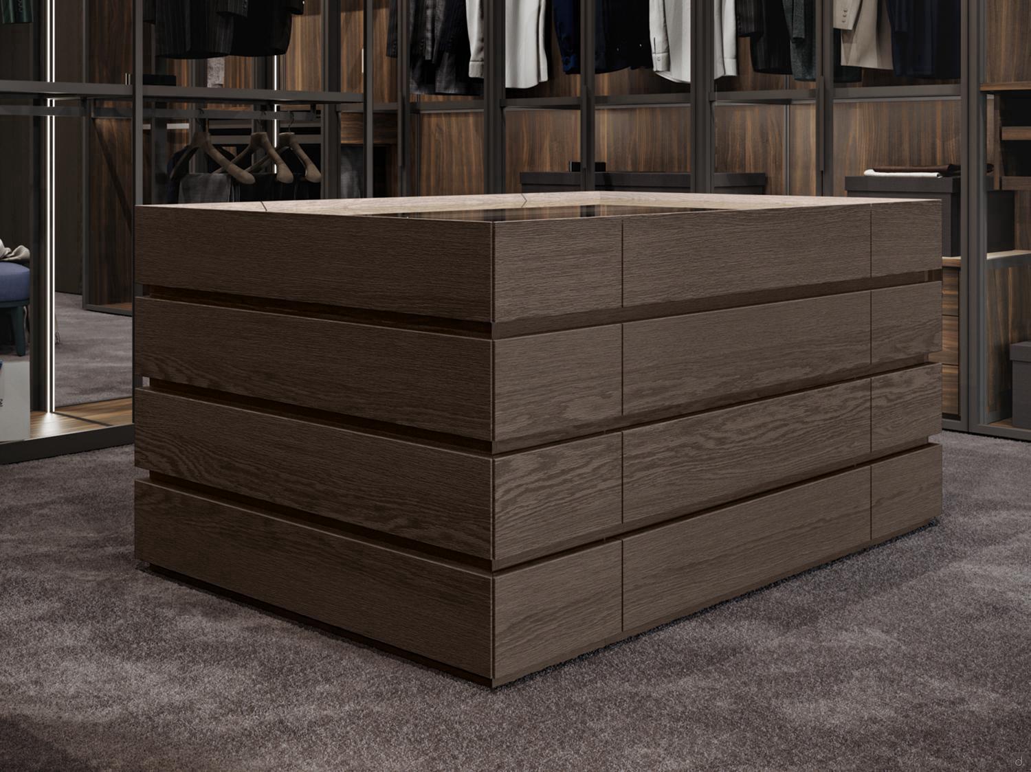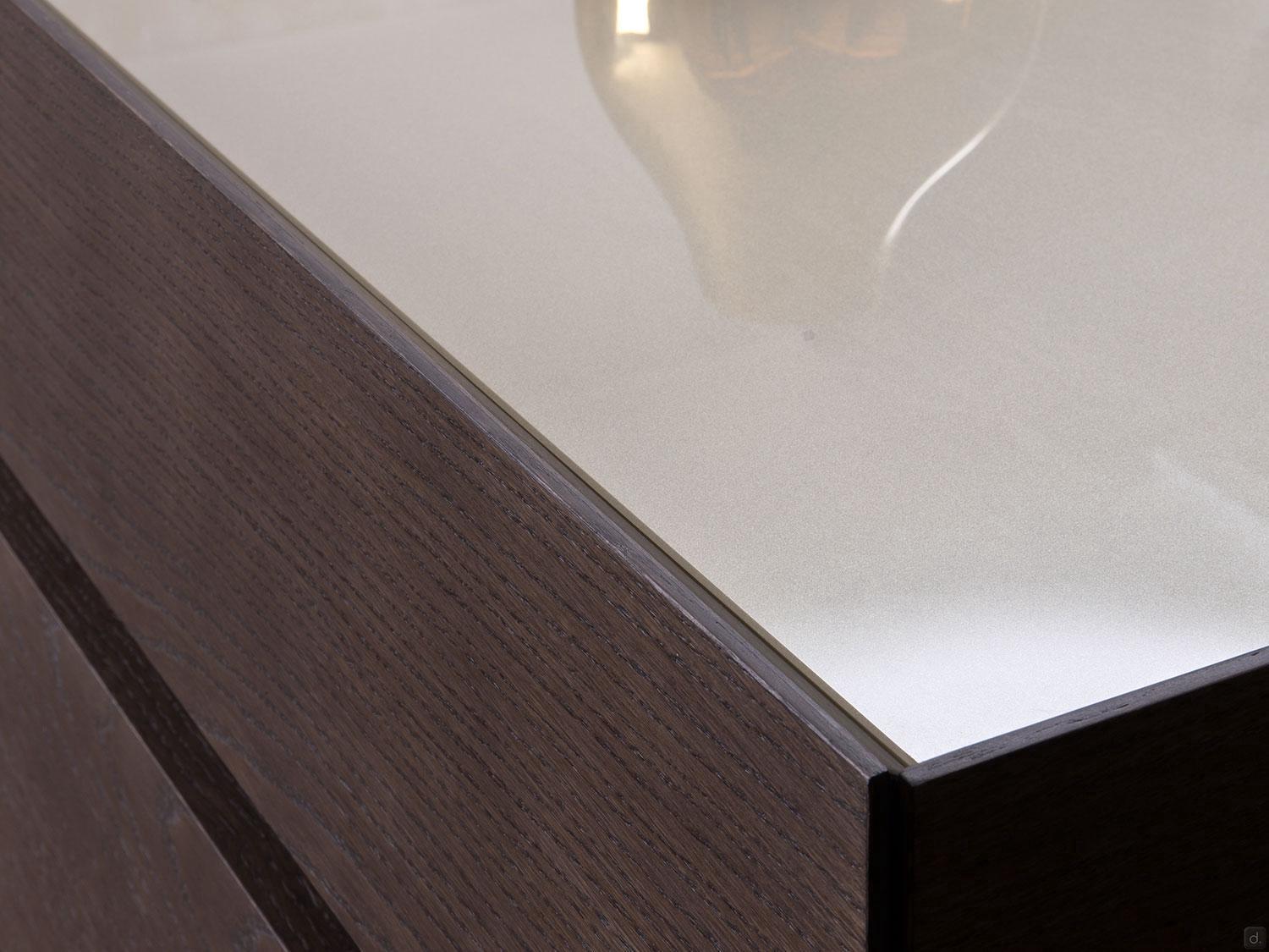 Tiroirs : première rangée supérieure de tiroirs laqueé métallisée avec organisateur intérieur assorti. Intérieur des tiroirs inférieurs en mélaminé T05 Ovatta ou en laqué métallisé, avec glissières à sortie totale. Hauteur Façades 17 cm - hauteur intérieure 8,5 cm.