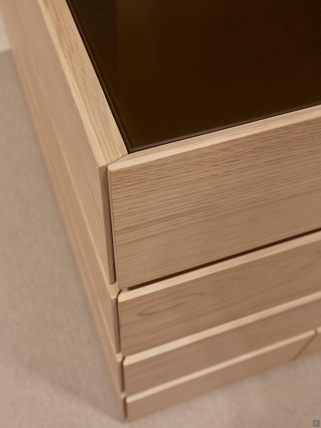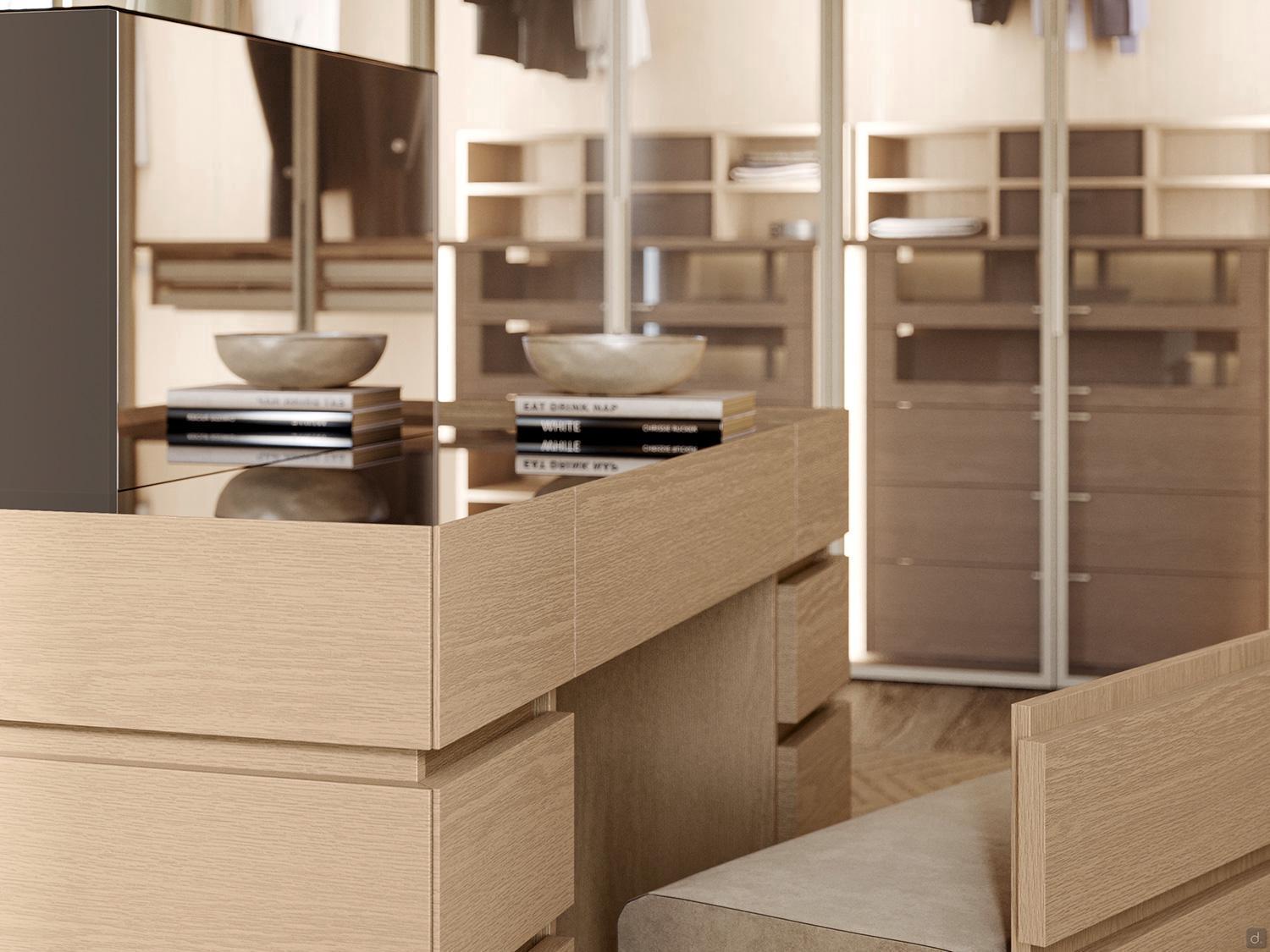Chêne Vieilli : par rapport au chêne "standard" à pores ouverts, le "chêne vieilli" se caractérise par une surface légèrement plus brossée, qui présente des pores plus profonds et un veinage plus visible. Cette différence est plus marquée sur les surfaces d'une certaine dimension telles que les tables, les compositions murales et les armoires, alors qu'elle est moins visible sur les meubles d'appoint, les compléments d'ameublement, les meubles de chambre.