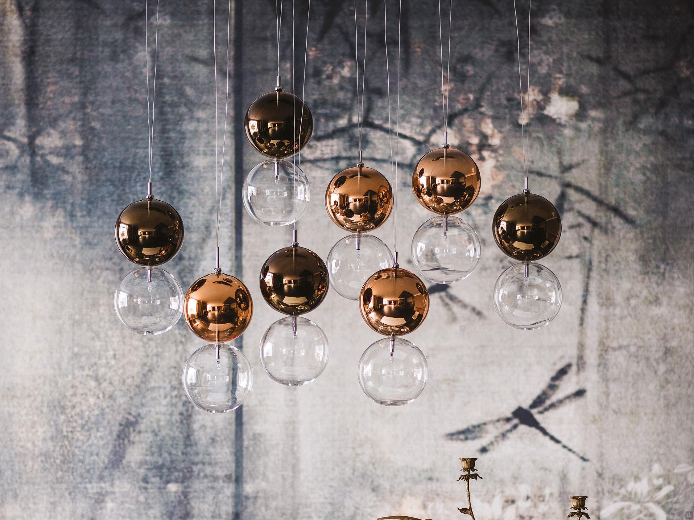 Apollo de Cattelan est une lampe à suspension à double sphère réalisée en verre borosilicaté verni et transparent ; l'abat-jour peut être complètement transparent pour un effet de légèreté et de simplicité, ou bien avec la sphère supérieure vernie dans les tons chrome, cuivre ou bronze. Apollo est disponible dans de nombreux modèles, avec 1 à 8 abat-jour. Avec 8, la rosace peut être choisie de forme ovale ou ronde. Il est possible de personnaliser les abat-jour afin que la sphère supérieure présente la même finition pour tous les abat-jour ou bien une finition différente pour chaque. La lampe s'adapte parfaitement à tous les intérieurs au design moderne et élégant, elle est idéale pour meubler un séjour ou un salon aux tons chauds.