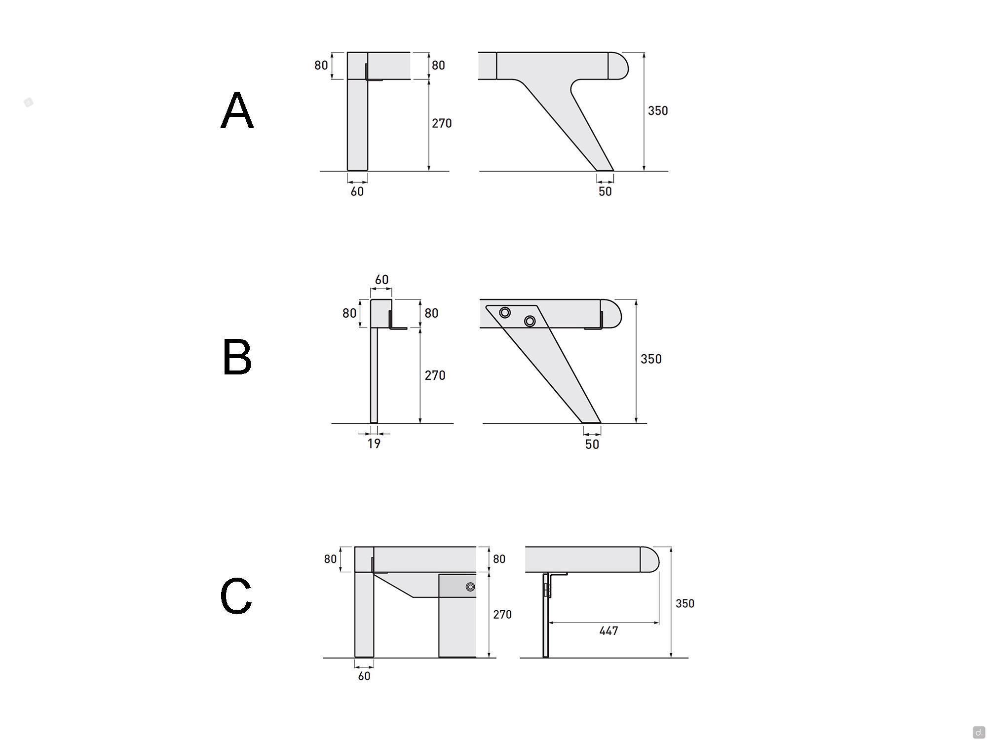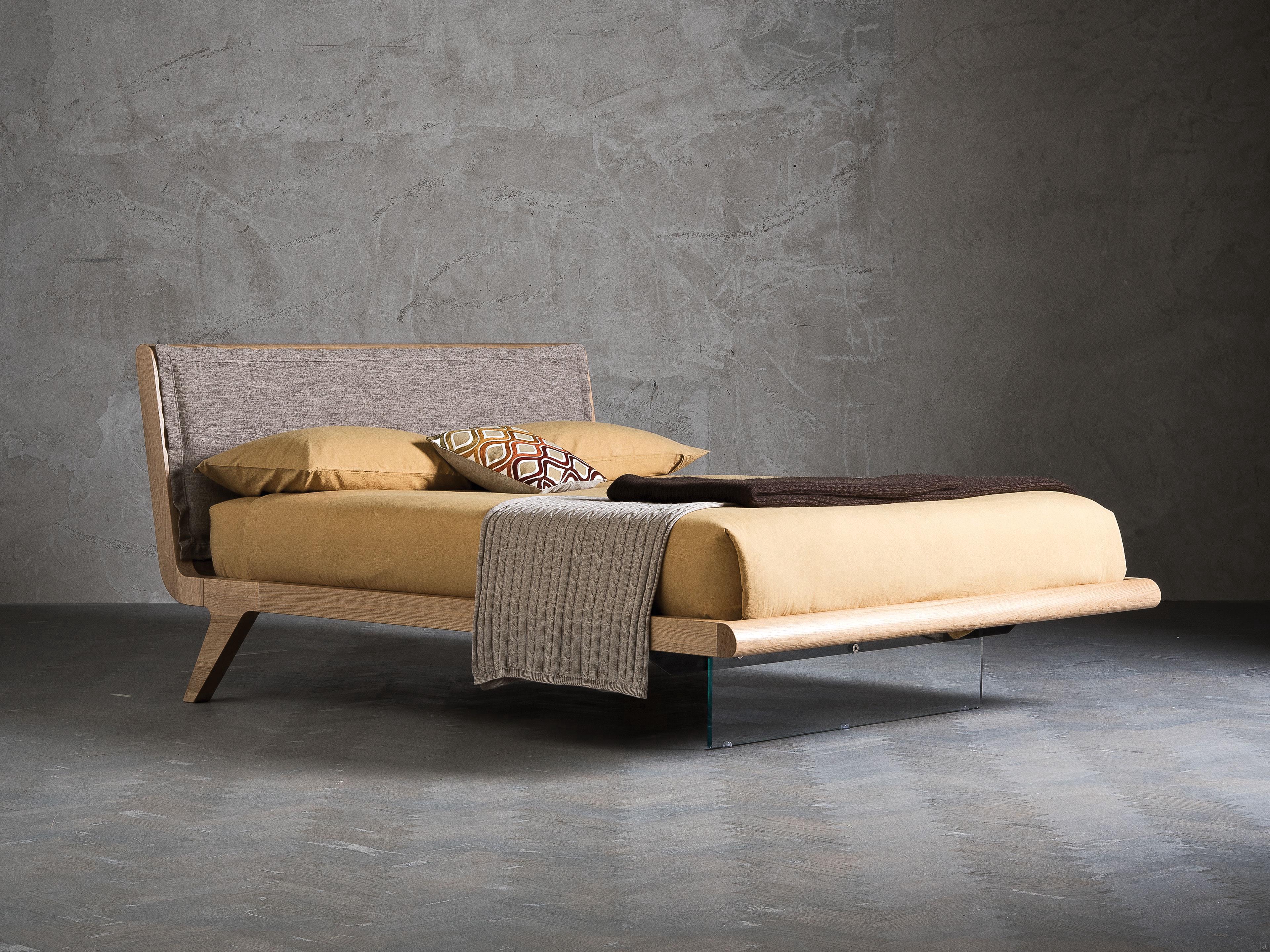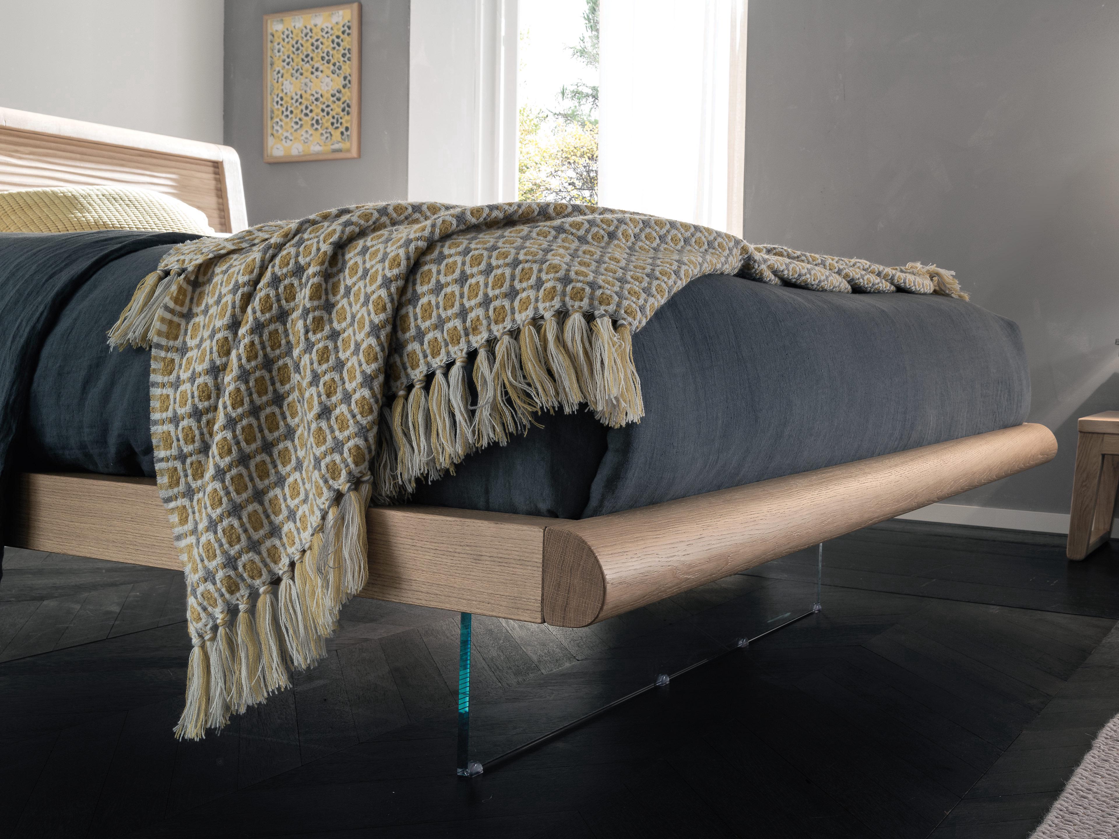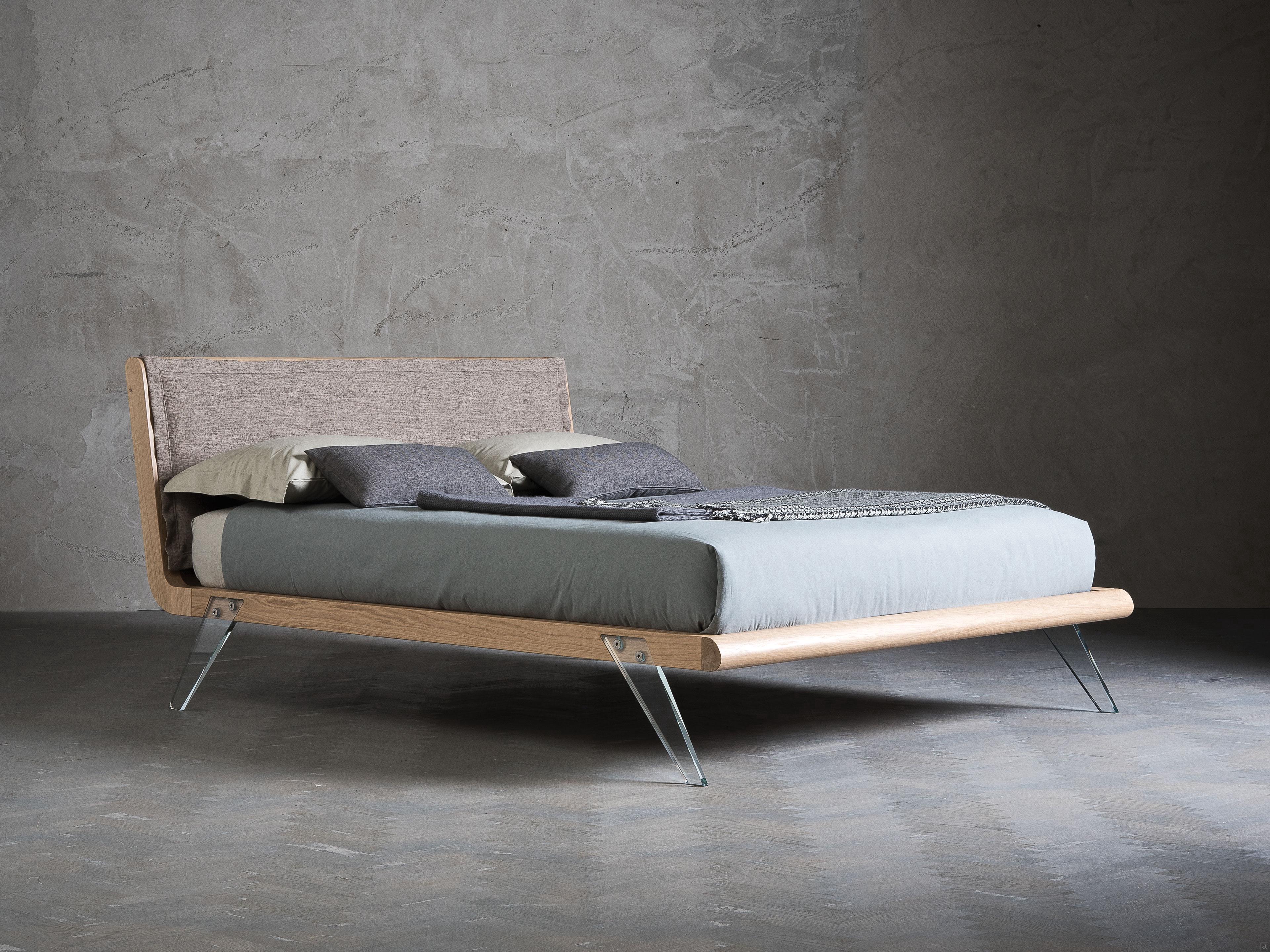 Pieds : en bois de chêne massif, cm h. 27 sp.6, ou en verre extra-clair, cm h.27 sp.1,9. La plaque de verre du lit suspendu, également en verre transparent extra-clair, d'une hauteur de 27 cm, a une épaisseur de 1,5 cm.
