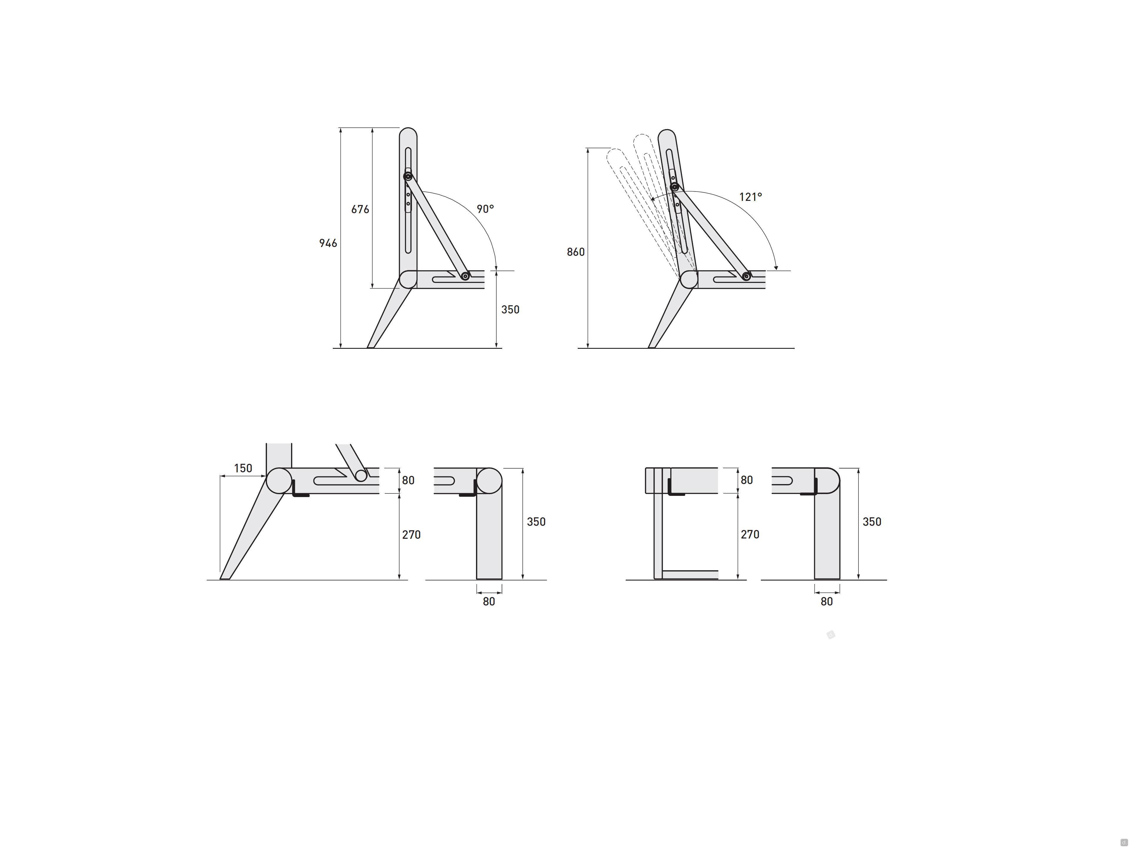 Réglable par mécanisme manuel, avec une inclinaison variable de 90° à 121°, de sorte que la hauteur varie d'un minimum de H.86 cm à un maximum de H.94,6 cm.