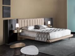 Mirage de Cantori est un lit matrimonial avec étagères latérales et revêtement en tissu, velours, simili cuir ou cuir.L'élément le caractérisant est représenté par ses ailettes latérales en bois légèrement incurvé vers l'intérieur pour créer un effet enveloppant. Les ailettes sont fraisées verticalement pour pouvoir insérer des étagères qui servent de table de chevet, disponible en deux modèles: simple ou avec rangement. L'étagère simple se déplace horizontalement pour pouvoir se positionner au-dessus du lit ou plus latéralement. Le rangement apparait après rotation du couvercle.