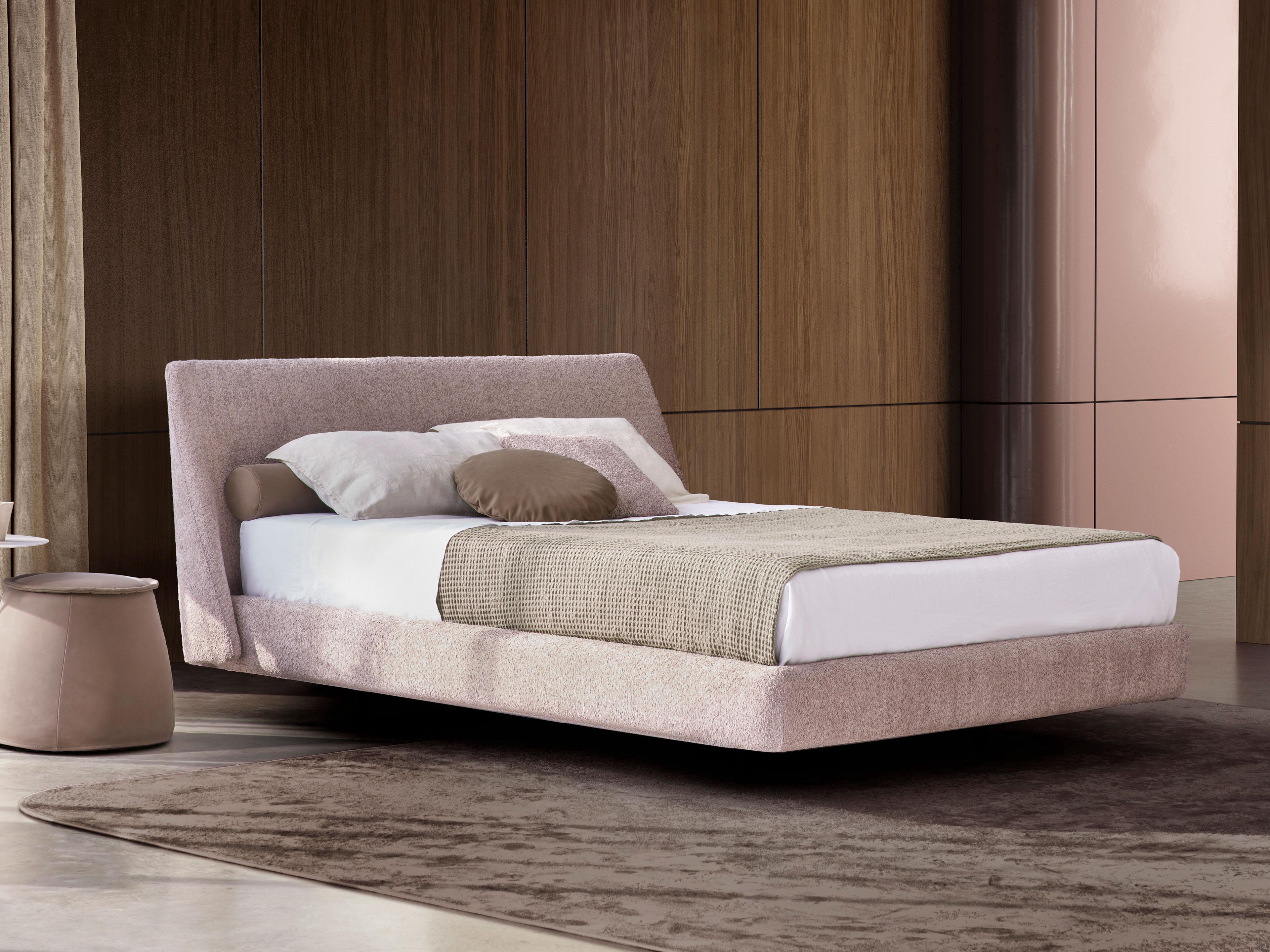 La tête de lit est rembourrée, légèrement inclinée vers l'arrière et incurvée latéralement en deux petites ailes qui embrassent le cadre du lit.