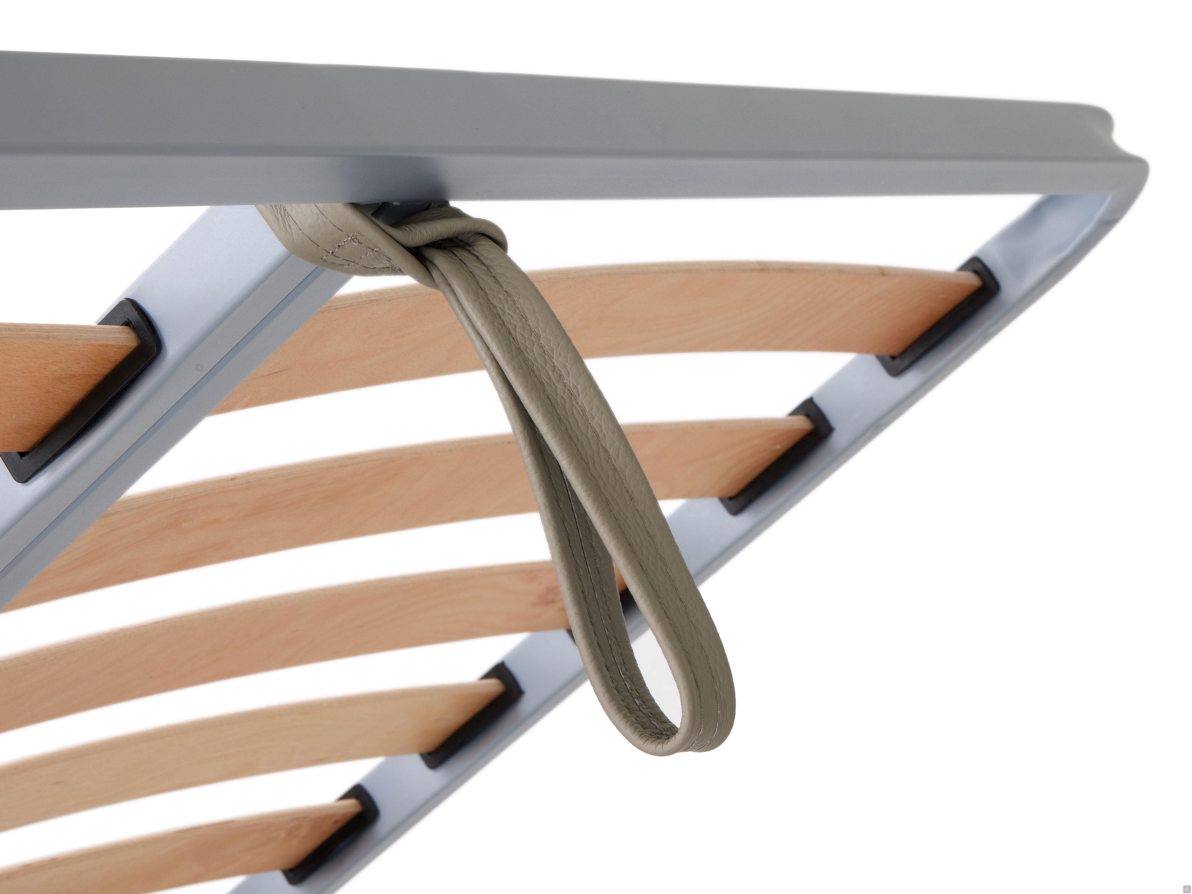 Sommier : 13 lattes de bouleau de chaque côté, classe E1, avec supports anti-grincement ; cadre en acier de 40x30 mm peint avec des poudres époxy non toxiques. Disponible en version divisible et avec des curseurs pour le réglage de la rigidité de la zone lombaire. Pour le format 200x200 cm, le sommier Deluxe est fourni en standard : 14 lattes de bouleau de chaque côté, classe E1, avec supports anti-grincement et curseurs pour le réglage de la rigidité dans la région lombaire de série ; cadre en acier de 50x30 mm peint avec des poudres époxy non toxiques. En cas d'option de sommier divisible, le lit est toujours équipé d'un sommier standard.