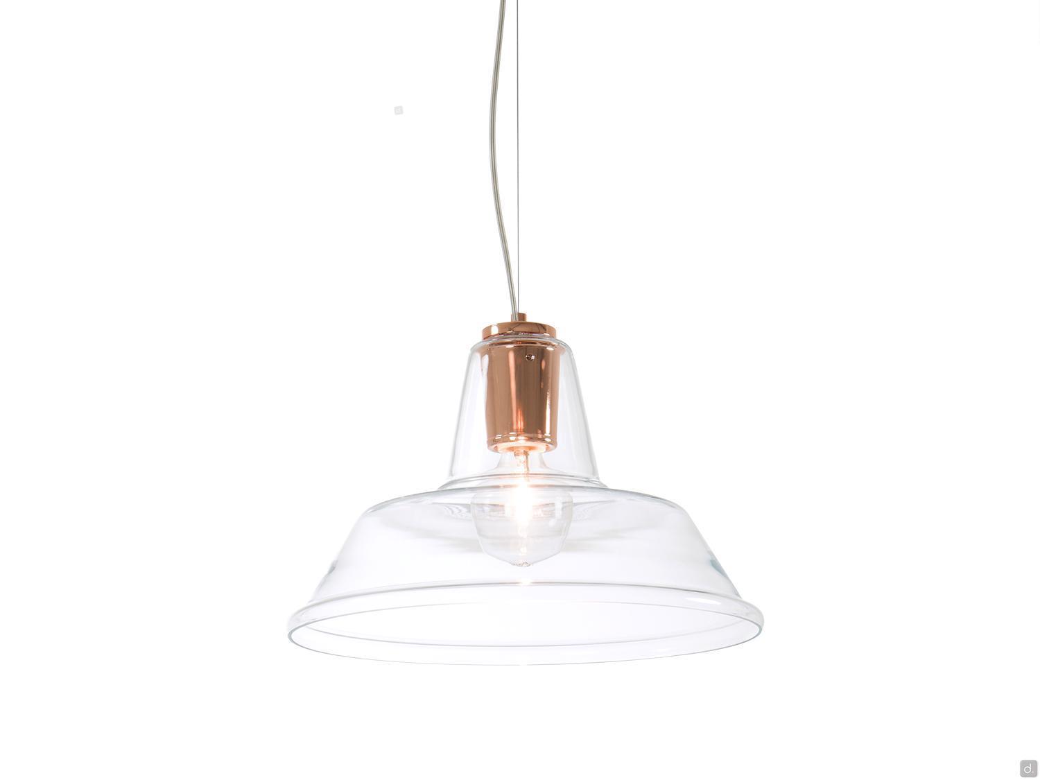 Le luminaire à suspension style industriel Lagoon dispose d'un diffuseur en verre soufflé à l'aspect vintage. Sa forme iconique nous rappelle les lampes utilisées dans les bateaux de pêcheurs; les détails en métal chromé ou en cuivre réussissent à revisiter la lampe pour un style modernisé. Avec un design contemporain métropolitain, Lagoon trouve facilement sa place au-dessus de tables rustiques, de plans de travail, dans des bars ou bien des intérieurs contract.