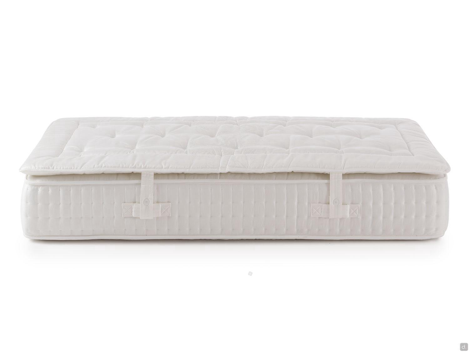 Topper (surmatelas): d'une hauteur de 5 cm et matelassé, il est placé sur le matelas et offre une commodité maximale et un confort absolu. Fabriqué en tissu Jacquard finement décoré, il est rempli de fibres hypoallergéniques respirantes. Le surmatelas reste stable grâce aux bandes de tissu boutonnées aux poignées périmétriques. Nettoyage à sec.
