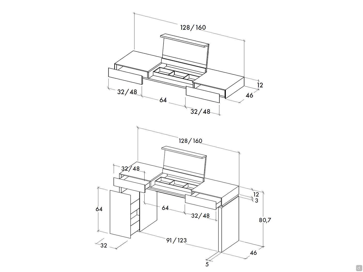 versions coiffeuse suspendue avec tiroirs ou sur pied avec tiroirs supérieurs et coulissant inférieur à 2 compartiments