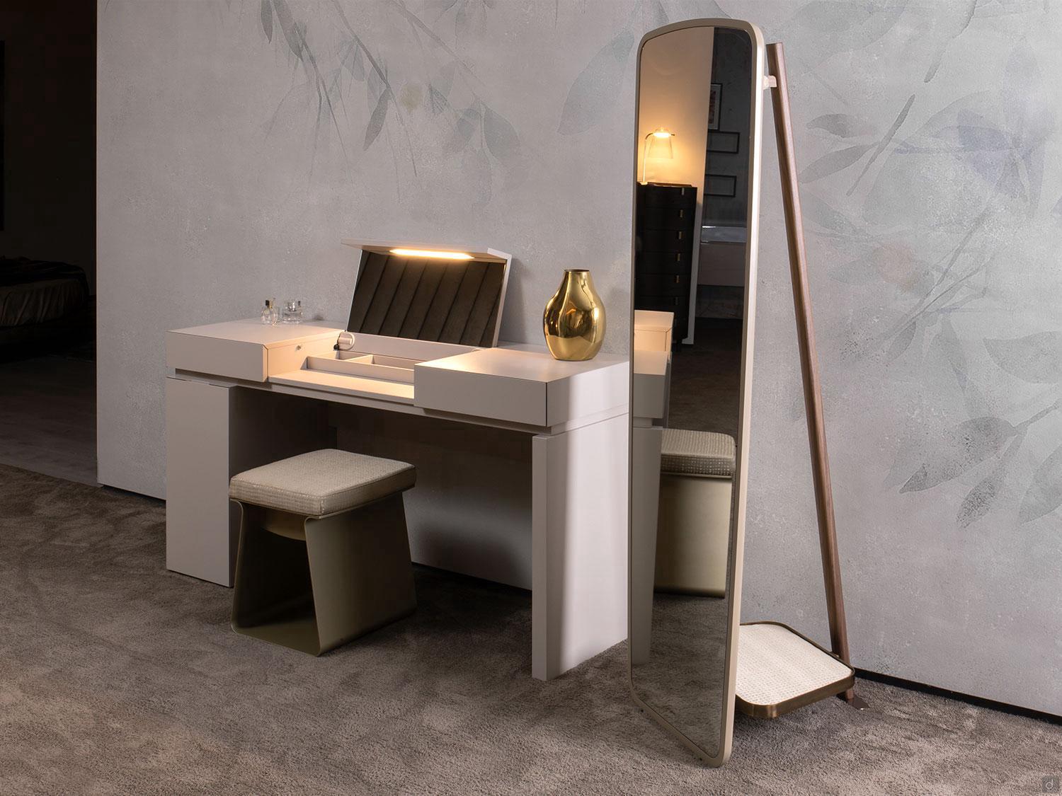 Nebula est un meuble coiffeuse moderne design avec tiroirs et coin maquillage disponible en deux tailles, sur pieds ou suspendu avec fixation murale. Le coin make-up est équipé d'un miroir, d'une lumière LED et de compartiments internes pour les bijoux en finition laquée mate et agrémentés d'un fond recouvert de cuir dans les coloris corde ou marron foncé. Le modèle sur pied du meuble coiffeuse maquilleuse est orné d'un bandeau délicatement encastré entre le plateau avec tiroirs et coin maquillage et la partie inférieure du meuble avec son tiroir vertical à deux compartiments.