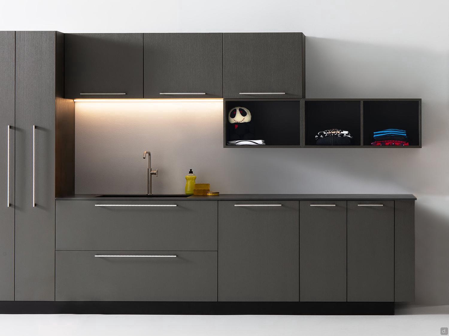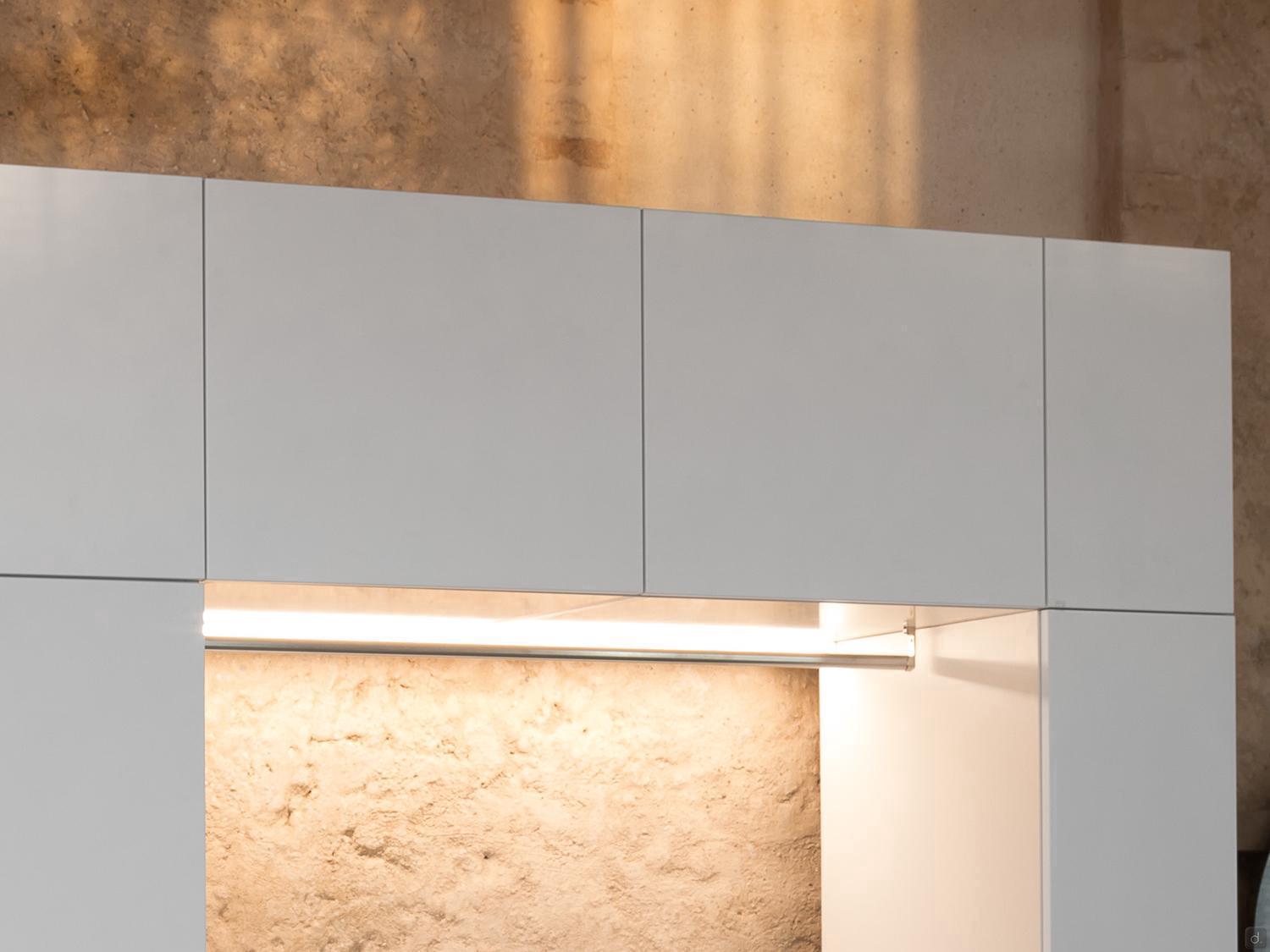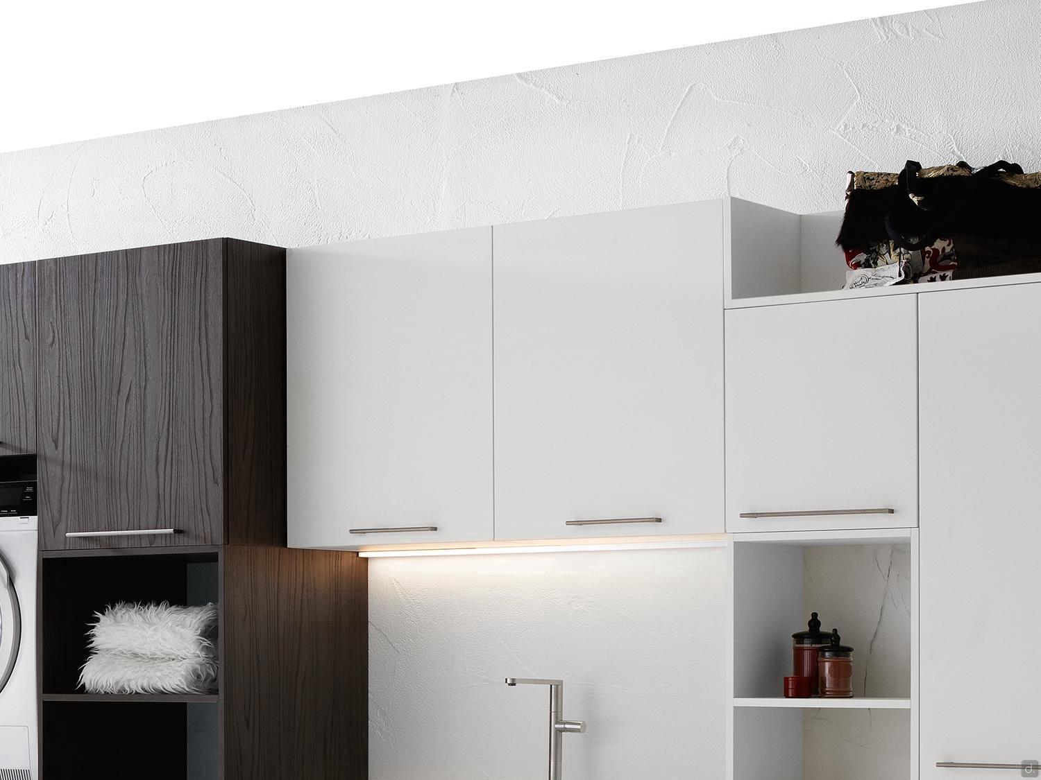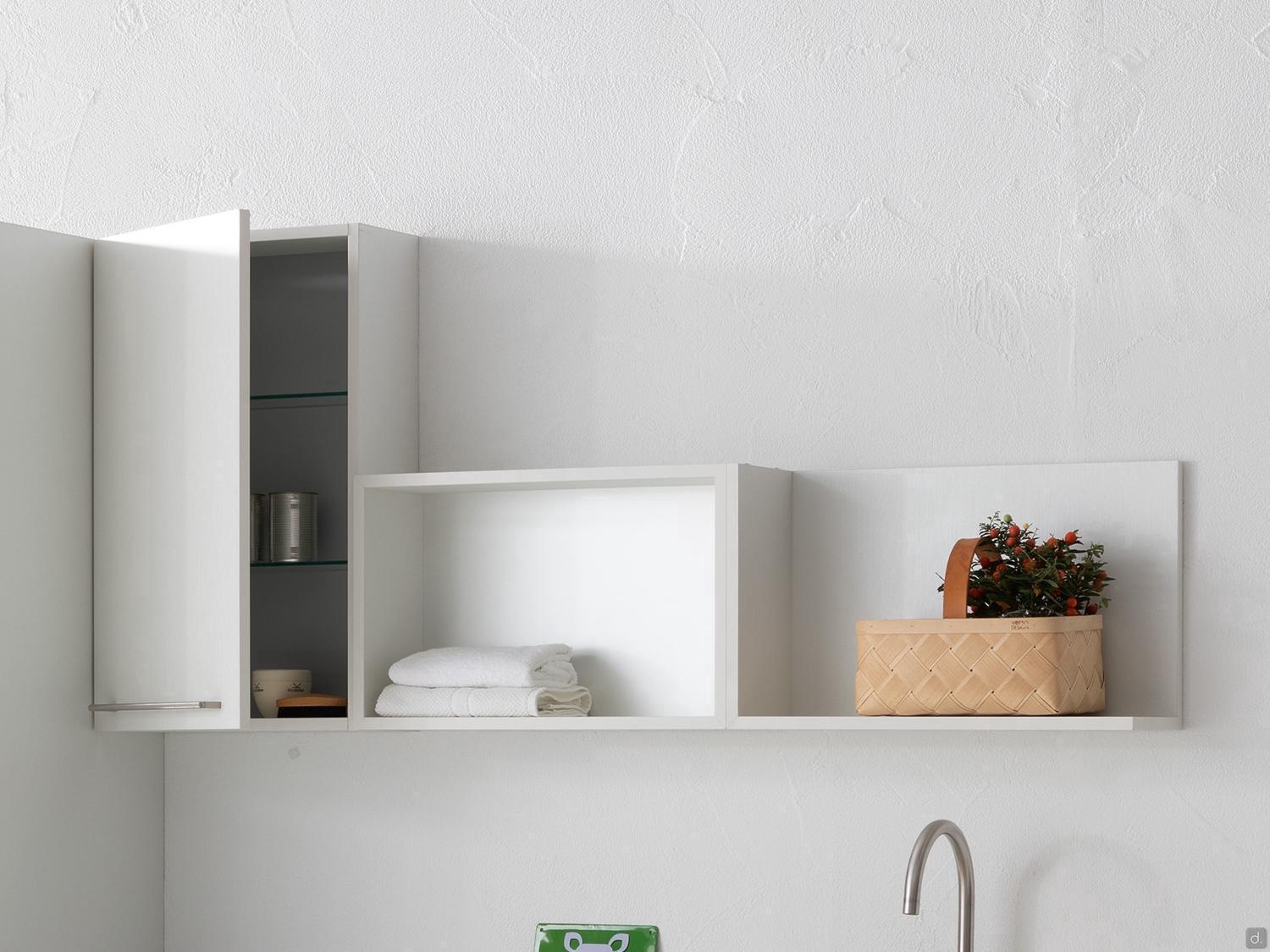Oasis est un meuble haut de buanderie suspendu avec des portes battantes ou à abattant qui s'ouvrent vers le haut. Les cabinets sont disponibles en 6 largeurs - d'un minimum de 30 cm à un maximum de 90 cm - et en 5 profondeurs : 20,8, 37, 50, 62 et 67 cm.En complément des rangements muraux avec étagères internes, Oasis comprend, dans la version avec une largeur de 60 cm, une hauteur de 75 cm et une profondeur de 37 cm, l'étagère coulissante "i-move", un mécanisme pratique qui permet de déployer complètement l'étagère d'un seul geste. Cela permet d'abaisser les étagères à une hauteur ergonomique et pratique pour prendre et ranger les détergents stockés à l'intérieur de l'unité murale.