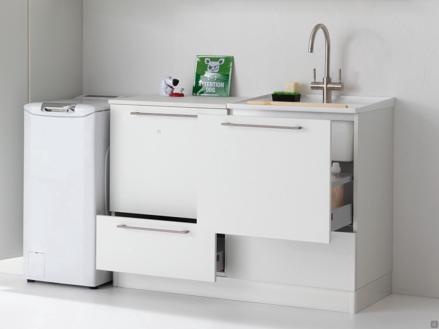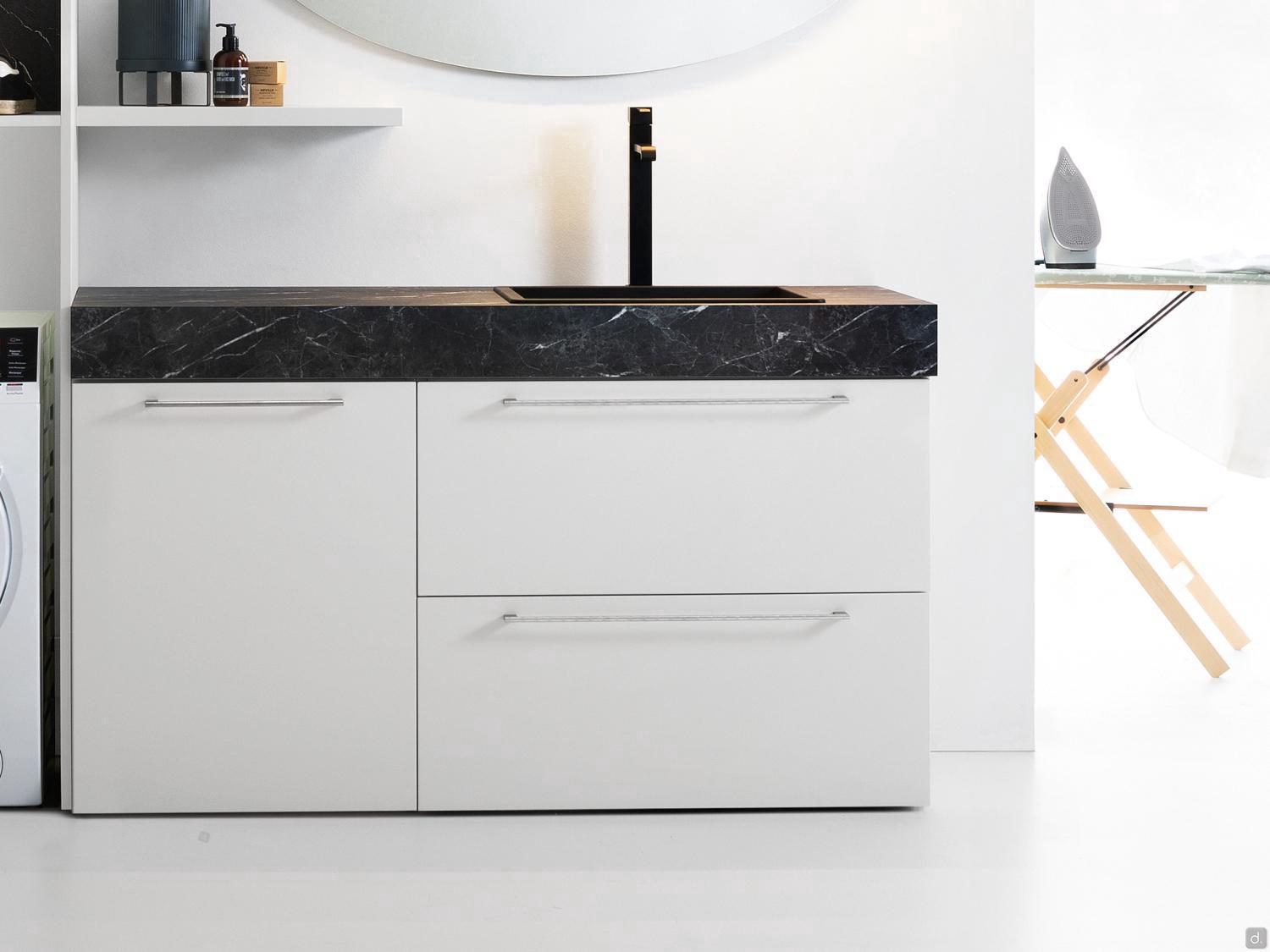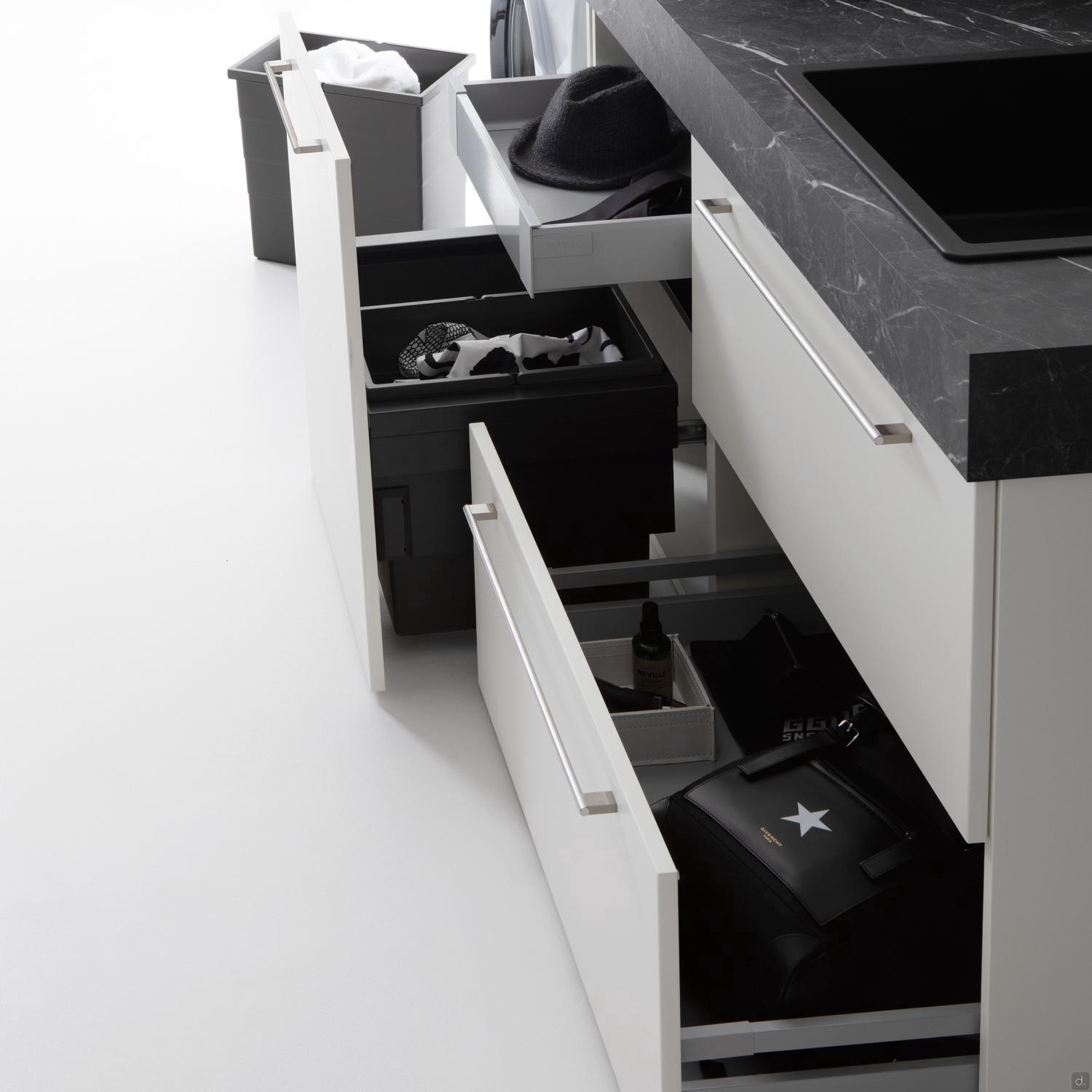 Tiroirs: équipés d'une structure métallique avec glissières à extension totale et fermeture ralentie. Les tiroirs sous lavabo sont profilés pour permettre le passage des tuyaux d'évacuation.