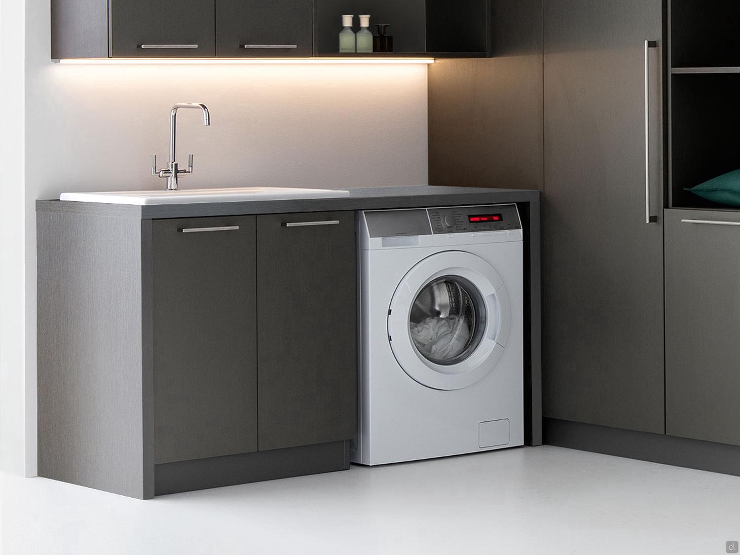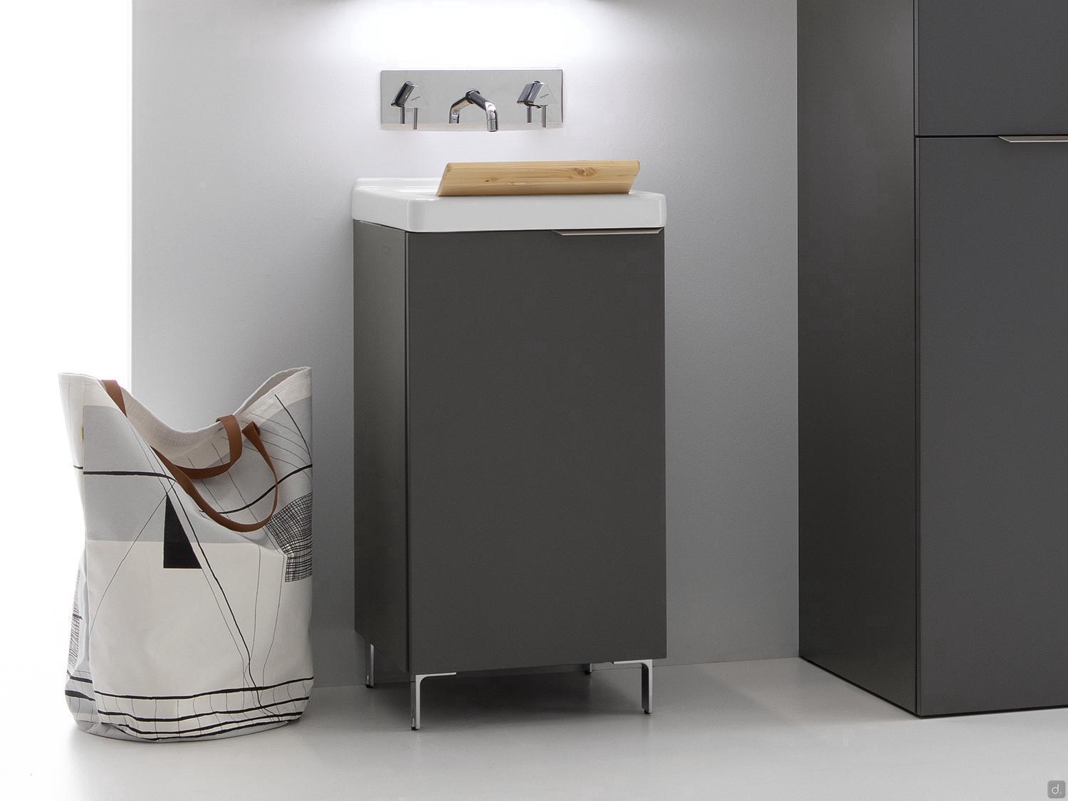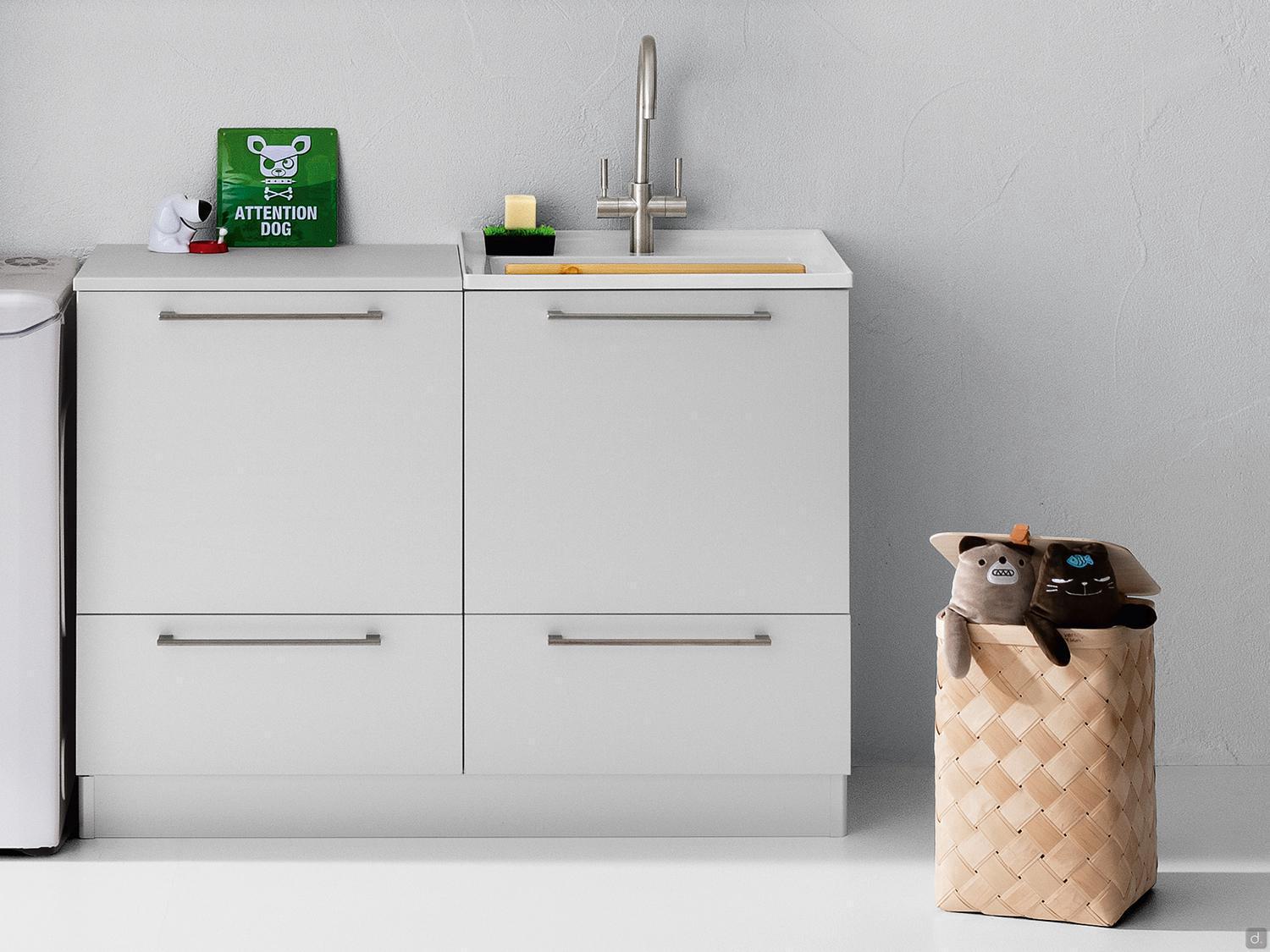 Tiroirs: équipés d'une structure métallique avec glissières à extension totale et fermeture ralentie. Les tiroirs sous lavabo sont profilés pour permettre le passage des tuyaux d'évacuation.