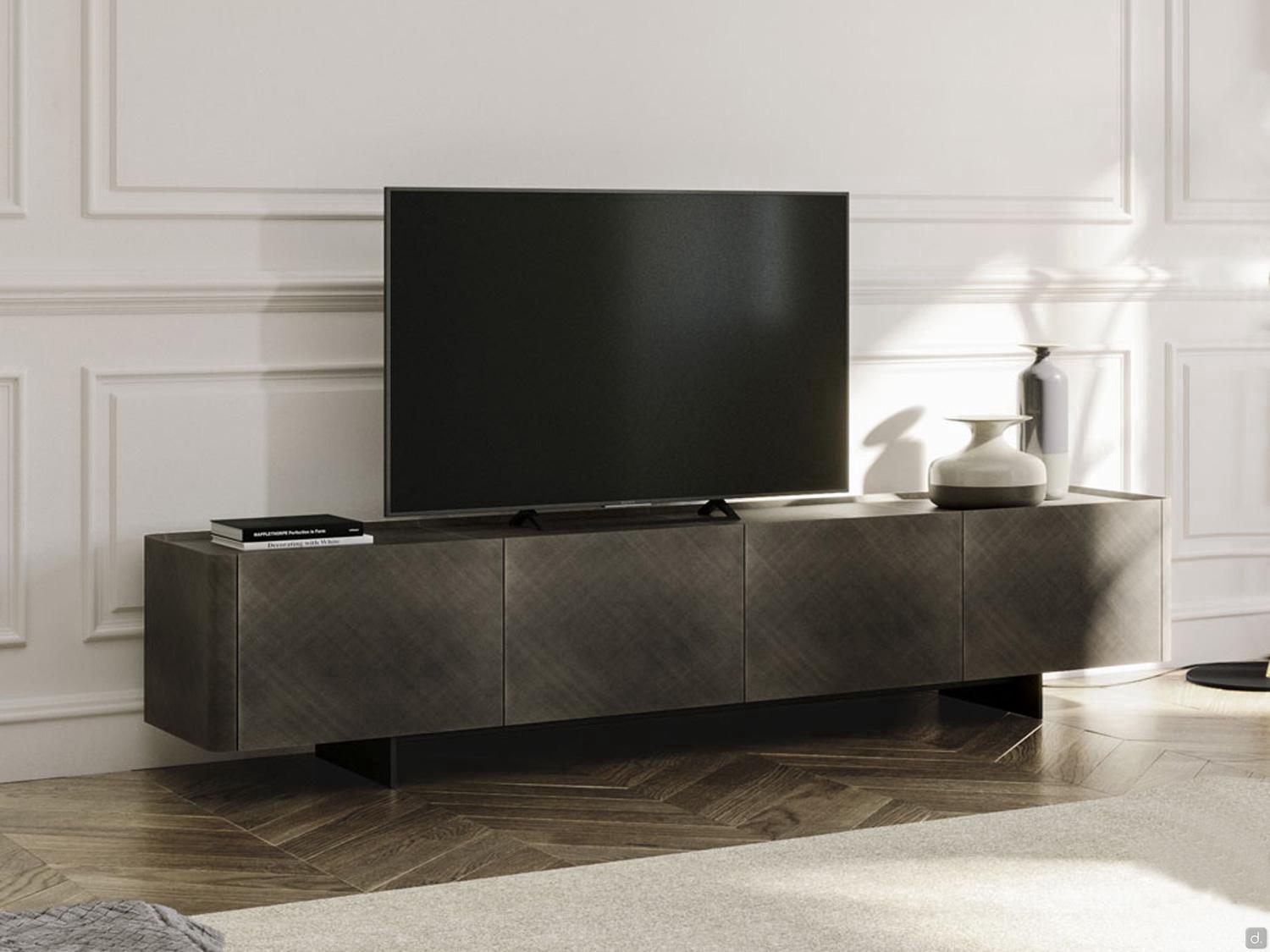 Maia est un meuble TV moderne 4 portes avec pieds en métal peint en noir, proposé avec une structure et des portes en laqué mat, bronze brossé ou avec revêtement en simili-cuir ou cuir, en version lisse ou capitonnée. Le plateau, en revanche est proposé dans les matériaux suivants: plaqué bois de frêne teinté dans les finitions Noyer Canaletto, Frêne Noir ou Brun foncé; ou en céramique disponible dans les couleurs suivantes: laqué mat anthracite et titane ou encore en bronze brossé.Idéalement associé au buffet Maia de la même famille pour meubler des espaces modernes et élégants, le meuble TV Maia s'adapte aux contextes les plus divers grâce aux nombreuses combinaisons possibles de finitions et de revêtements.