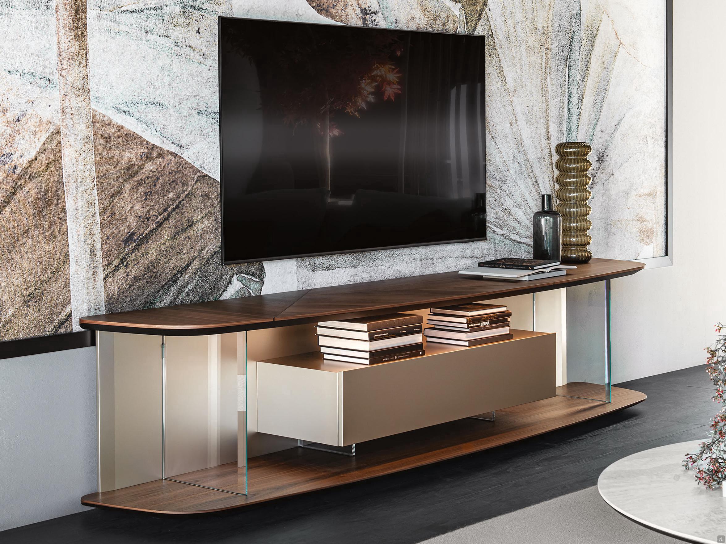 Altavista est un meuble TV en bois de 60 cm de haut, disponible en deux largeurs, 230 et 270 cm, parfaitement capable d'accueillir des téléviseurs de plus de 80 pouces. La structure est composée de deux plateaux, le premier et le second, en noyer Canaletto ou en chêne rouvre, ornés de détails contrastés. Les deux étagères renferment, dans la partie centrale, le pratique conteneur escamotable, disponible en titane ou en bronze, coordonné avec le panneau arrière. Les côtés en verre biseauté transparent soutiennent délicatement le plateau, délimitant le compartiment central et laissant les parties latérales ouvertes. L'excellente gestion des espaces internes et externes de la structure offre une bonne capacité de rangement, fonctionnelle pour abriter des accessoires et des objets, et raffinée dans son esthétique pour la composition et le positionnement des compartiments. Le compartiment central ouvert est éclairé par le système d'éclairage LED réglable.