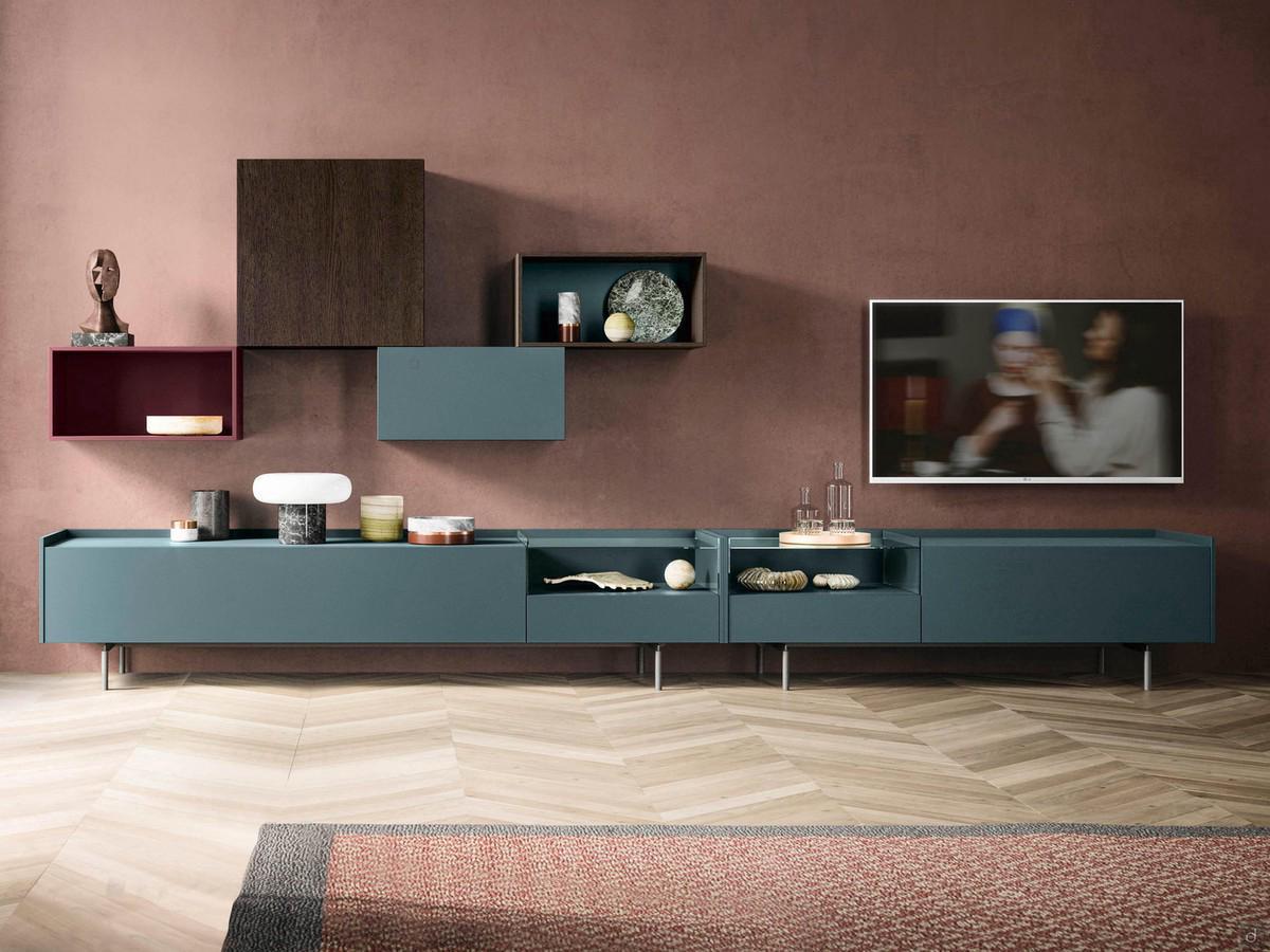 Le meuble TV avec pieds Kaen est doté d'un compartiment ouvert pratique avec une étagère supérieure en verre transparent. Les nombreux modèles disponibles permettent un haut degré de personnalisation avec des portes battantes, des portes à abattant, des petits et grands tiroirs.Kaen est disponible dans une large gamme de finitions en stratifié, essence bois et dans différentes laques mates, brillantes et micalisées. La base au design minimal offre une légèreté visuelle particulière à cet ensemble de salon.