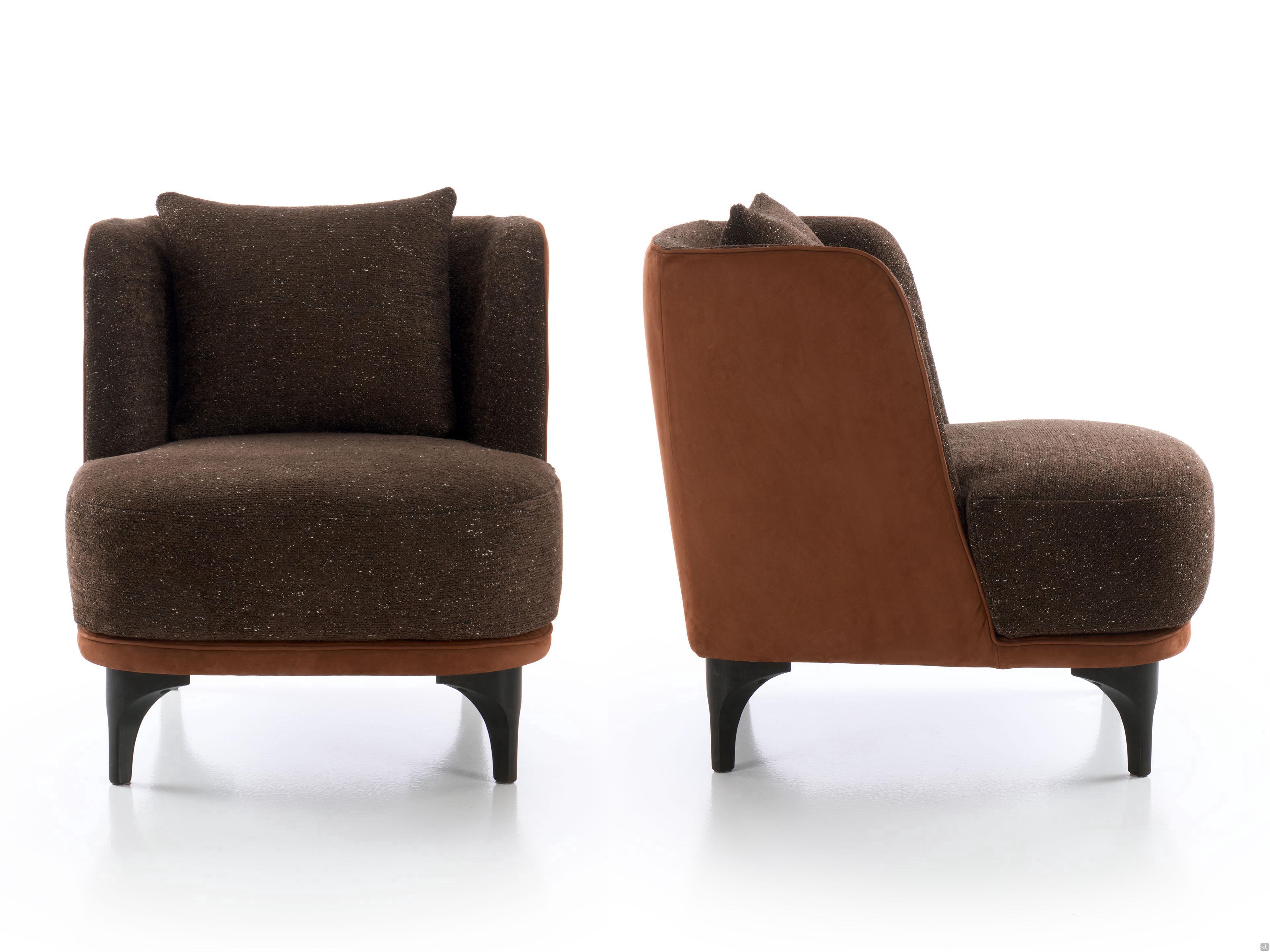 Amanda est un petit fauteuil bas sans accoudoirs aux proportions harmonieuses et compactes: avec seulement 70 cm de largeur, il est idéal pour un salon et plus précisément un coin lecture ou conversation, mais également pour un lieu de passage ou pour une chambre à coucher. Ses pieds hauts en bois foncé le soulèvent du sol et soutiennent une assise généreusement rembourrée et confortable, malgré les dimensions contenues. Le dossier bas est légèrement incurvé sur les cotés et muni d'un coussin lombaire en plumes.