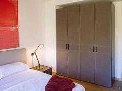 Di fronte alla libreria è presente una piccola nicchia a muro che abbiamo scelto di trasformare in guardaroba prevedendo un armadio a due ante laccato Grigio attrezzato internamente con ripiani e appendiabiti.