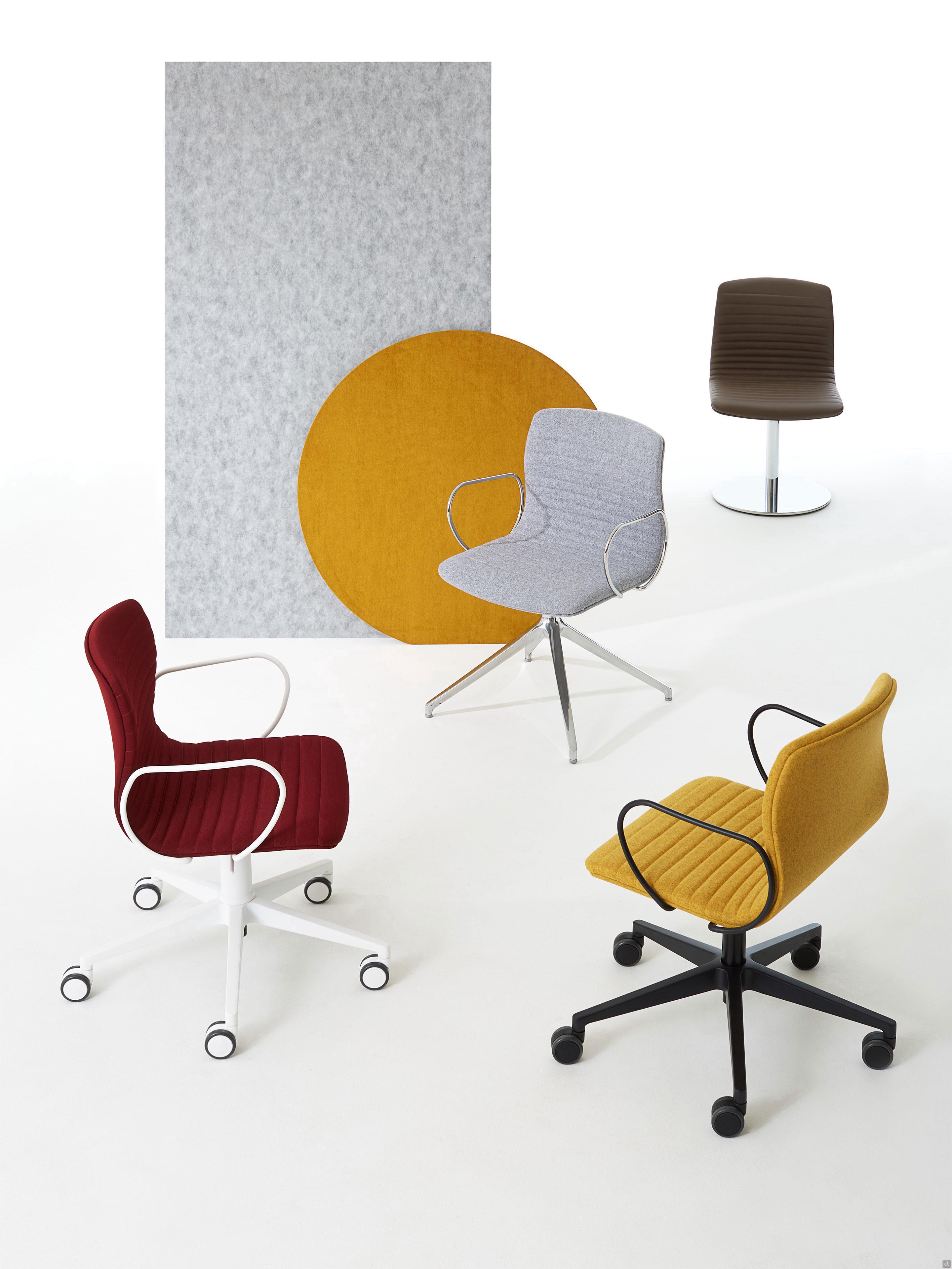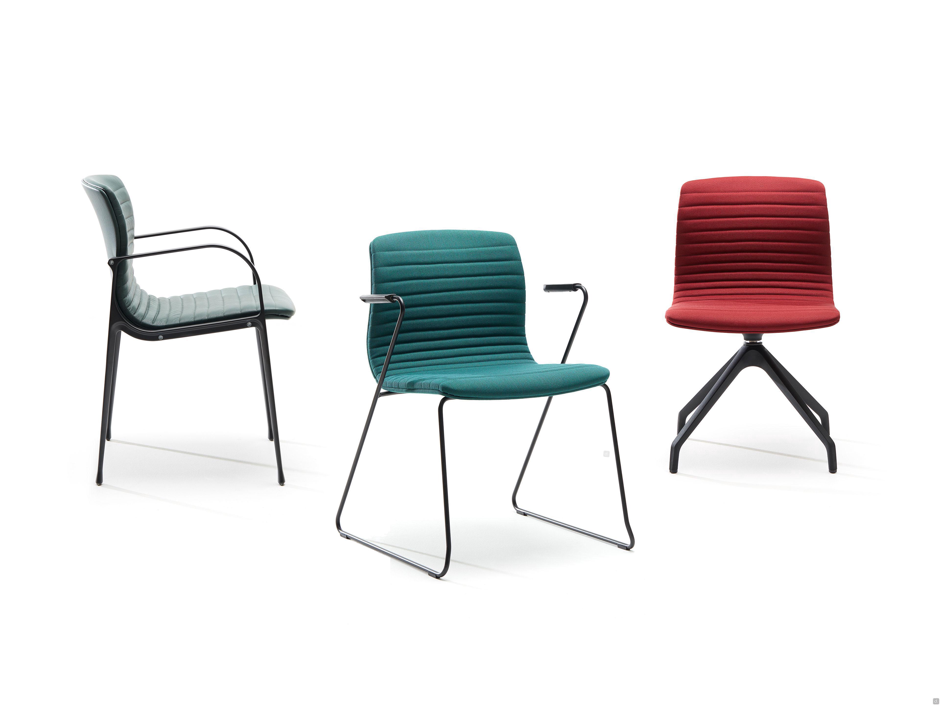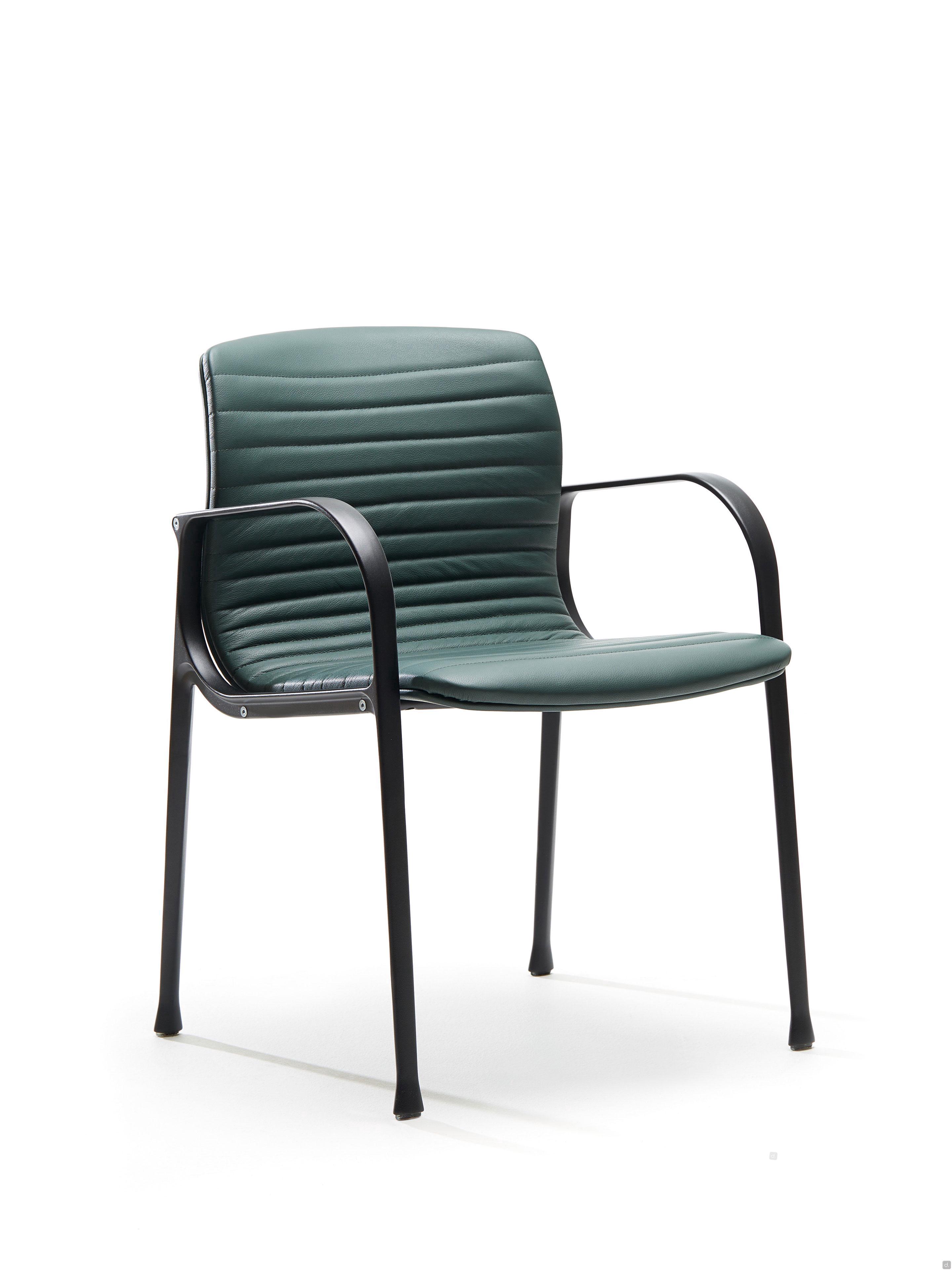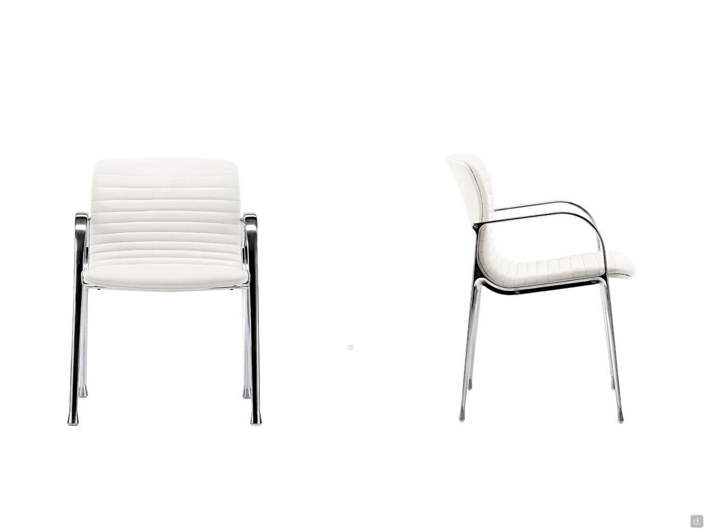 Mark est proposée pour hôte fixe avec pieds ou base en porte-à-faux, dans la version opérative avec dossier bas ou moyen et directionnel, complète d'accoudoirs fixes en tubulaire en métal ou aluminium en 4 finitions.
