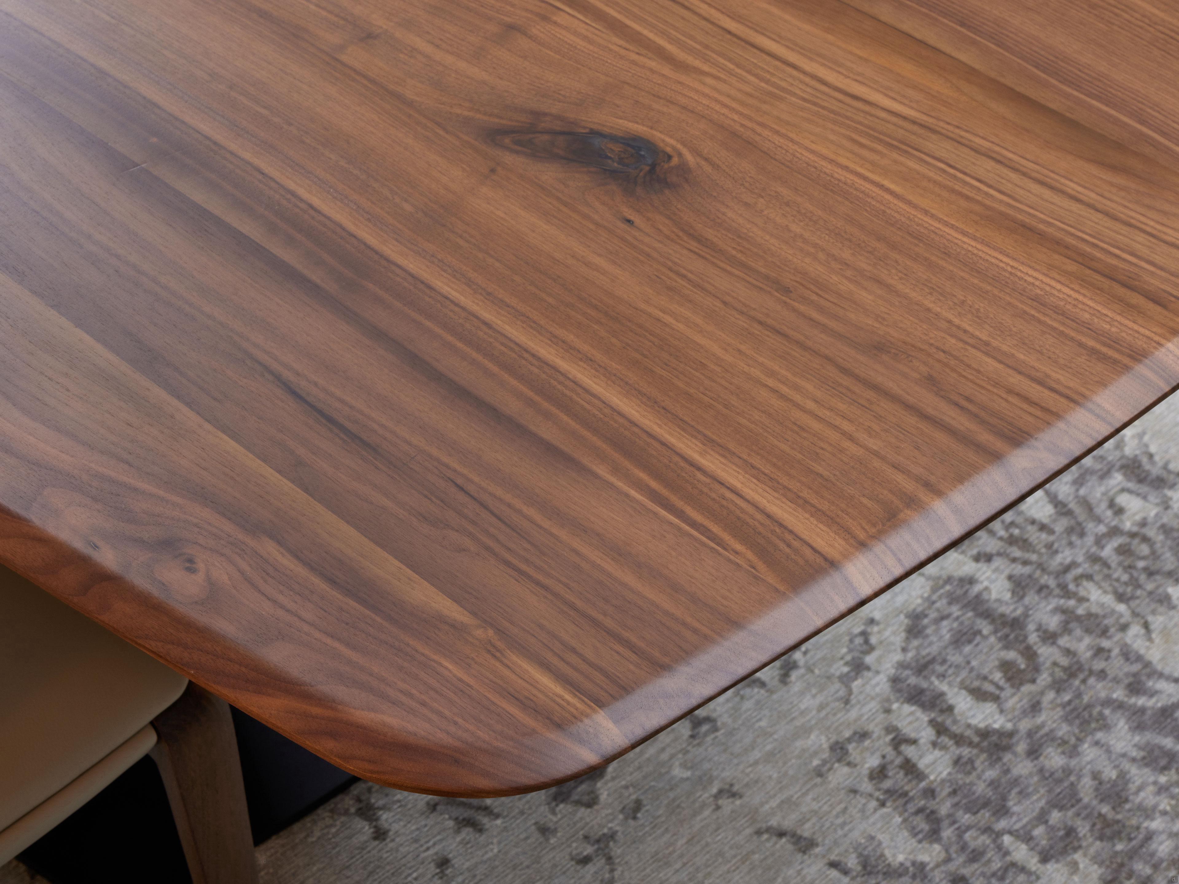 - 4 cm d'épaisseur avec des bords irréguliers en chêne européen massif sur les côtés longs avec une finition brossée ou plaquée / noyer massif sur les côtés longs avec une finition lisse, tous deux utilisant uniquement des colles vinyliques à base d'eau. Support en panneaux de particules avec placage 15/10 en haut et en bas.