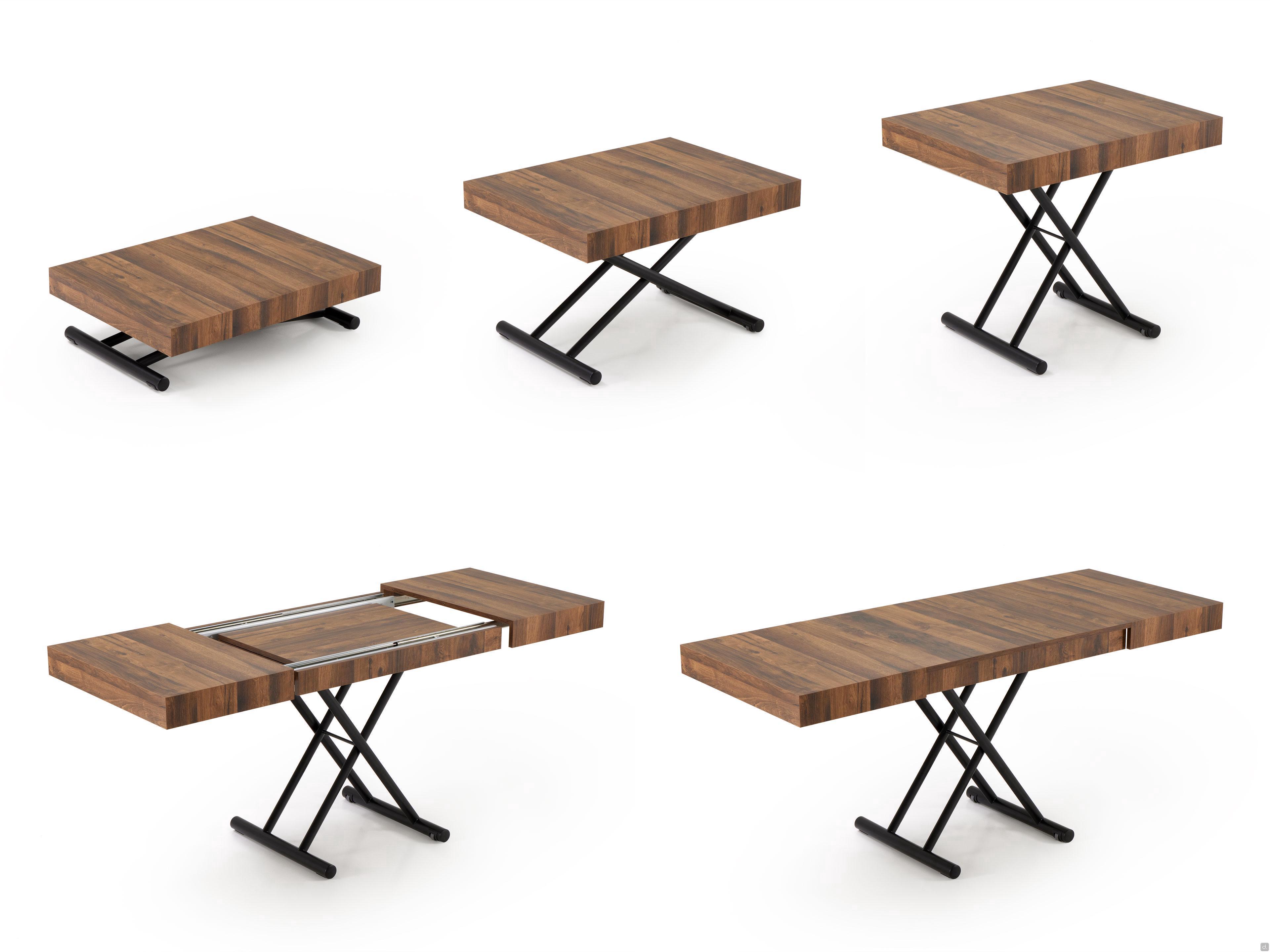 Dimensions- cm 95 (140 - 185) x 72; hauteur de 27 à 81 cm- 120 (170 - 220) x 80 cm; hauteur de 25 à 88 cm- 120 (170 - 220 - 270 - 320) x 80 cm; hauteur de 25 à 76 cmÉpaisseur plateau : 12 cm (uniquement pour plateau cm 95 x 72 : ép. cm 10)