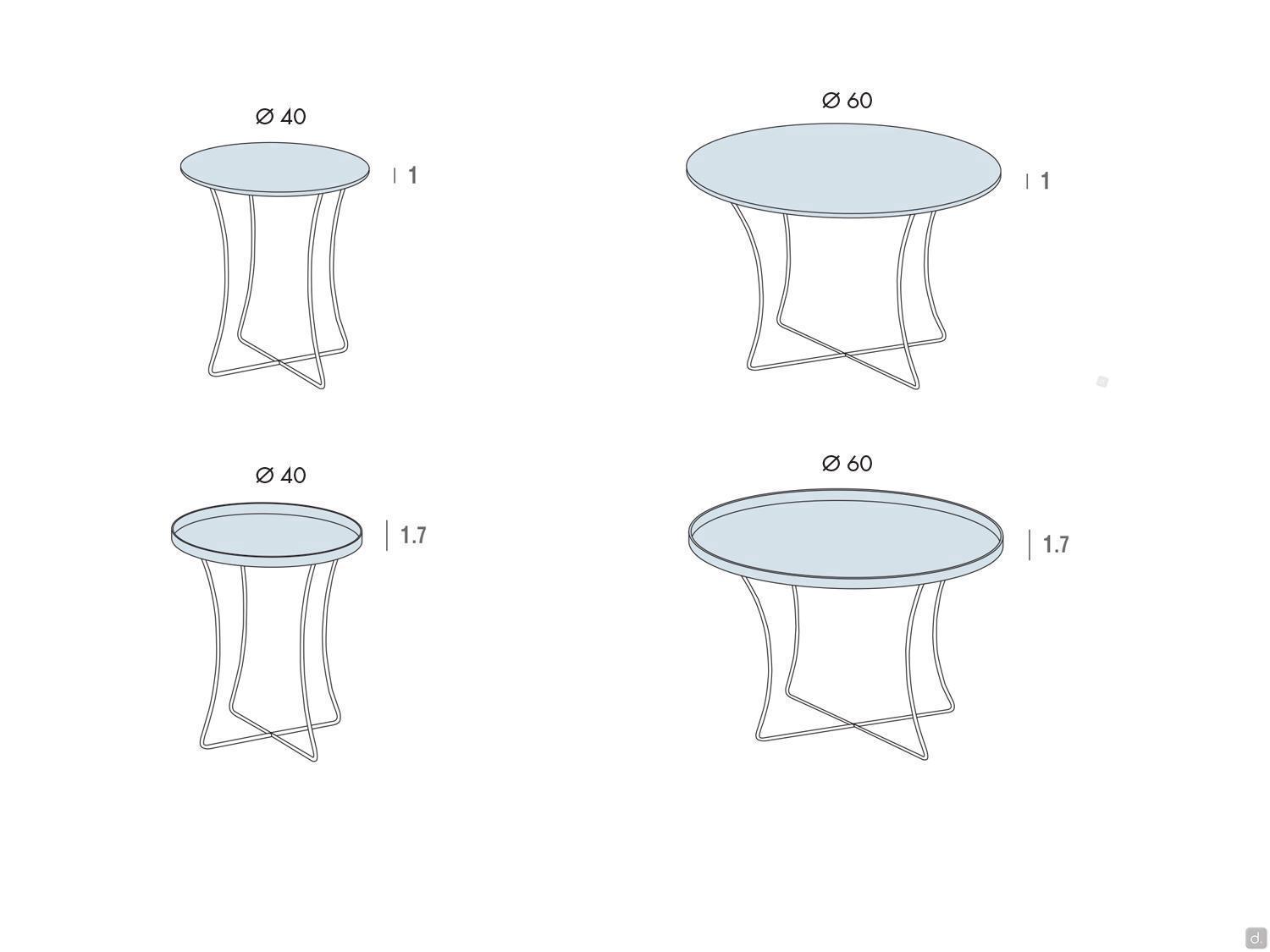 Modèle et Dimensions Ronde:- diamètre: Ø 40 / 60 cm- hauteur: H.46 / 36 cm- épaisseur plateau: ép.1 cm Ronde avec plateau:- diamètre: Ø 40 / 60 cm- hauteur: H.46,7 / 36,7 cm- épaisseur plateau: 1,7 cm
