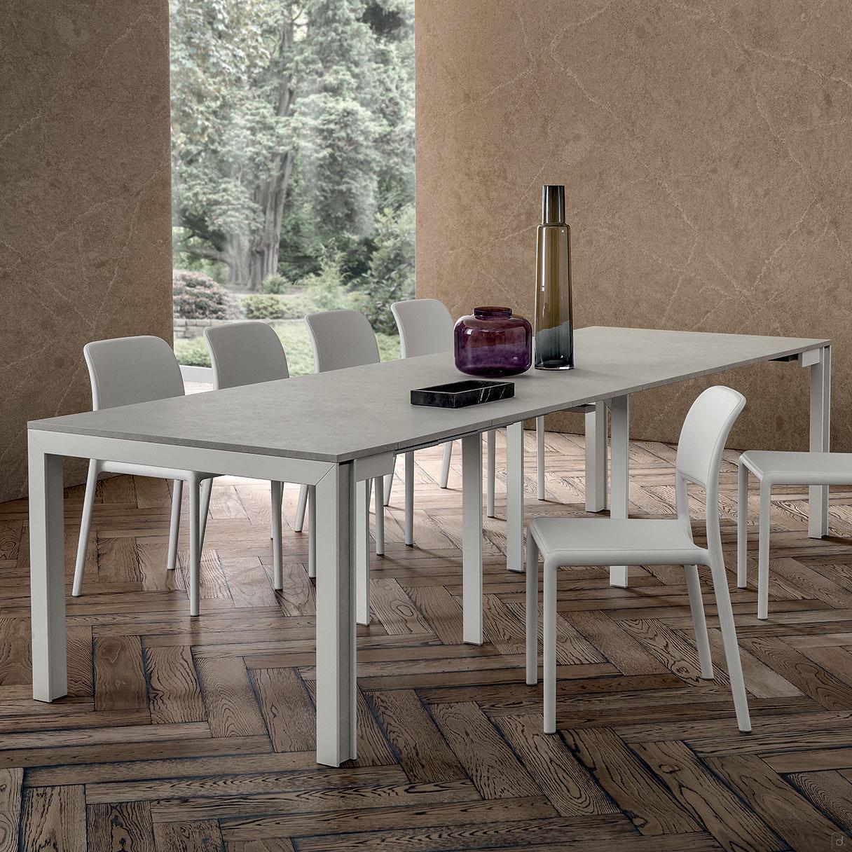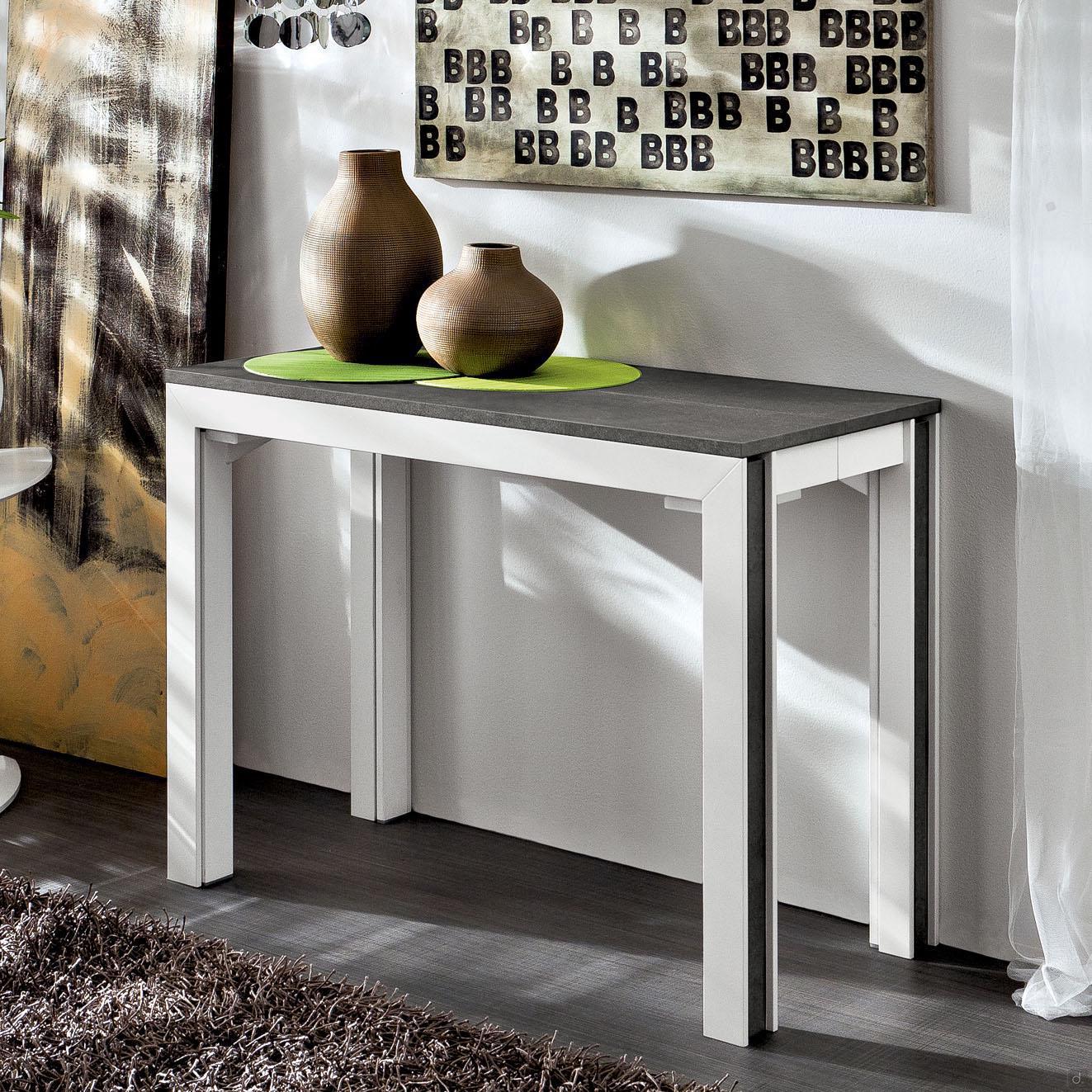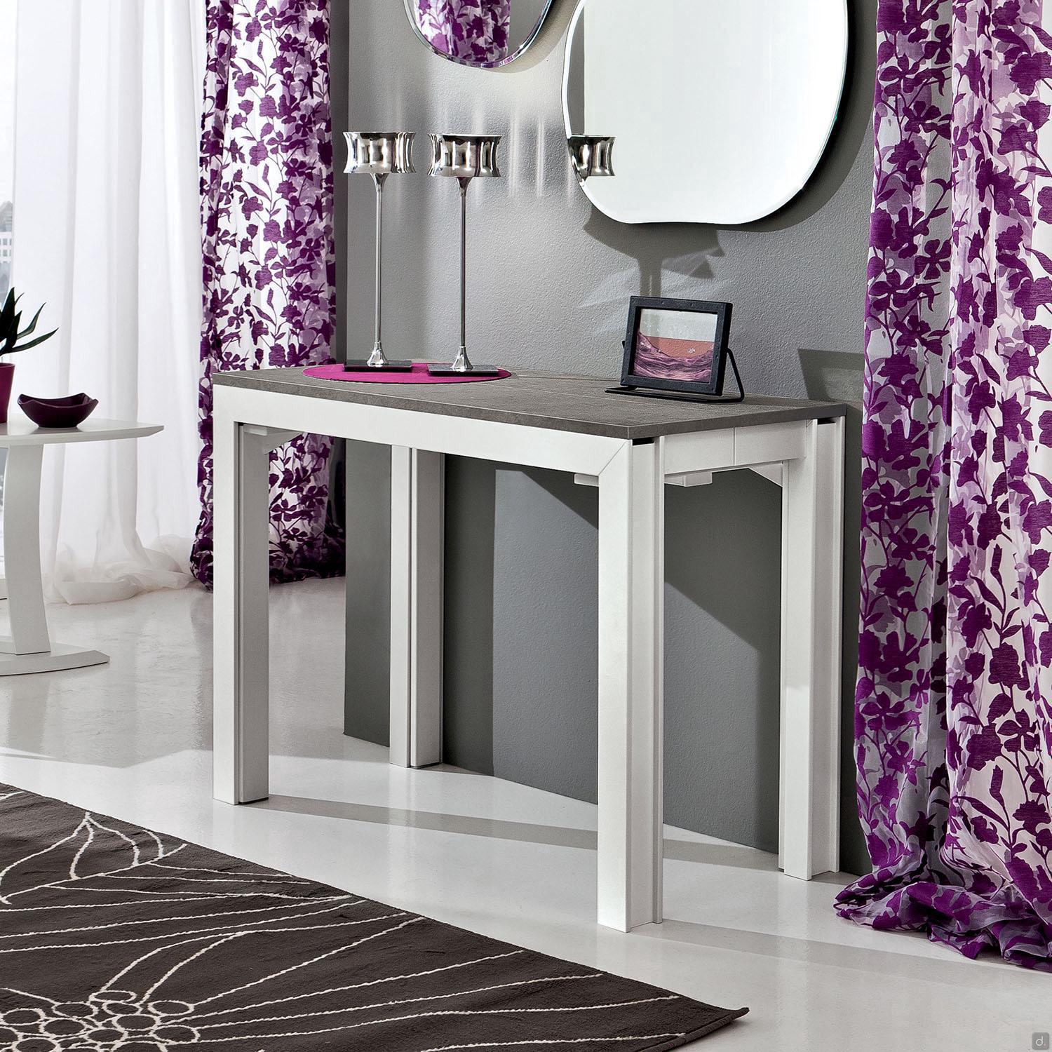 Cedric est une table console à rallonges jusqu'à 12 places, disponible avec 3 ou 6 rallonges. Le plateau est proposé en laminé HPL, un matériau hautement résistant, dans tous les coloris présents dans le nuancier de couleurs. La structure est réalisée en bois massif de hêtre laqué mat blanc avec des inserts latéraux en option en HPL assortis au plateau. Les rallonges, toujours de la même couleur que le plateau, sont fournies à part avec une cassette en polypropylène parfaite pour être rangée dans une armoire.Cedric est une console à rallonges parfaite pour meubler un espace aux dimensions contenues, à ouvrir si besoin pour accueillir de nombreuses convives.