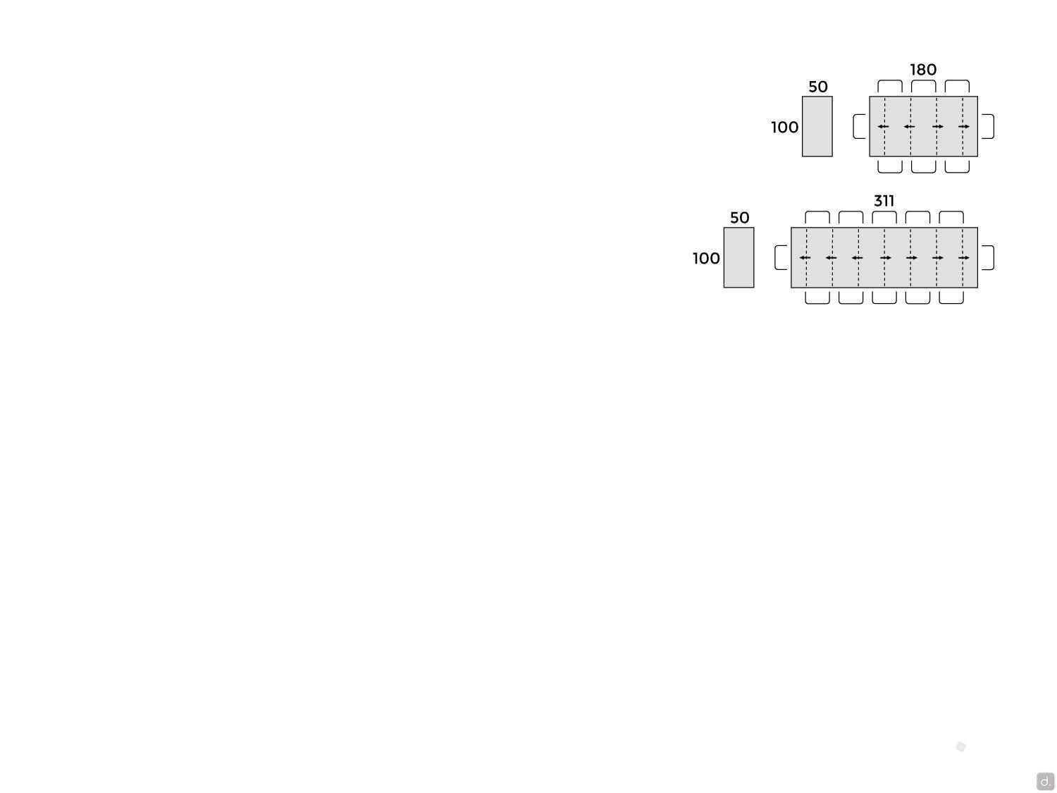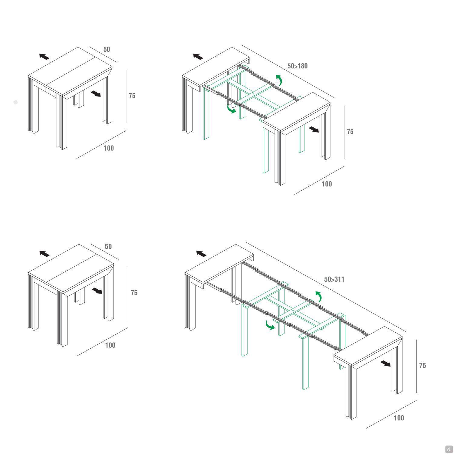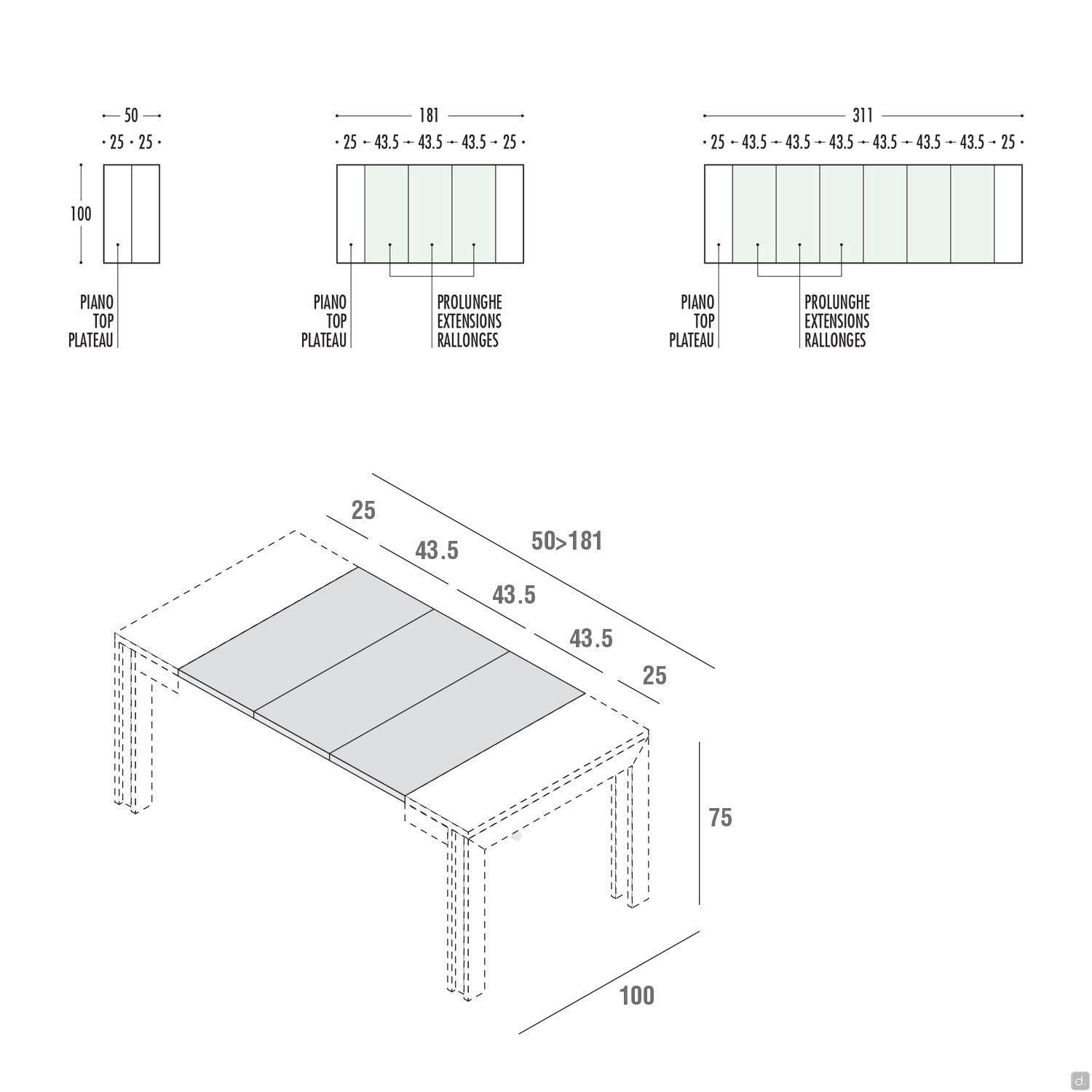 Info pour votre AchatDans le cas de finitions effet bois ou pierre il n'y a pas de continuité des veinures entre le plateau et les rallonges.Le modèle extensible de 100 cm P.50 (93,5 - 137 - 180) est fourni avec 3 rallonges de 43,5 cm chacune ; le modèle extensible de 100 cm P.50 (93,5 - 137 - 180 - 224 -267,5 - 311) est fourni avec 6 rallonges de 43,5 cm. Les jeux de rallonges assortis au plateau sont fournis avec une cassette de rangement.